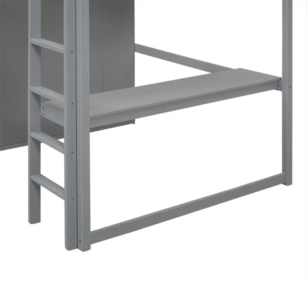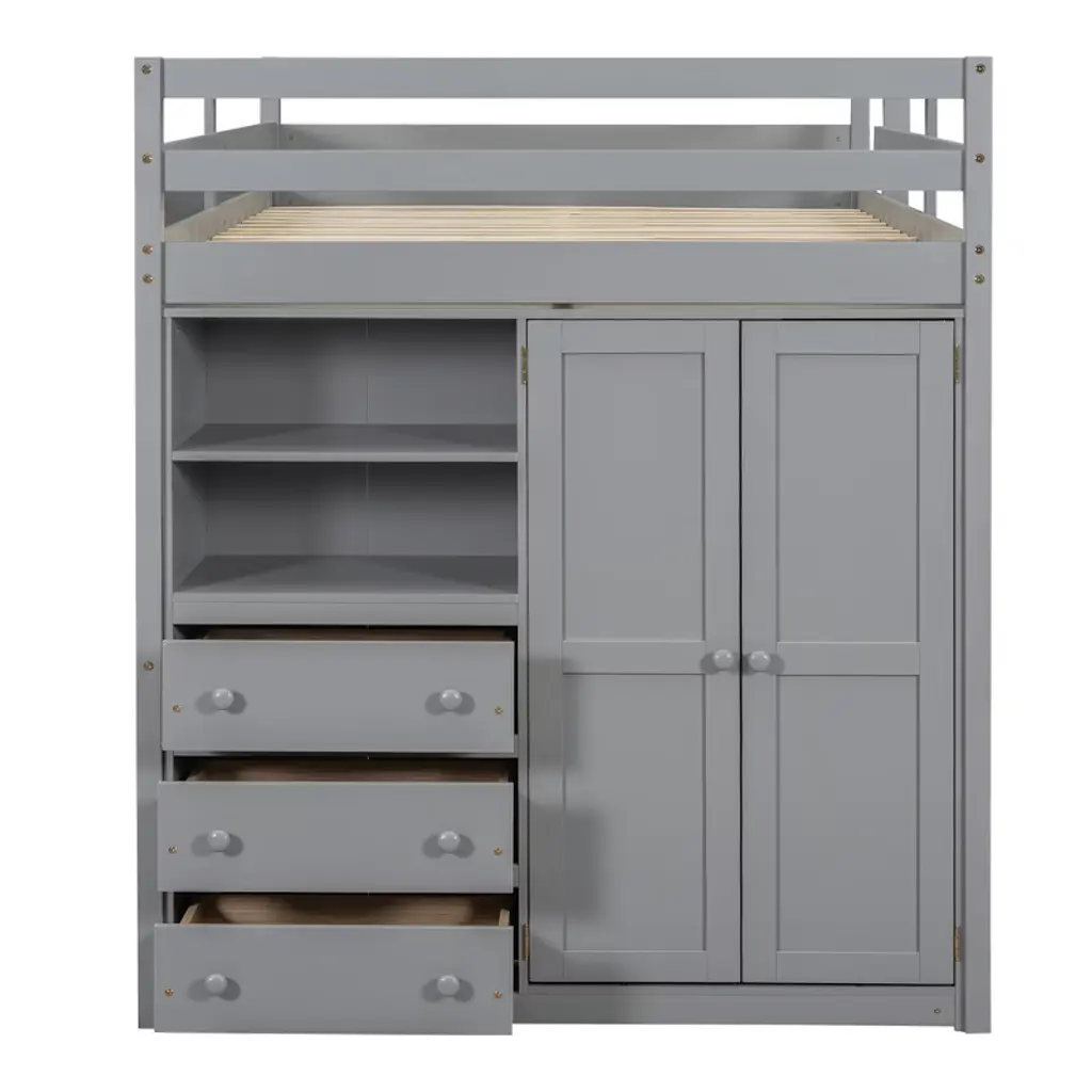 Aprilsoul Wood Full Size Loft Bed With Built-in Wardrobe, Desk, Storage Shelves And Drawers, Gray
