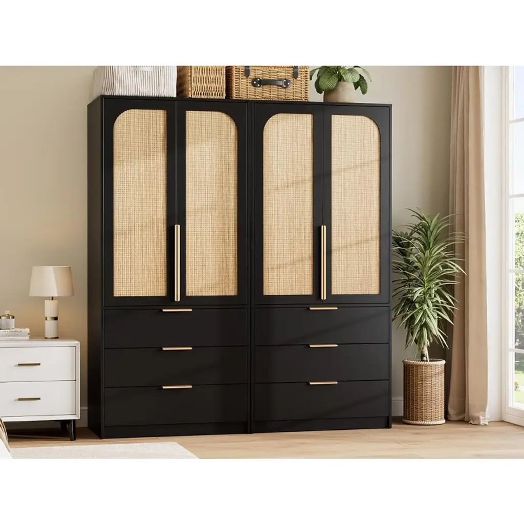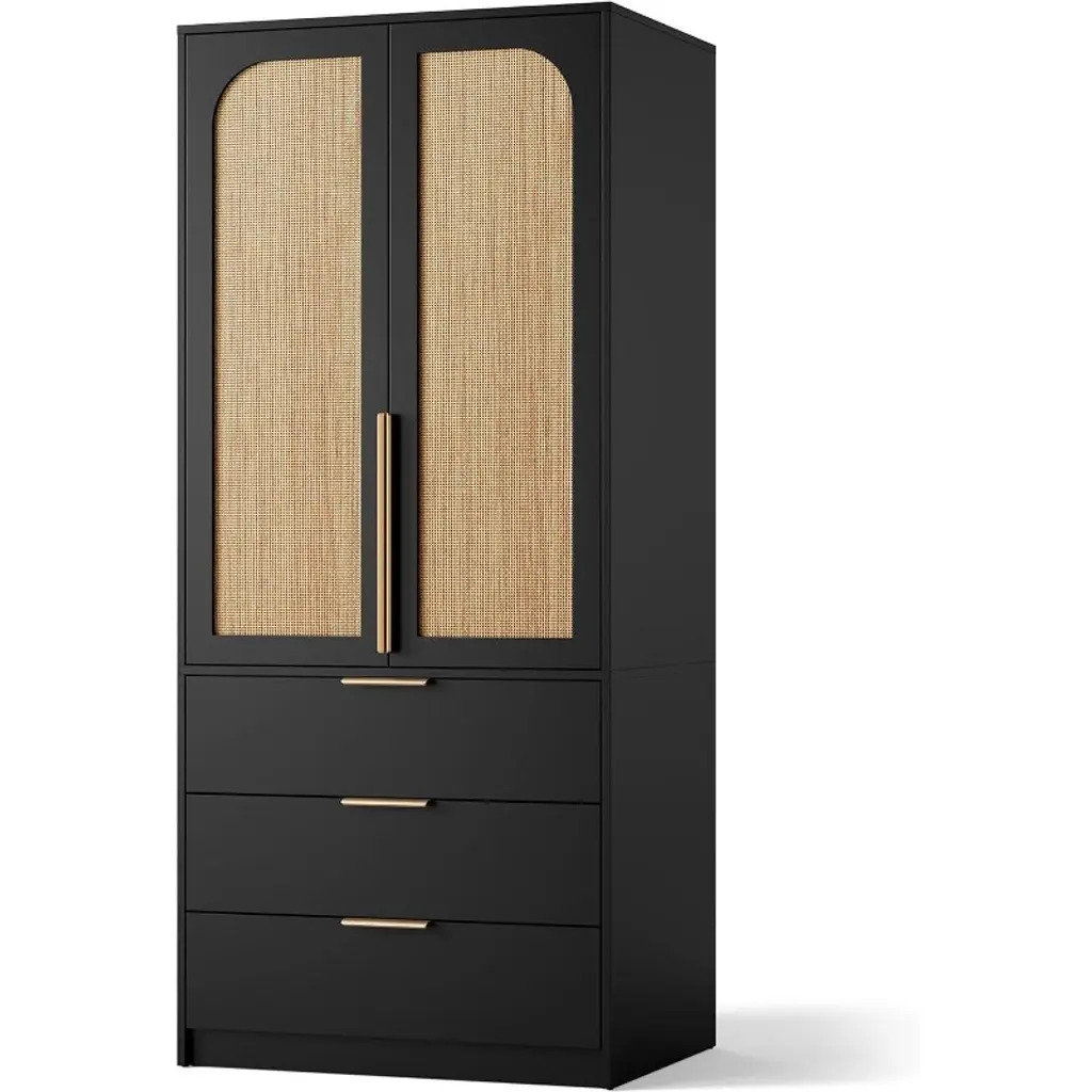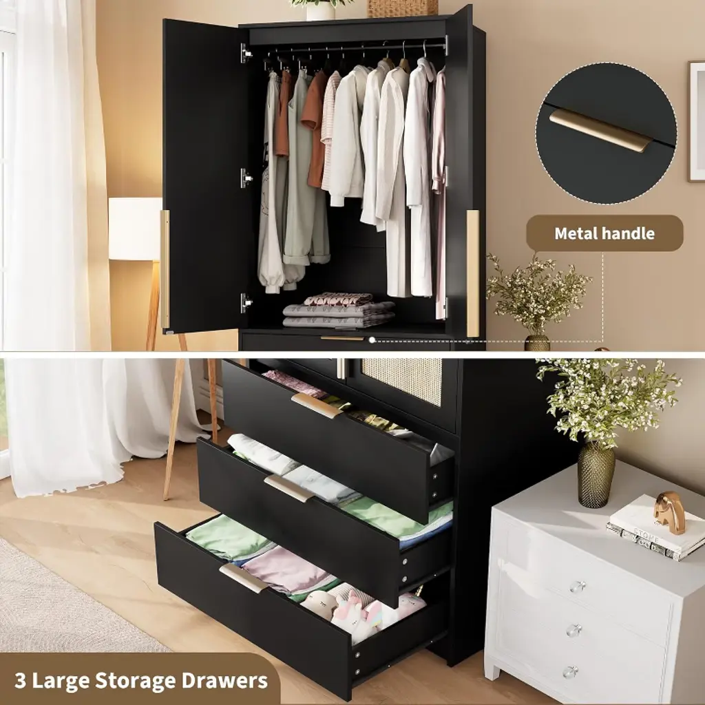Armoire Wardrobe Closet, 69.5" Wooden Wardrobe Cabinet With 3 Drawers, Hanging Rod,storage Cabinet For Bedroom, Large Capacity Storage, Rattan Door