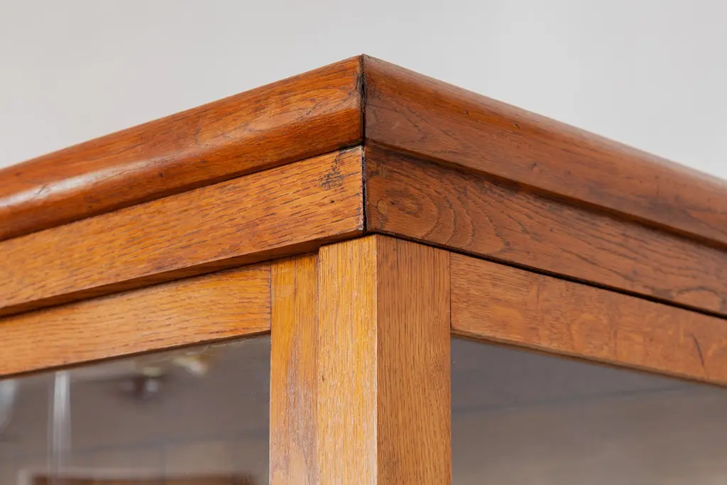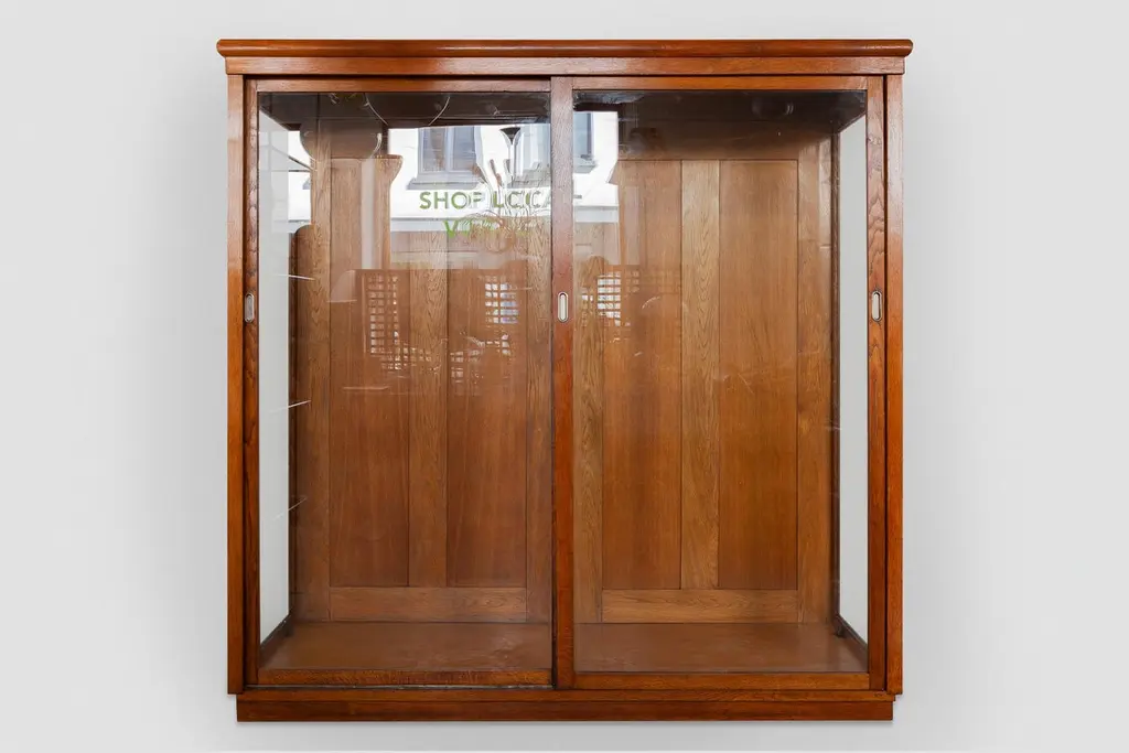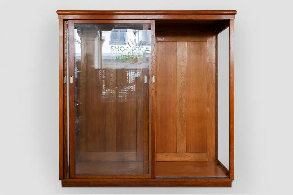A beautiful Art Deco display cabinet from a former Haute Couture Dress store, suitable for hanging long dresses or coats also very effective for exhibiting your collection in a Wunderkammer setup or for presenting large objects. The furniture is made of solid oak with a very nice patina and handmade glass.The cabinet is completely demountable, very convenient for transport. Dimensions:200 W x 198 H x 72 D.