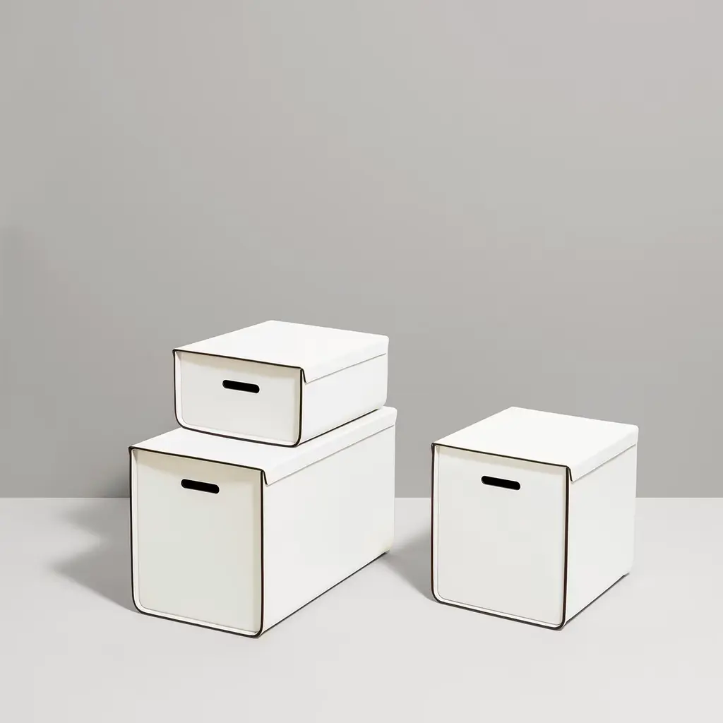 This medium-sized wardrobe box in in resistant, washable regenerated leather comes in three different sizes and in lots of different colors. Slightly rounded bottom edges, a small cut-out at the top for easy transportation, and a lip with a magnetic closure makes this organizer practical while also pretty to look at.