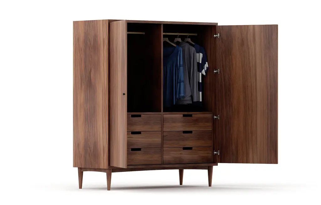 Add storage and polish to your bedroom or entryway with our Atten Armoir, crafted in your choice of FSC-certified Maple or Walnut. Expressions of craftsmanship like classic joinery and an arched base give even more beauty to its refined, modern build, with a nourishing, natural beeswax finish that gives the piece a subtle, matte glow. Cabinet interior features a garment-hanging bar and six soft-close drawers.Tops and sides crafted in your choice of beautiful, 100% solid hard White Maple, White Oak, American Walnut, or Black Stained White Oak. For additional strength and lightness, FSC-certified, low-VOC CARB 2 compliant Maple or Walnut hardwood plywood is used elsewhere.