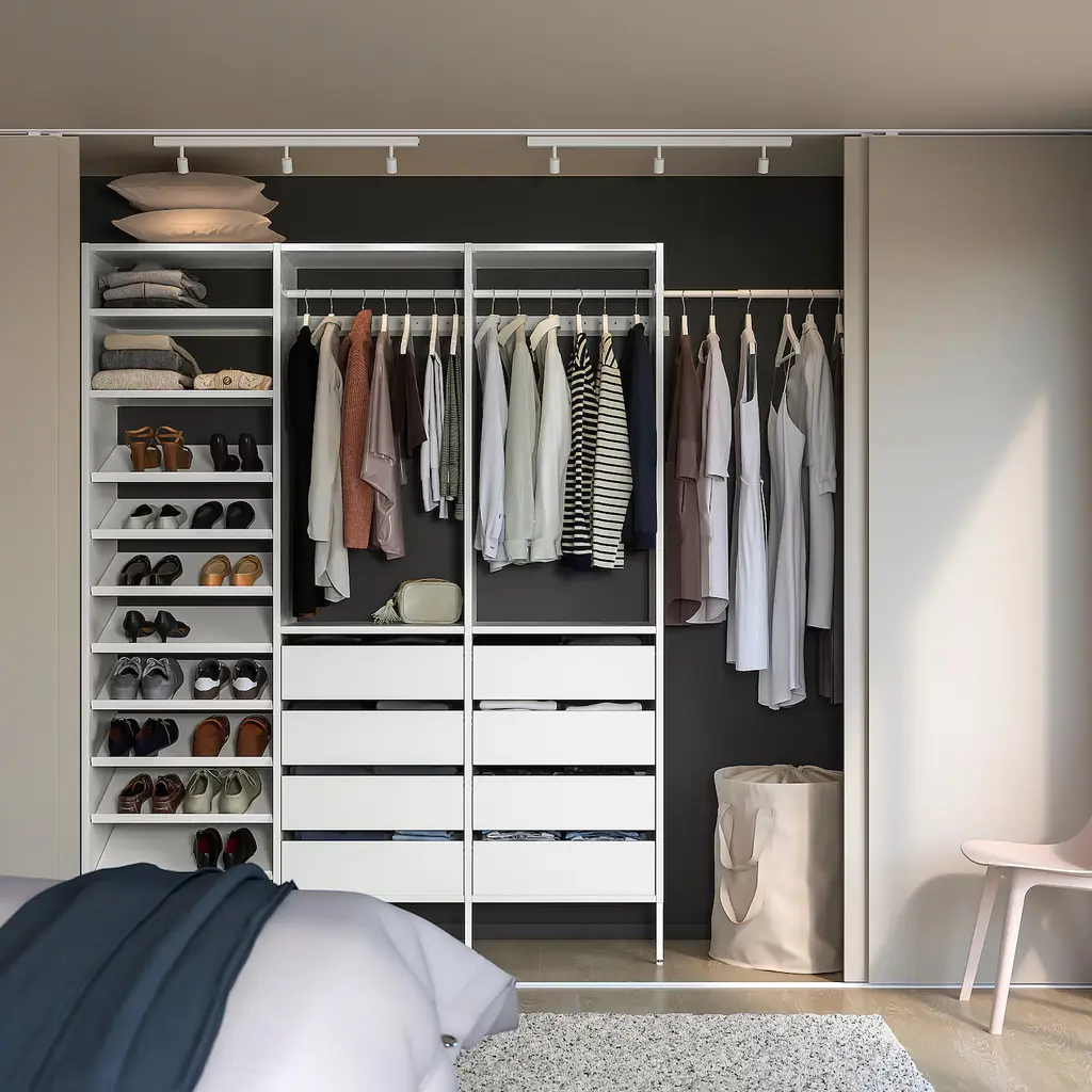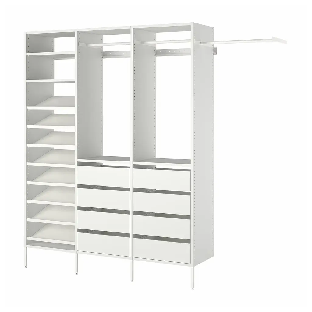 AURDAL Wardrobe combination - white 95 1/8-108 1/8x15 3/4x87 ". The long leg creates a beautiful look and is perfect if you have a high plinth at home. You can combine open and closed storage - shelves for your favorite things and drawers for the things you want to store away.