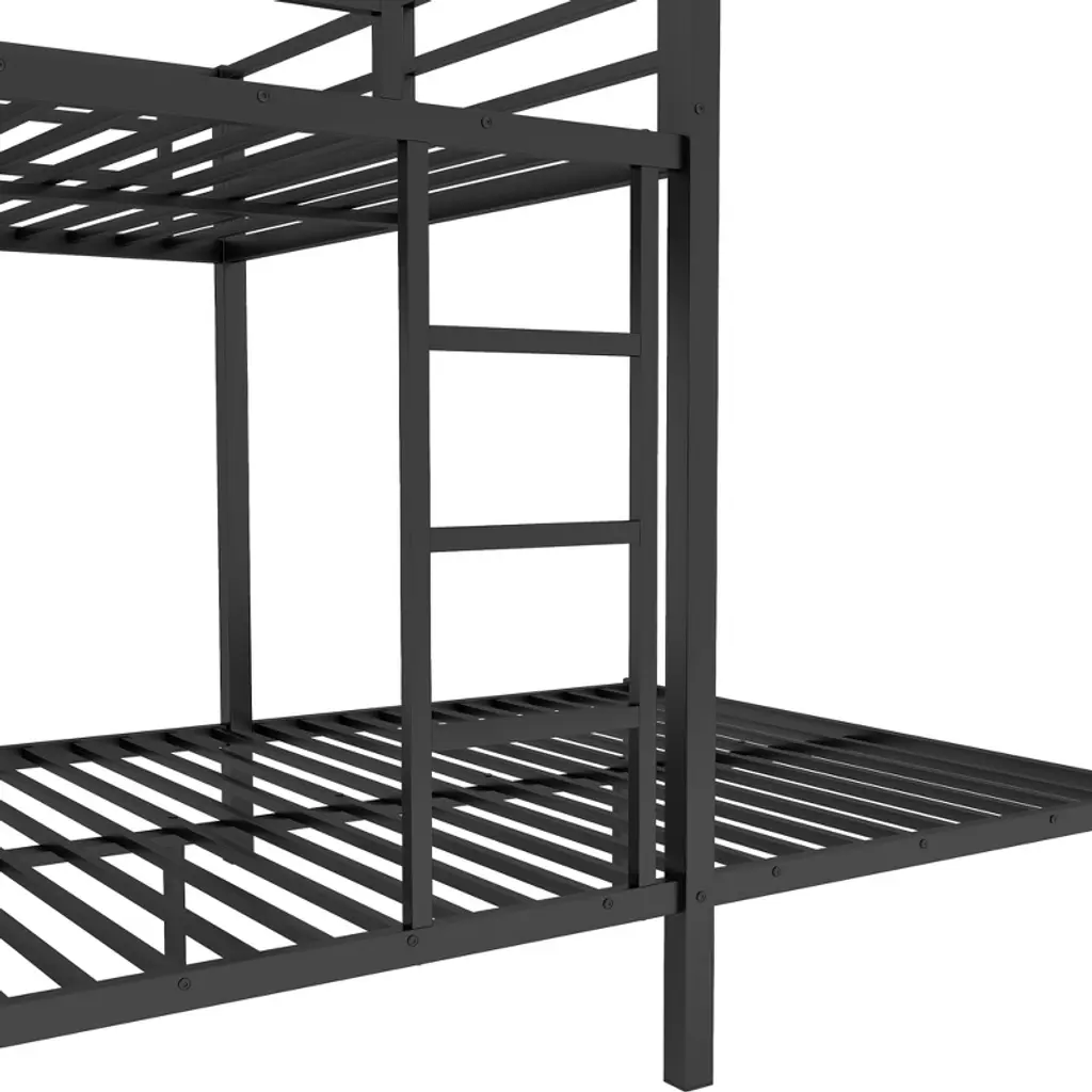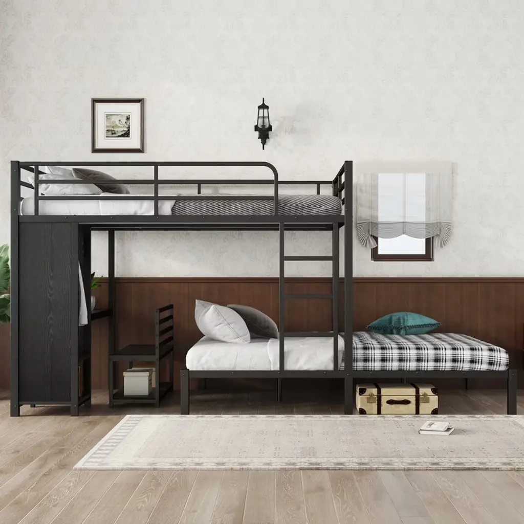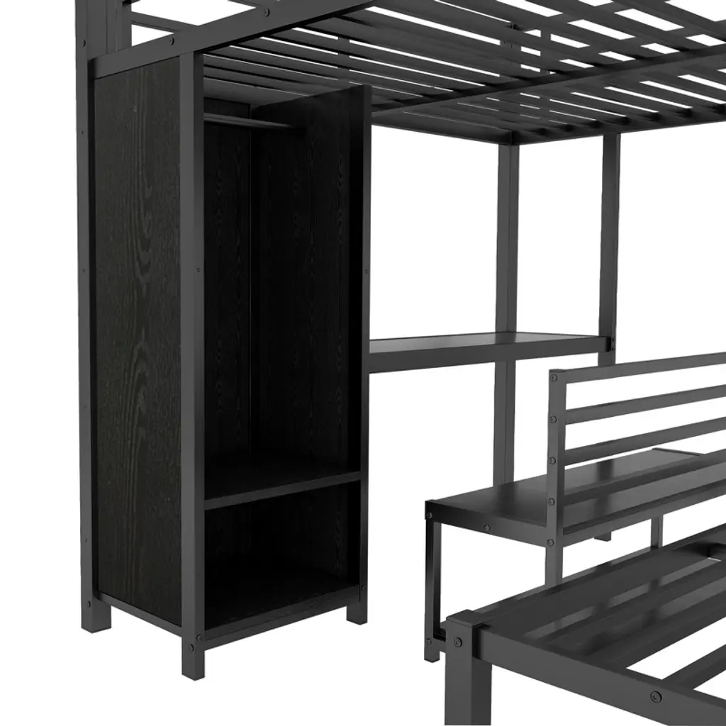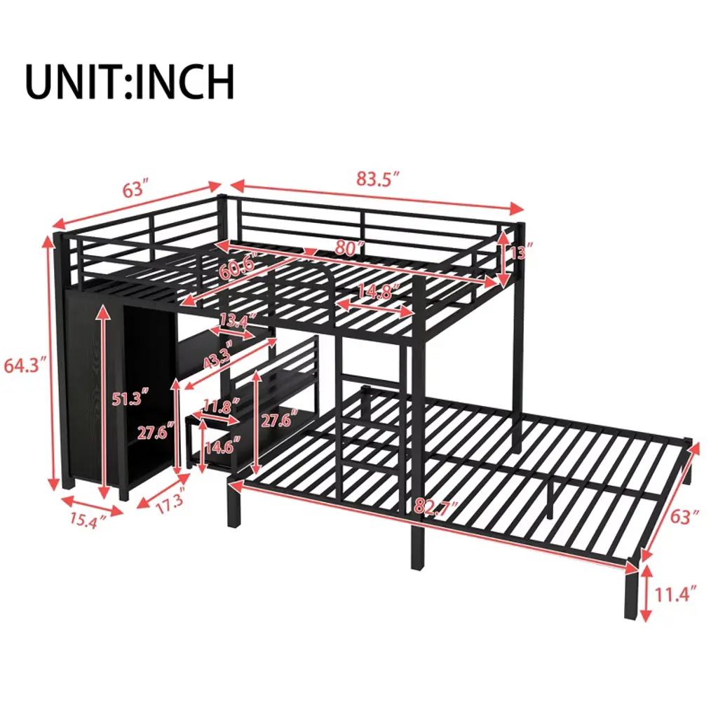 Bellemave Queen Over Queen Size Bunk Bed Frame With Built-in Wardrobe,metal Bunk Bed With Desk And Storage Chairs, Black