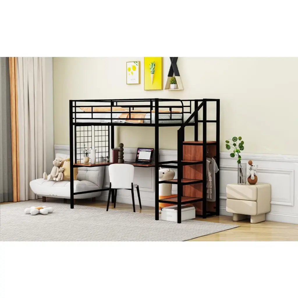 Bellemave Twin Size Metal Loft Bed With Desk And Metal Grid, Stylish Metal Frame Bed With Lateral Storage Ladder And Wardrobe, Black