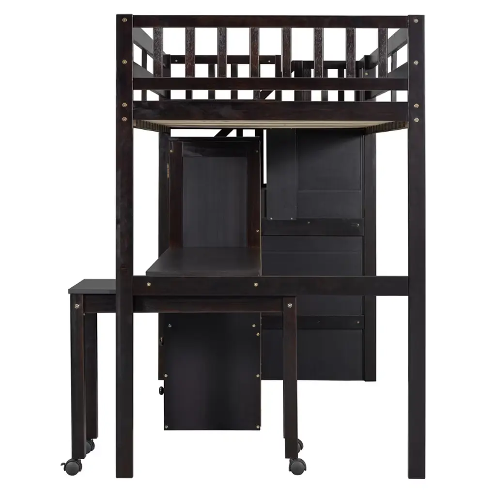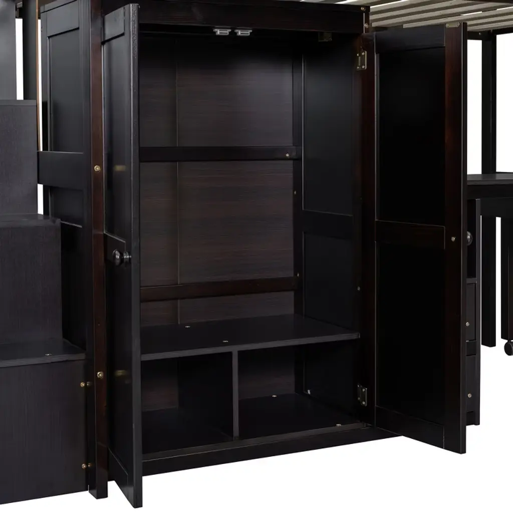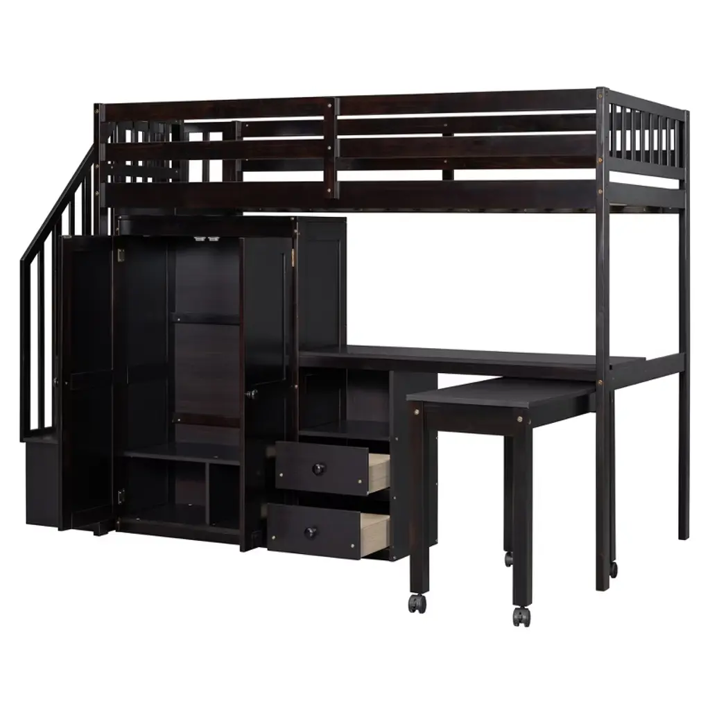 Bellemave Twin Size Wood Loft Bed With Desk And Wardrobe, Modern Style Loft Bed With Drawers And Movable Desk, Storage Staircase Bookcase,espresso