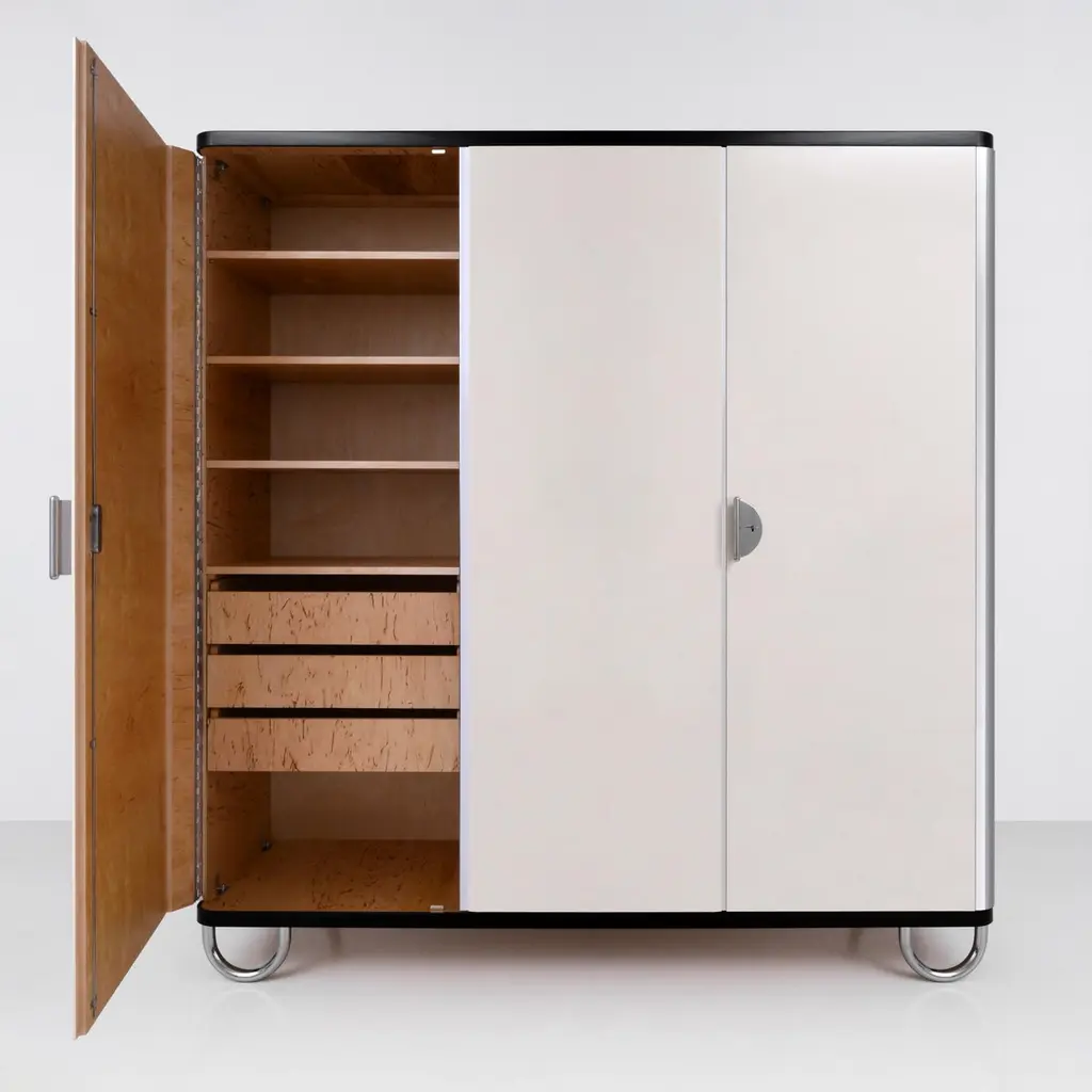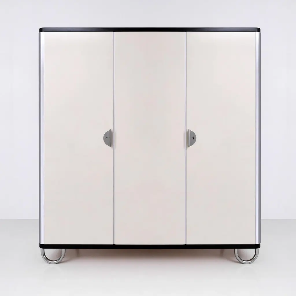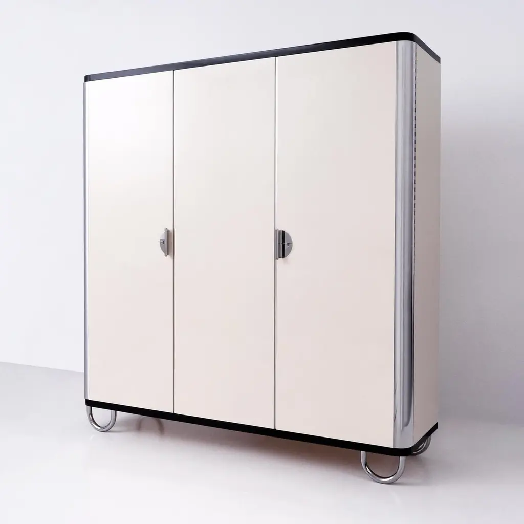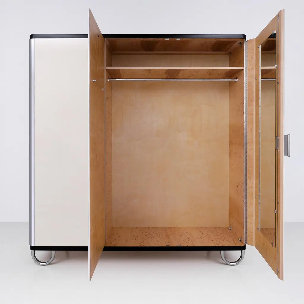 Custom made three-door wardrobe / armoire, designed and manufactured by GMD Berlin, exclusively presented in our Rudolf Vichr Collection.These high-quality, handmade furniture in a classic, timeless design is made from selected materials according to traditional quality standards. Handles and U-shaped tubular feet made of chromium-plated metal, high-gloss lacquered blockboard with details made of chromium-plated sheet. Light birch wood, waxed inside. Classic inside division with shelves and a drawer on one side and hanging rood on the other.Available on request in different colors, finish and dimensions. Production time c. 12 weeks.