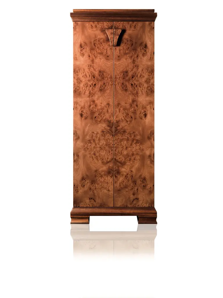 Polished white bird's eye maple contemporary armoured armoire. 24-karat gold-plated accessories. Round handle with biometric opening device and emergency key integrated. Inside pull out necklace holder and drawers lined for jewelry. Secret compartment. VAT will be applicable to sales in the UK.