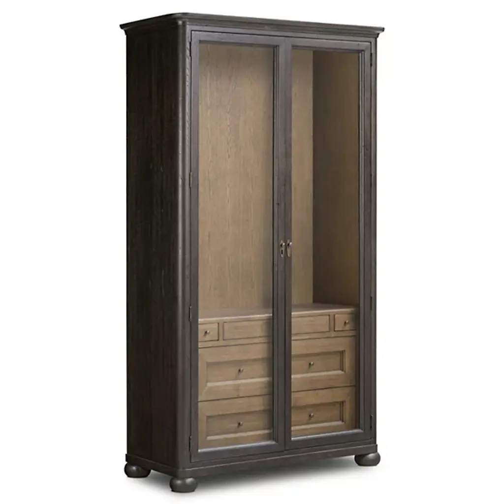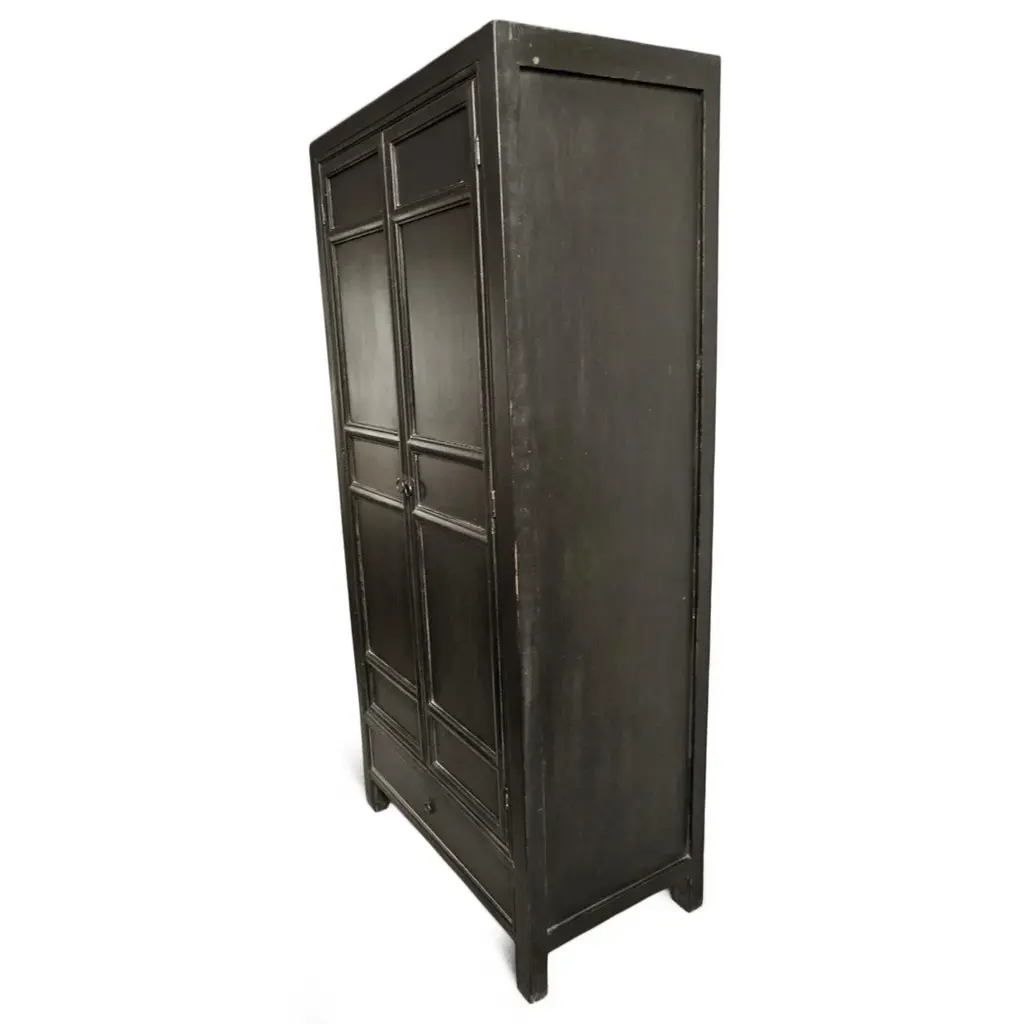 Vintage aged black finish tall wardrobe, storage or bar cabinet. Removable shelves and bonus drawer below. Classic modern farmhouse transitional style. Each cabinet may vary in slight distress and wood grain.