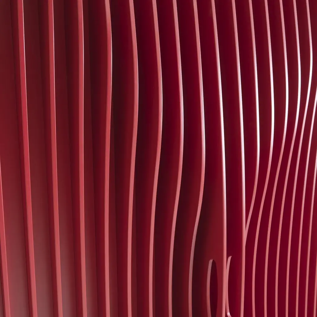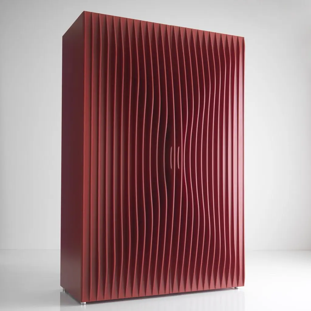 A sculptural piece of functional decor, this wardrobe boasts the dynamism and elegance typical of Karim Rashid's design. Frame, shelves, and doors are made of red-lacquered MDF, boasting a stunning ripple-effect. The interior is illuminated by LED light (input 100/240 V - Europlug CEE 7/16) and separated into two sections: the top shelf measures 35.4 cm and the lower space with clothes rail is 149 cm.