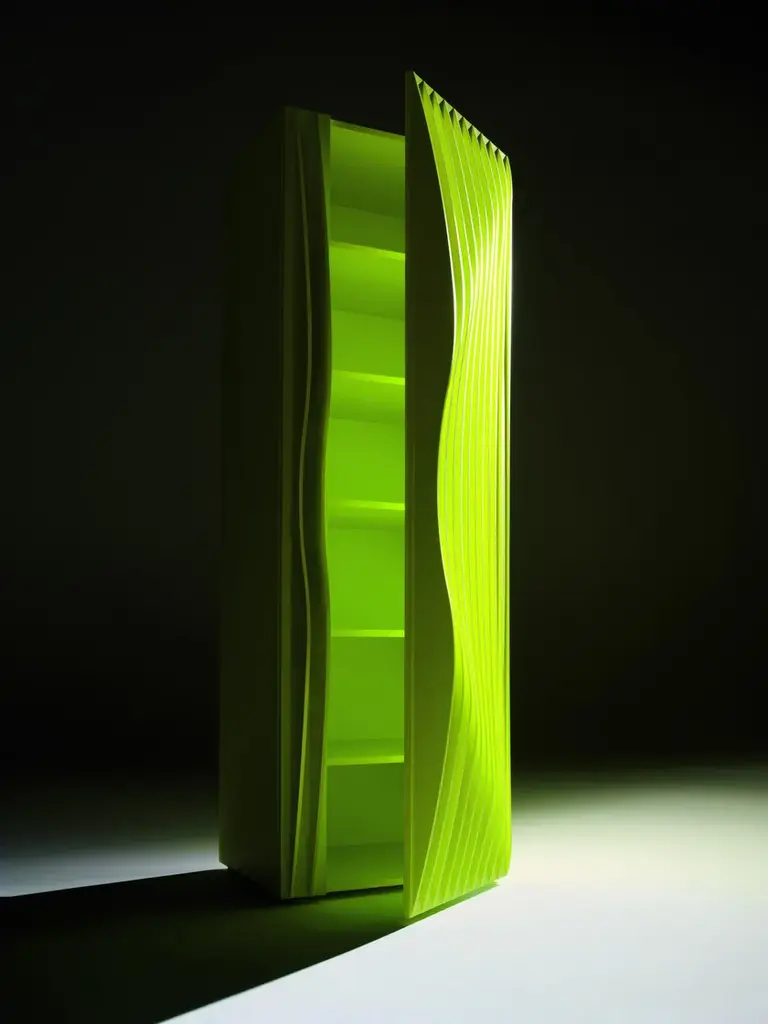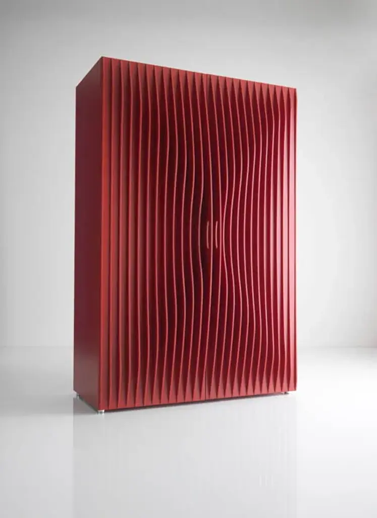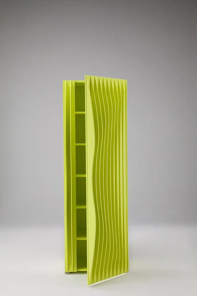 Blend, in its cupboard versions, features doors with evenly-spaced, thin sheets of MDF, which together create a dynamic effect. The theme of dynamism is the predominant feature of its designer, Karim Rashid, who was able to introduce sculptural connotations with Blend. Last but not least, its storage capacity and functionality are noteworthy.FINISHINGAll Horm lacquersDoor opening to the right