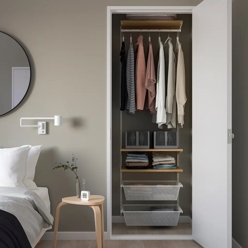 BOAXEL Wardrobe combination - white/oak 24 3/8x15 3/4x79 ". You can always adapt or complete this open storage solution as needed. Maybe the combination we’ve suggested is perfect for you, or you can easily create your own. BOAXEL clothes rail, 24", holds approx. 20 shirts on hangers.