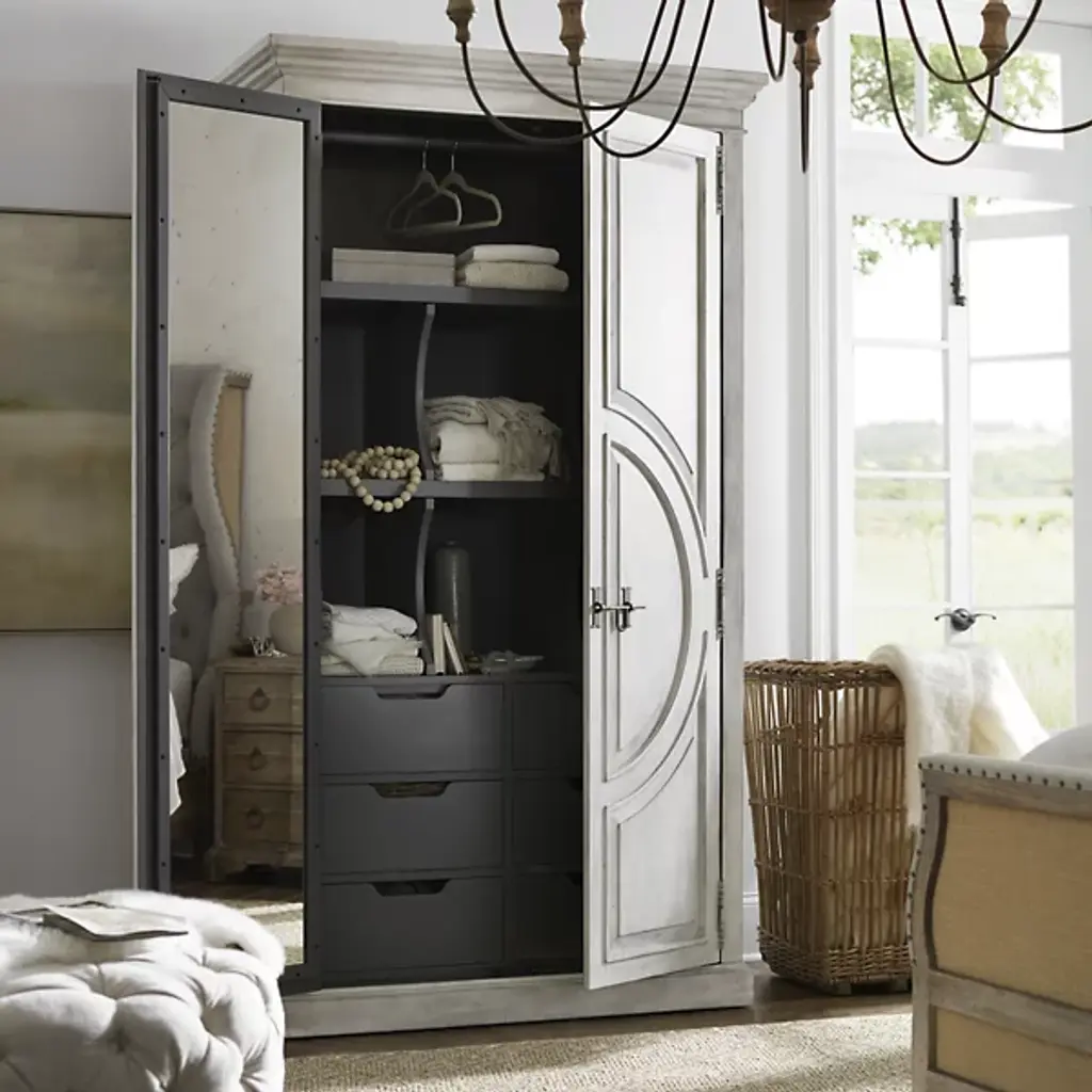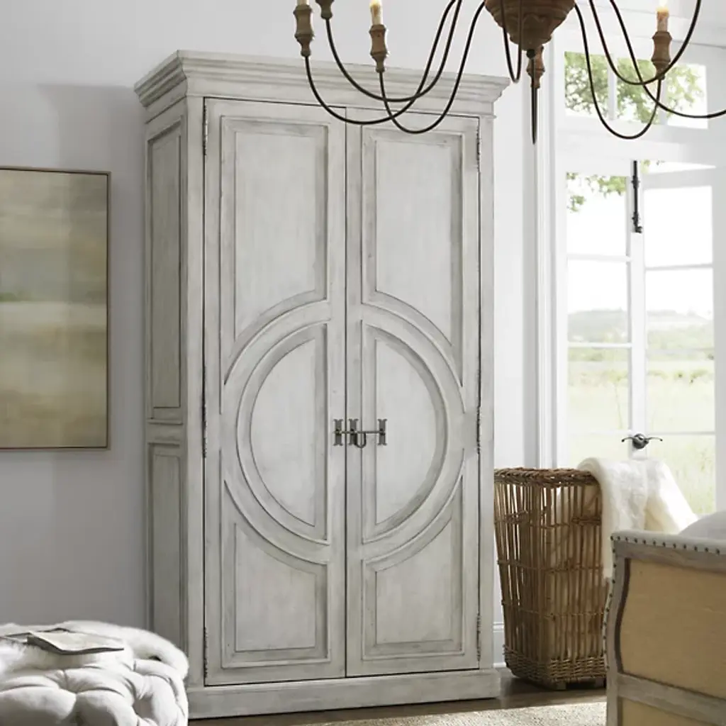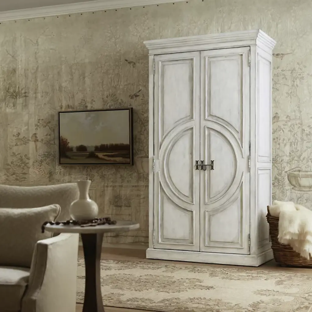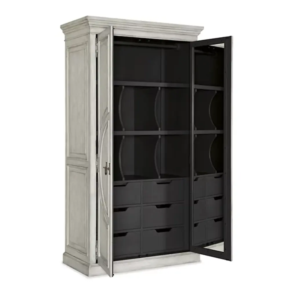 The Boheme Wardrobe from Hooker Furniture showcases balance and serenity, making a striking focal point for any space. Its raised panel doors feature an elegant circular motif at the center, complemented by distinctive latch-key hardware for a touch of character. Finished in soft Whitewash with a beautifully contrasting Merion Blue interior, it offers thoughtful storage with six drawers, two adjustable shelves, four removable dividers, a clothing rod, and a full-length mirror inside the left door, combining timeless style with practical organization.