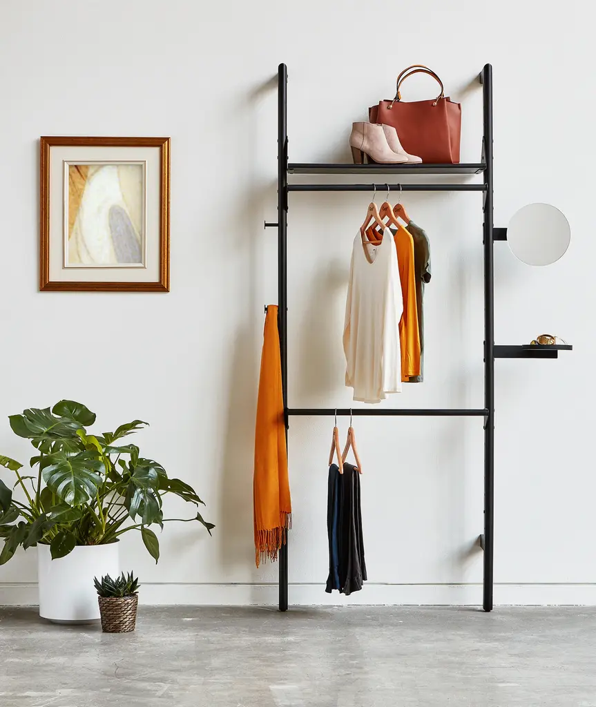 The Branch Modular Organization System blends mid-century style with modular components to give you an infinite number of elegant, open-storage options for home, office, or retail environments. The designs feature varying configurations that can be transformed into a wide range of organization or display units. Add-ons let you customize the size, layout and function of the system to suit your space. Refined details, such as rounded edges on the shelves and uprights, soften Branch’s aesthetic and enhance its architectural style. Straightforward installation means you can spend more time perfecting your vision and display. *Includes: 2 Branch Uprights, 1 Shelf, 2 Hangbars, 1 Side Mirror, 1 Side Tray and a set of 3 Single Hooks. Additional Add-Ons may be purchased here to customize the configuration.