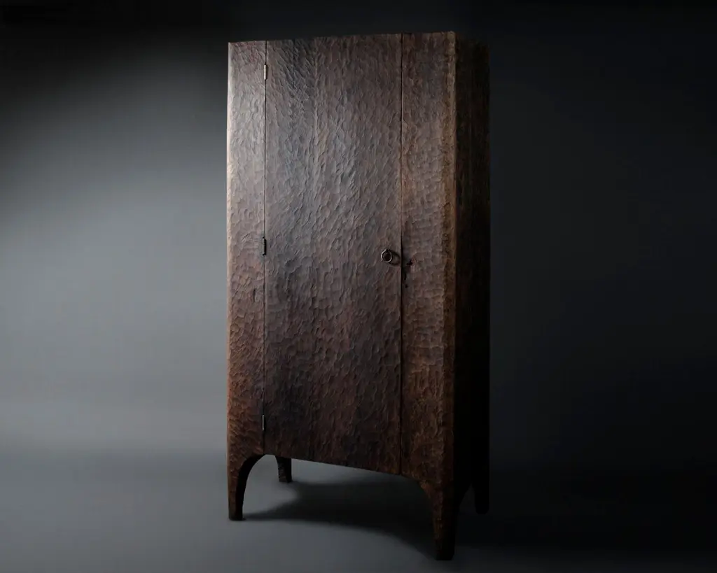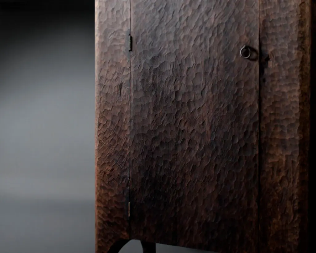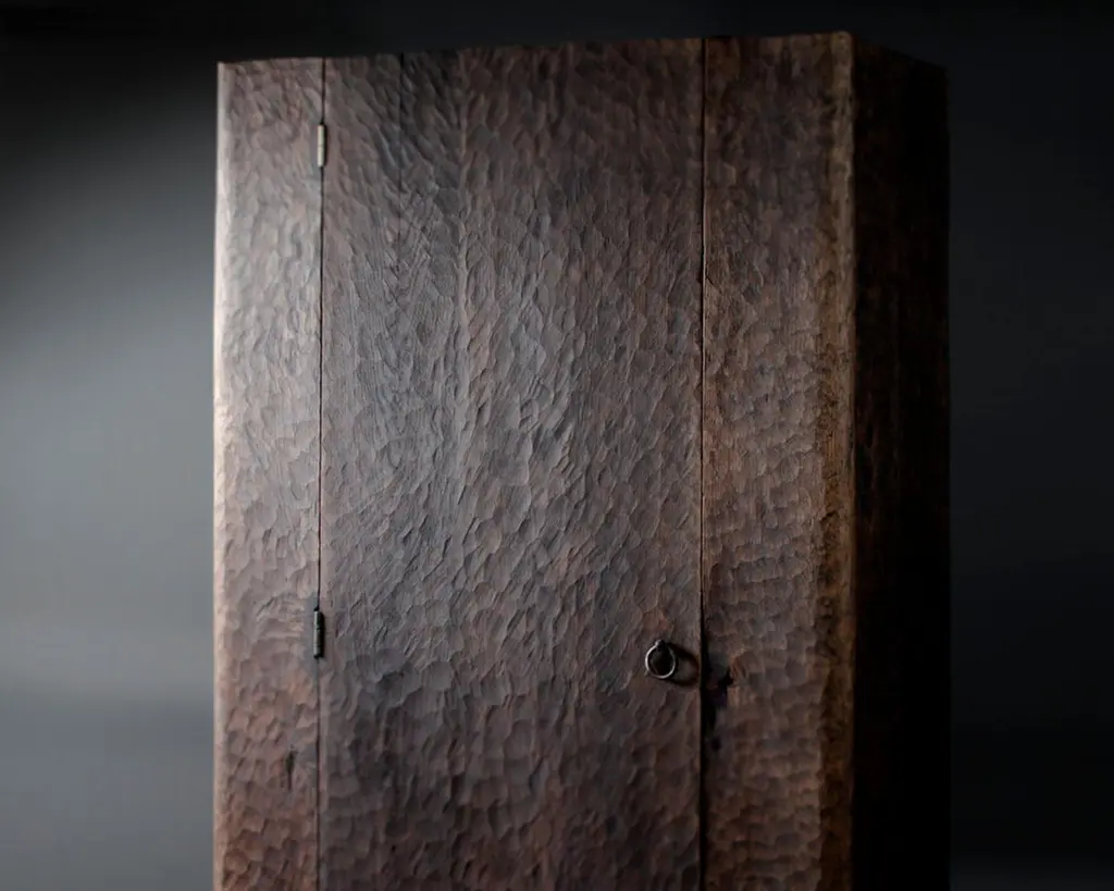 Wardrobe made of solid oak (+ linseed oil)Measures: 175 x 80 x 40 cmSÓHA design studio conceives and produces furniture design and decorative objects in solid oak in an authentic style. Inspiration to create all these items comes from the Russian North aesthetics with its severe nature, log huts black from time and climate and scant patterns. Wood is masterfully hand processed with chainsaw or chisel, whereby producing beautiful surface patterns. The wood is soaked in boiling baths of linseed oil, creating this special patina and making each creation a very unique piece. Reacting with tanning substances under high temperature, oil gives the objects expressive and natural colours, from light brown to charcoal-black. SÓHA offers a vast array of neo-primitivist interior objects. Our kitchen utensil, wall panels, sculptures and furniture solutions are executed in one unique style and will organically fit into the interior of your home. Each piece is one-of-a-kind handmade product.Unique piece made to order.