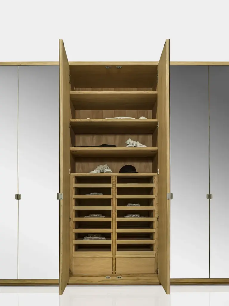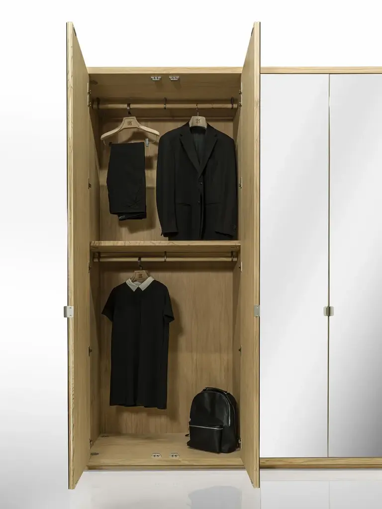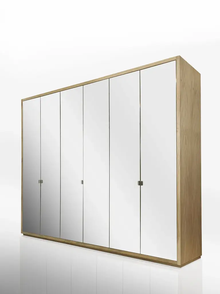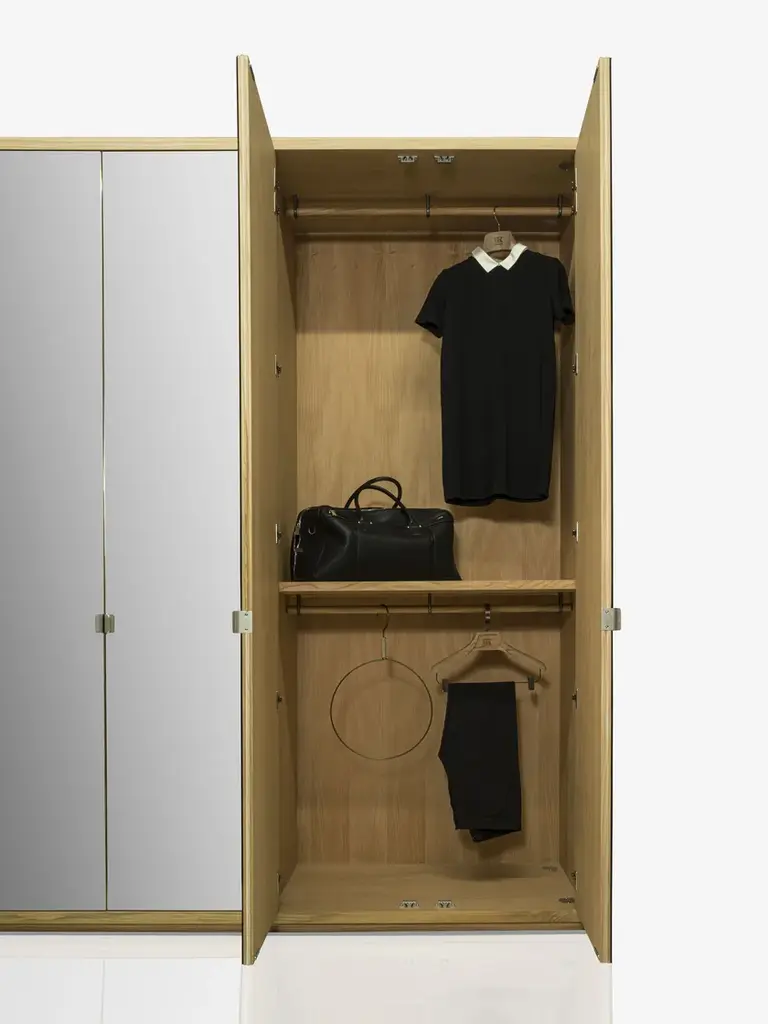 Cornice is a solid wood and blockboard wardrobe, characterized by mirrored hinged doors and a solid wood frame, inside in scented Cedarwood, naturally mothproof. Customizable by inserting solid wood coat hangers, shelves, chests of drawers with traditional dovetail joints and various accessories, it proposes a functional, modular organization of various elements according to holding needs and required dimensions.