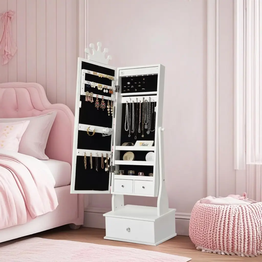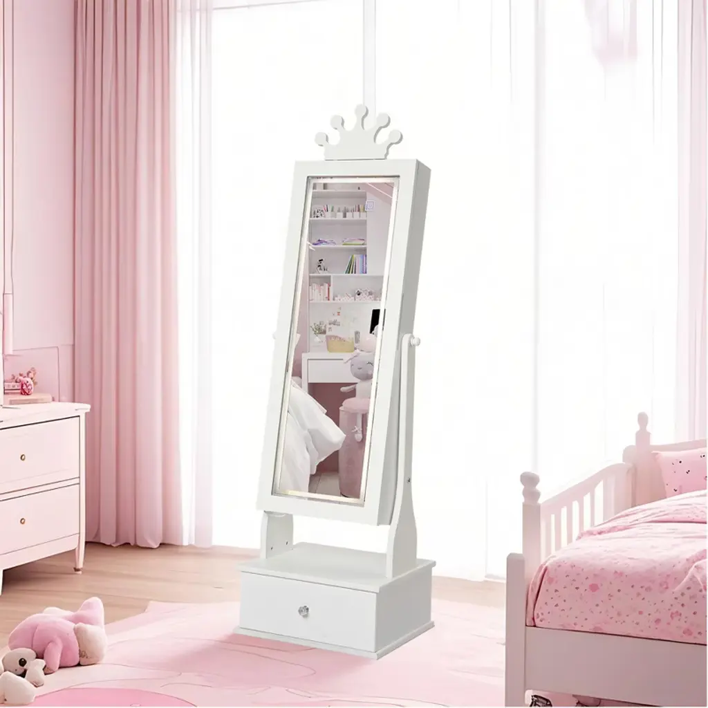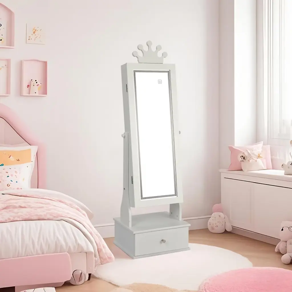 Feature:The COZONY Kids Jewelry Armoire combines fun and function in one charming design. Featuring a full-length mirror with built-in LED lights, this jewelry cabinet allows children to dress up, accessorize, and admire their outfits with ease. The freestanding design ensures stability, while three spacious drawers provide plenty of storage for jewelry, hair clips, or small . Crafted with child-friendly materials, smooth edges, and durable construction, it is safe for kids to use every day. Perfect for bedrooms, playrooms, or as a thoughtful gift, this jewelry armoire helps children stay organized while adding a touch of style to their space.Package Included:1 PCS Kids Jewelry Armoire with Full-Length LED Mirror & 3 Drawers