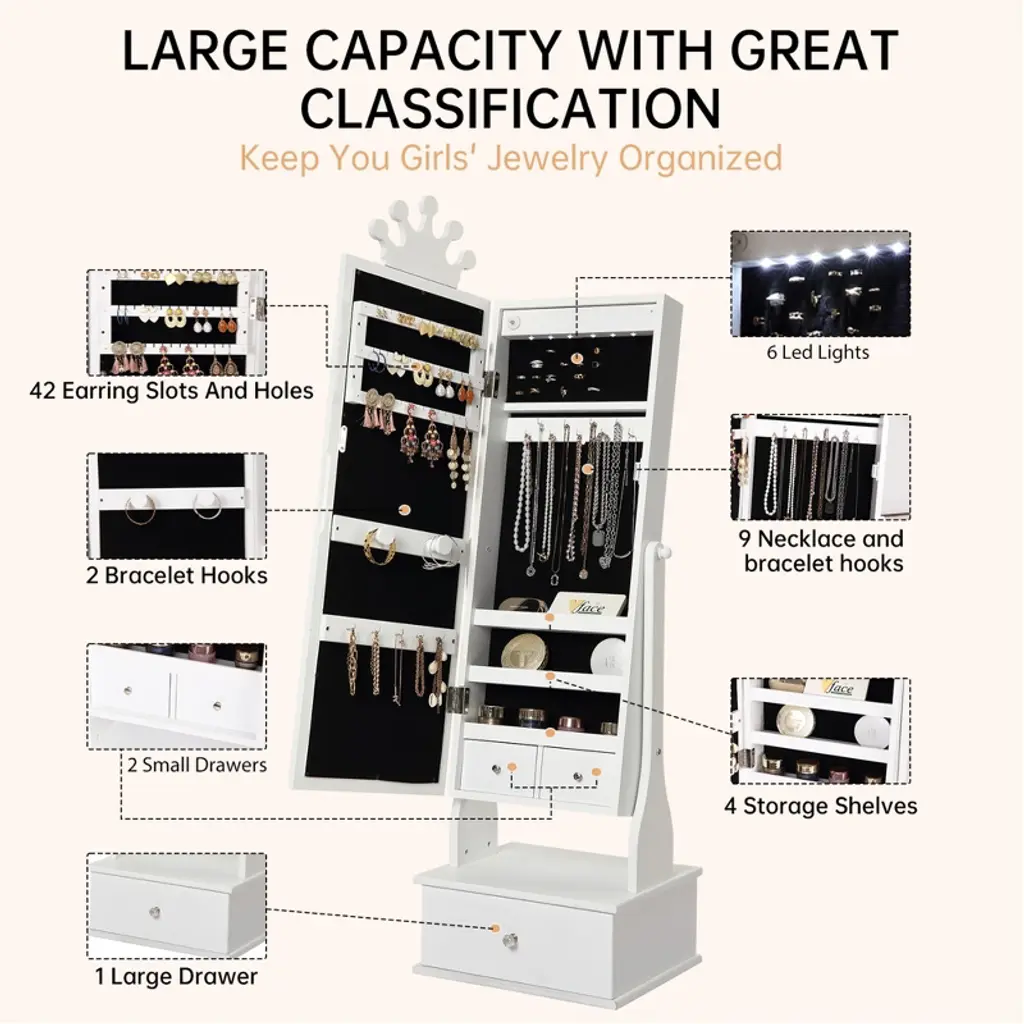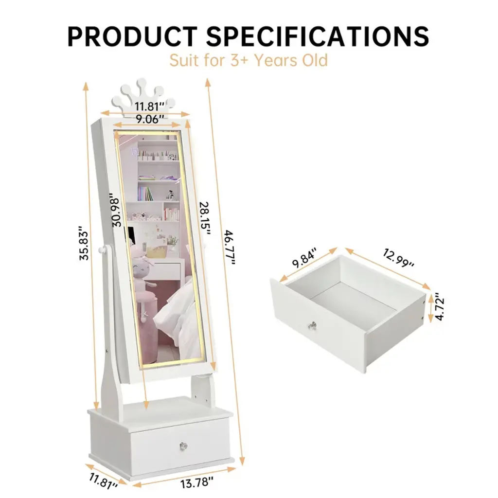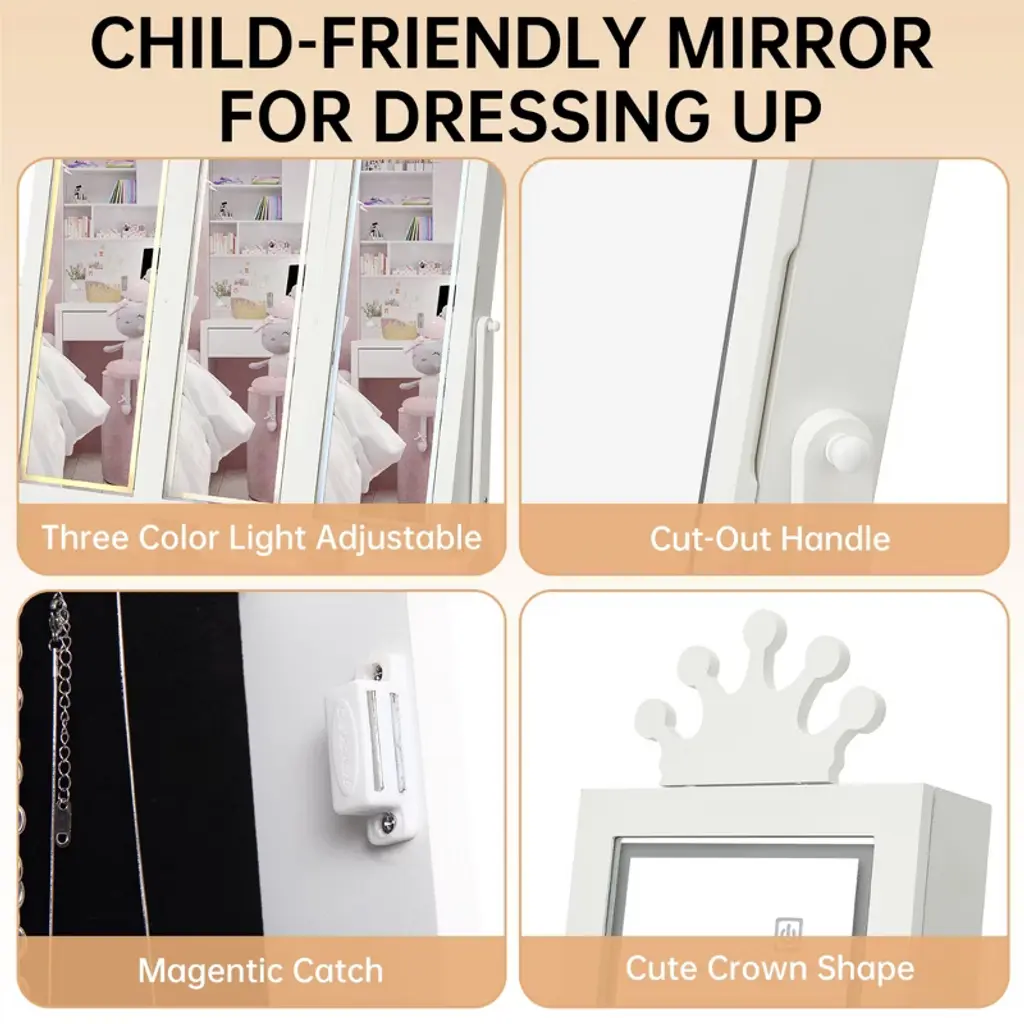 Feature:The COZONY Kids Jewelry Armoire combines fun and function in one charming design. Featuring a full-length mirror with built-in LED lights, this jewelry cabinet allows children to dress up, accessorize, and admire their outfits with ease. The freestanding design ensures stability, while three spacious drawers provide plenty of storage for jewelry, hair clips, or small . Crafted with child-friendly materials, smooth edges, and durable construction, it is safe for kids to use every day. Perfect for bedrooms, playrooms, or as a thoughtful gift, this jewelry armoire helps children stay organized while adding a touch of style to their space.Package Included:1 PCS Kids Jewelry Armoire with Full-Length LED Mirror & 3 Drawers