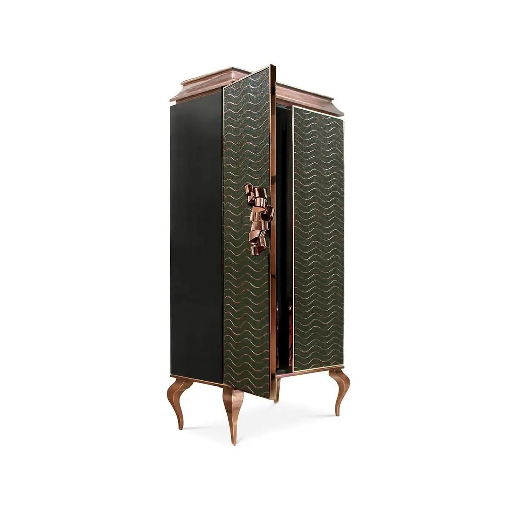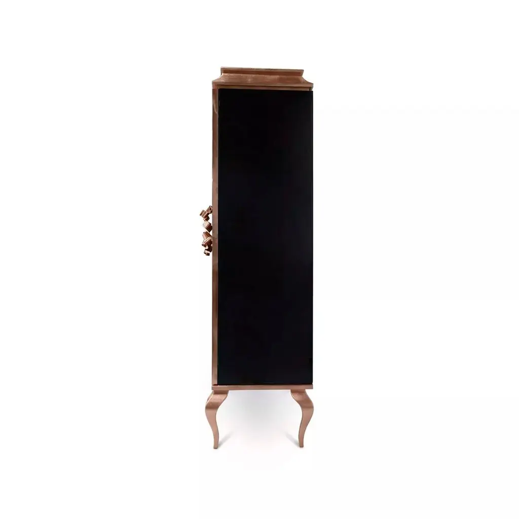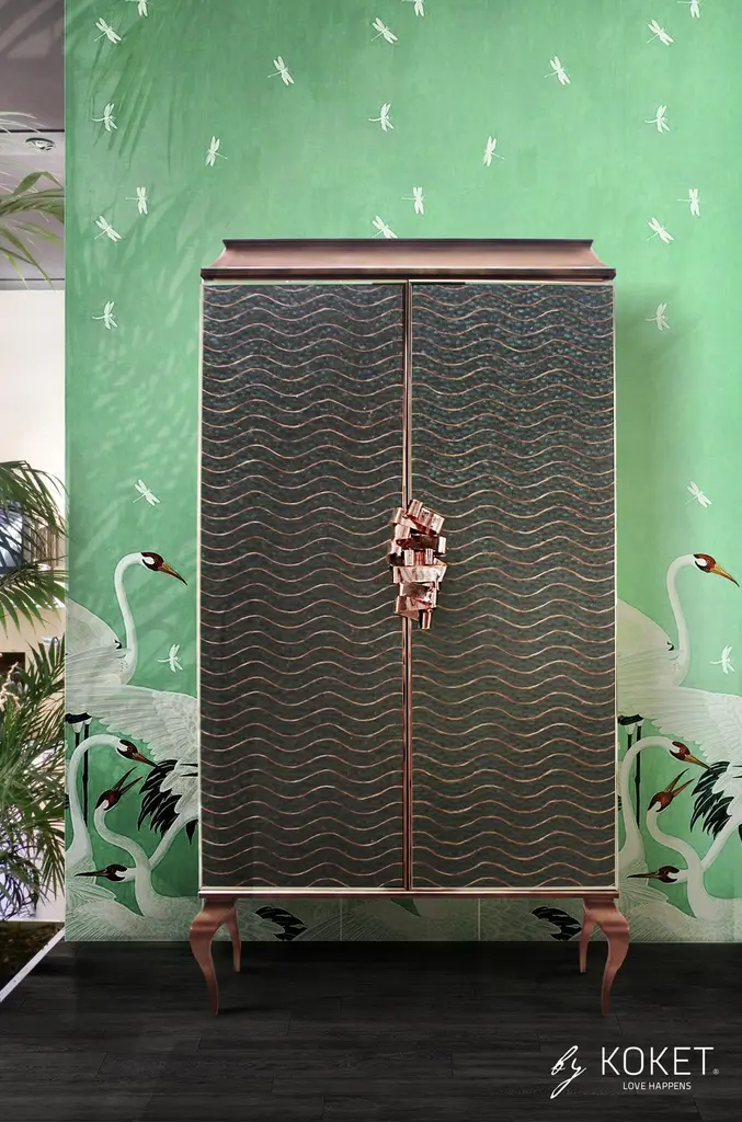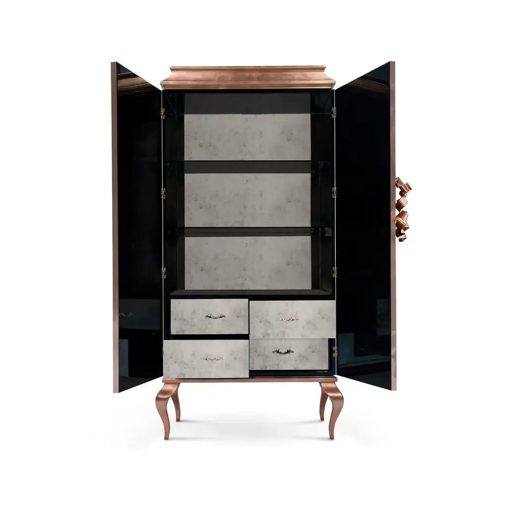 This utterly desirable double door pagoda top armoire is covered in delicate, individually placed natural feathers. An exquisite metal ribbon opens the doors to a lavish interior graced with four drawers and two adjustable shelves. The top and base feature a hand-applied metal leaf for added glamour.Materials & Finishes: Structure: Black Lacquer (High Gloss Finish)Base: Copper Leaf (High Gloss Finish)Top: Copper Leaf (High Gloss Finish)Doors: Peacock Organic Feathers from the KOKET Textiles collectionInterior: Black Lacquer (High Gloss Finish) and Aged MirrorHandle: Hammered Pique Copper (High Gloss Finish)Shelves: Smoked GlassDoor Frame: Copper Plated Brass (High Gloss Finish)Clean & Care: Provide special care to avoid fading or wear out. The feathers are natural, not dyed. Anything exposed to strong light for extended periods of time will cause colors to fade and wear out. Use a soft brush to clean dust off the surface of the feathers following the direction of their application. Wood, lacquered, and linen pieces have been stained and/or polished to bring depth and beauty to each finish. Although most are protected with either a clear coat or wax, they are still susceptible to wear. Care for your wood and lacquer pieces by dusting regularly with a soft cloth. Maintain wood, lacquer and mother of pearl by not placing near heaters and air conditioning units to prevent over-drying or exposure to excessive moisture. Avoid extreme humidity changes in your home, as extremely dry air can cause wood to crack and lacquer to lift. Do not place/leave hot or moist objects directly on the wood. Rubber or plastic left on the wood finish can also damage the finish. Clean by using a dry or slightly damp soft cloth. Follow by polishing with a dry soft cloth. Do not use commercial, heavy-duty polishes or waxes, as they can yellow light finishes. We recommend that stained or soiled wood, lacquer or mother of pearl pieces be professionally cleaned or refinished.