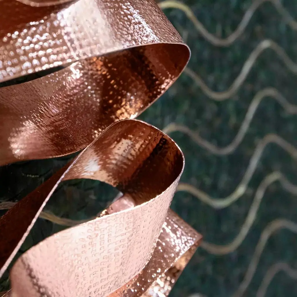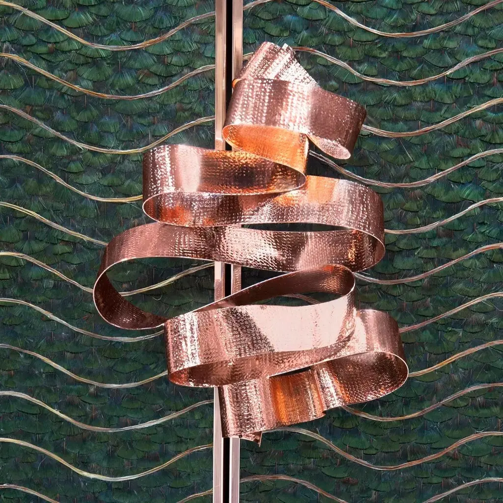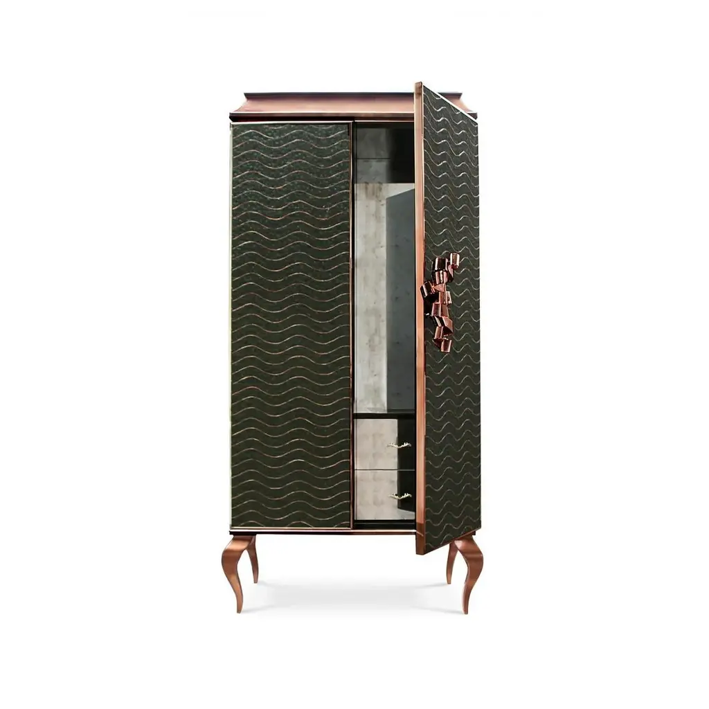This utterly desirable double door pagoda top armoire is covered in delicate, individually placed natural feathers. An exquisite metal ribbon opens the doors to a lavish interior graced with four drawers and two adjustable shelves. The top and base feature a hand-applied metal leaf for added glamour.Materials & Finishes: Structure: Black Lacquer (High Gloss Finish)Base: Copper Leaf (High Gloss Finish)Top: Copper Leaf (High Gloss Finish)Doors: Peacock Organic Feathers from the KOKET Textiles collectionInterior: Black Lacquer (High Gloss Finish) and Aged MirrorHandle: Hammered Pique Copper (High Gloss Finish)Shelves: Smoked GlassDoor Frame: Copper Plated Brass (High Gloss Finish)Clean & Care: Provide special care to avoid fading or wear out. The feathers are natural, not dyed. Anything exposed to strong light for extended periods of time will cause colors to fade and wear out. Use a soft brush to clean dust off the surface of the feathers following the direction of their application. Wood, lacquered, and linen pieces have been stained and/or polished to bring depth and beauty to each finish. Although most are protected with either a clear coat or wax, they are still susceptible to wear. Care for your wood and lacquer pieces by dusting regularly with a soft cloth. Maintain wood, lacquer and mother of pearl by not placing near heaters and air conditioning units to prevent over-drying or exposure to excessive moisture. Avoid extreme humidity changes in your home, as extremely dry air can cause wood to crack and lacquer to lift. Do not place/leave hot or moist objects directly on the wood. Rubber or plastic left on the wood finish can also damage the finish. Clean by using a dry or slightly damp soft cloth. Follow by polishing with a dry soft cloth. Do not use commercial, heavy-duty polishes or waxes, as they can yellow light finishes. We recommend that stained or soiled wood, lacquer or mother of pearl pieces be professionally cleaned or refinished.