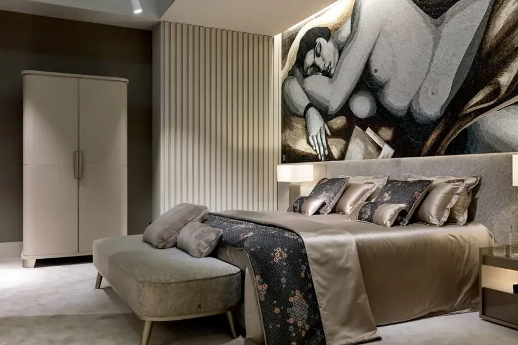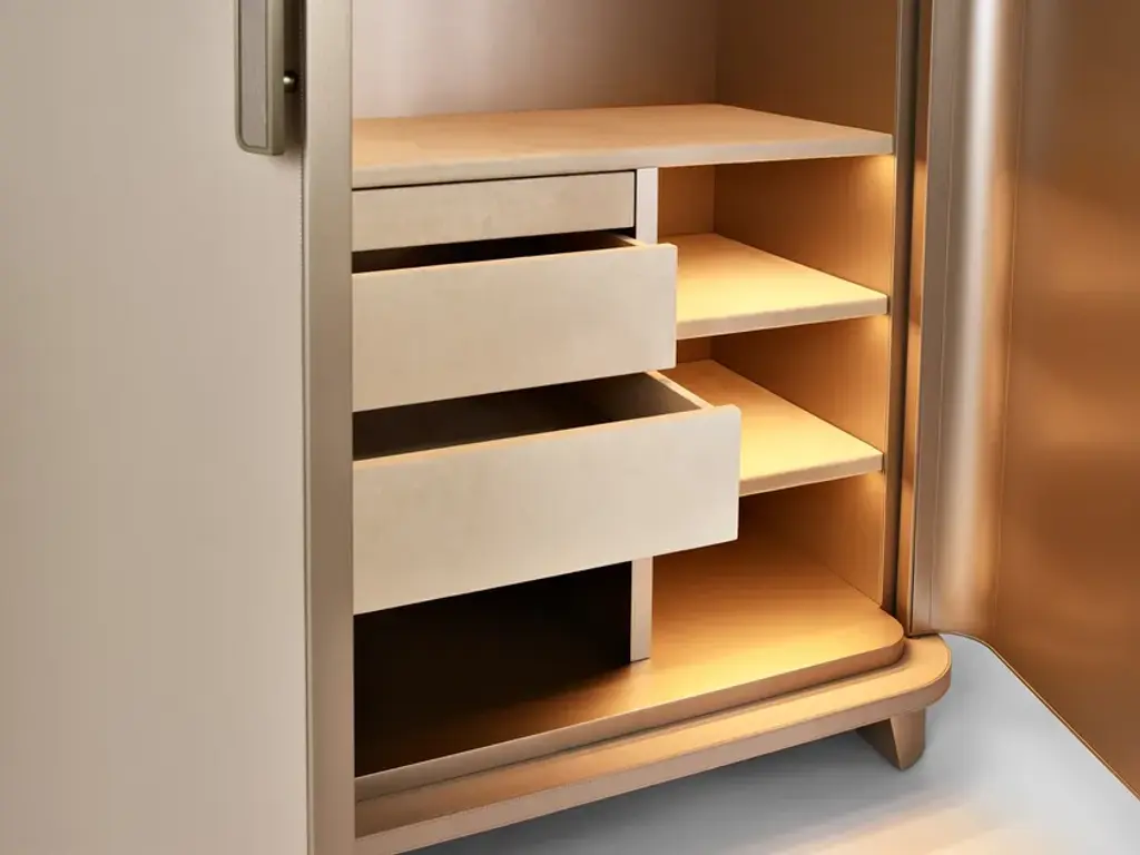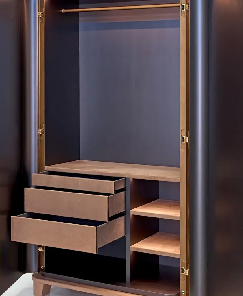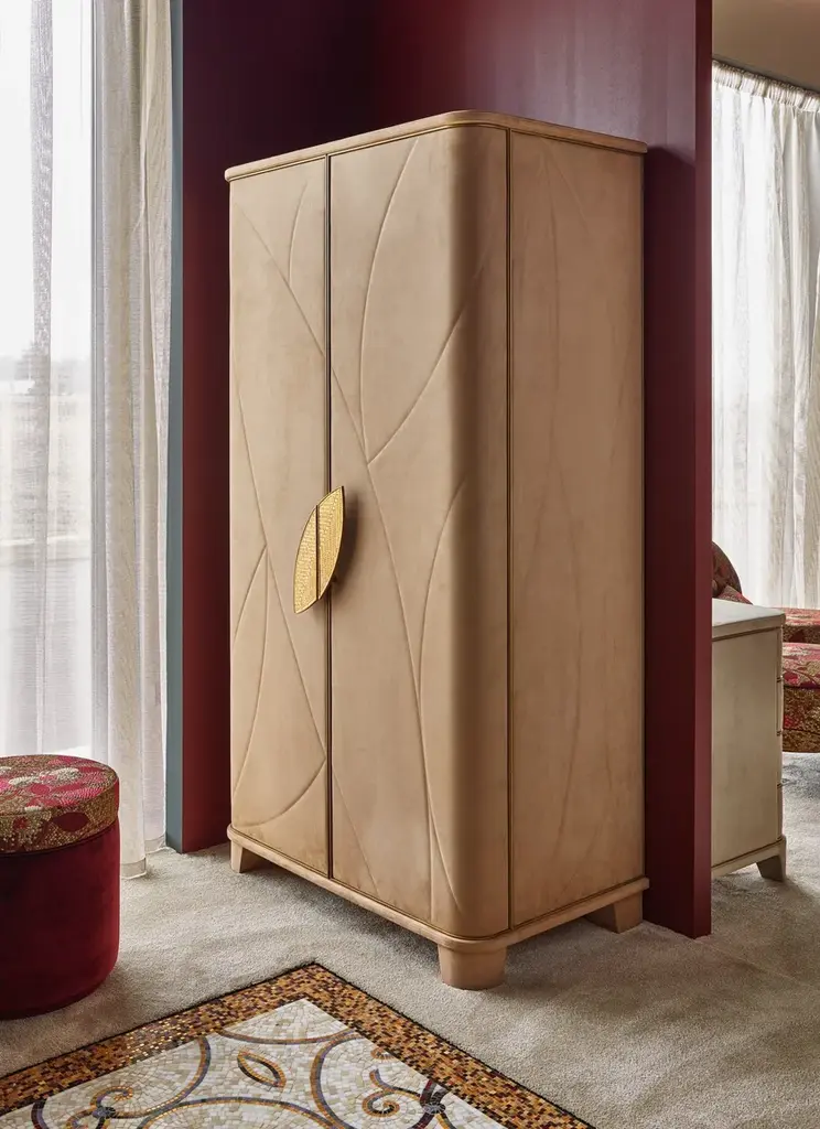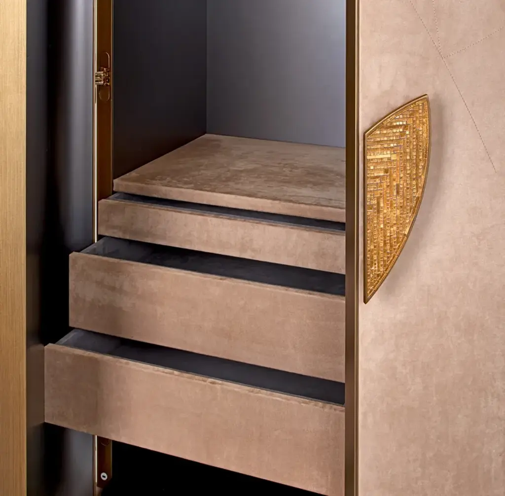 Dongiovanni is a cabinet with a refined but discreet style that is expressed through quality materials and craftsmanship. A contemporary structure with artistic details. Two-door cabinet. Exterior upholstered in leather or Nabuk. Interior finished with metal lacquer. Drawers and shelves finished in fabric or Nabuk. Internal lighting with opening sensor. Handle with coated finish decorated with mosaic tiles or foam glass.