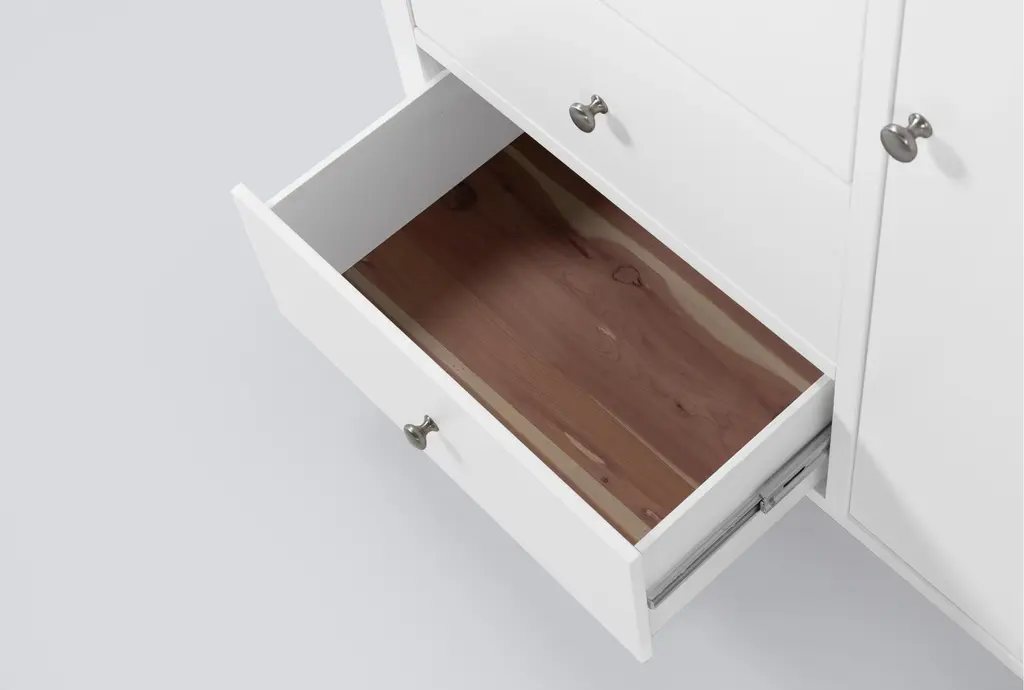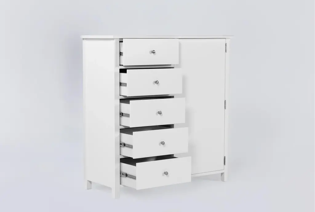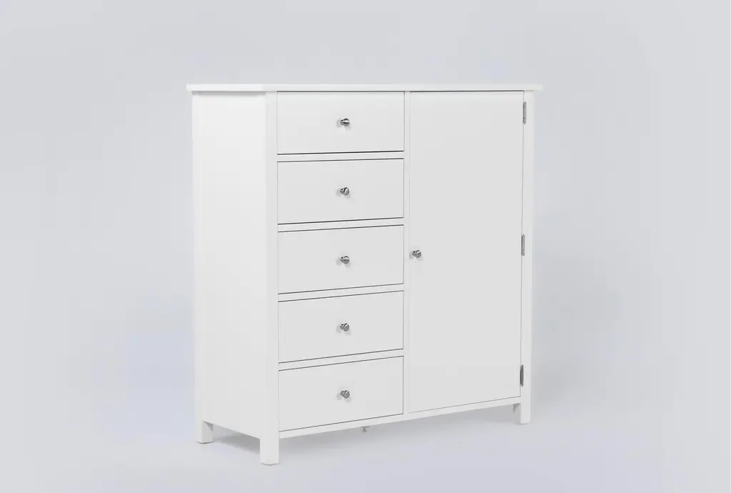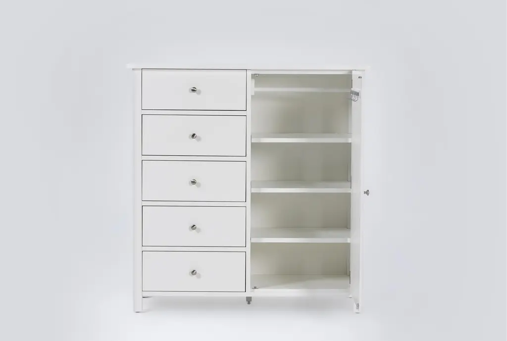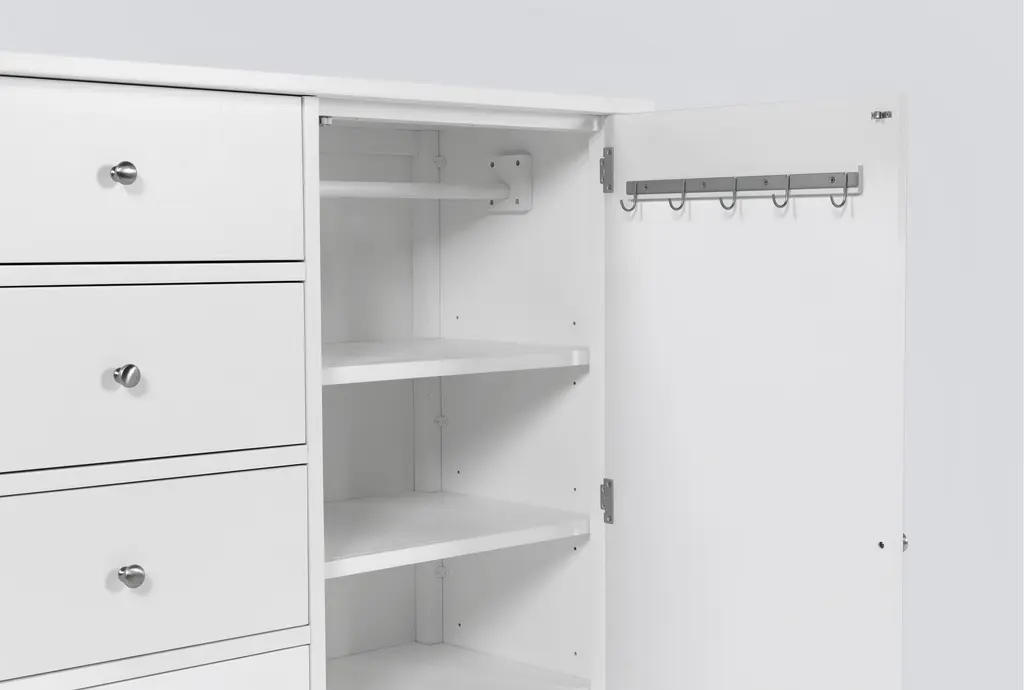 Designed with a sense of ease and simplicity, our Felipe wardrobe is a seamless addition to your space. Sturdy construction is enlightened by the white finish, understated hardware and clean lines. You'll love the casual charm and welcome function this piece brings. Featuring dovetail joinery and side-mount full extension ball-bearing glides, the drawers promise smooth operation. A felt-lined top drawer and cedar-lined bottom drawer enhance the quality. For added convenience, it offers a felt jewelry tray and cabinet compartment with adjustable shelving, hanging rod and jewelry hooks.