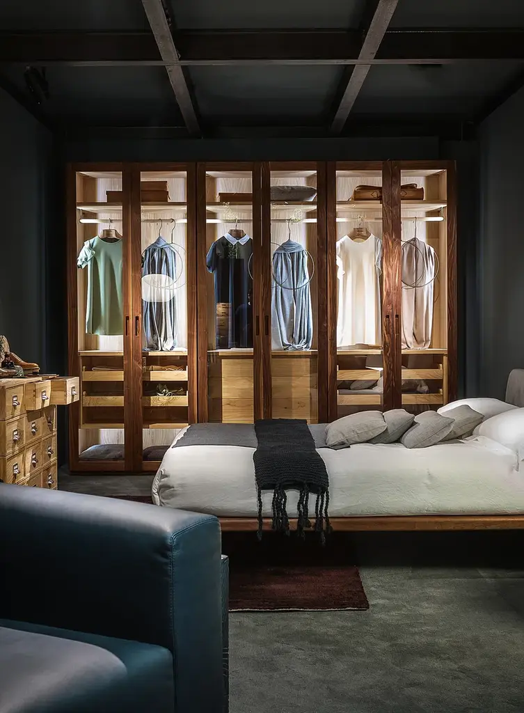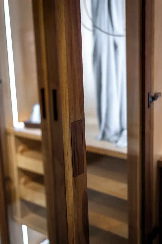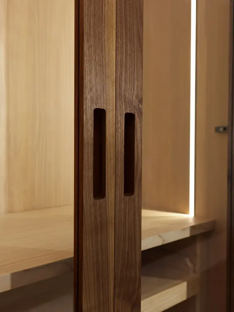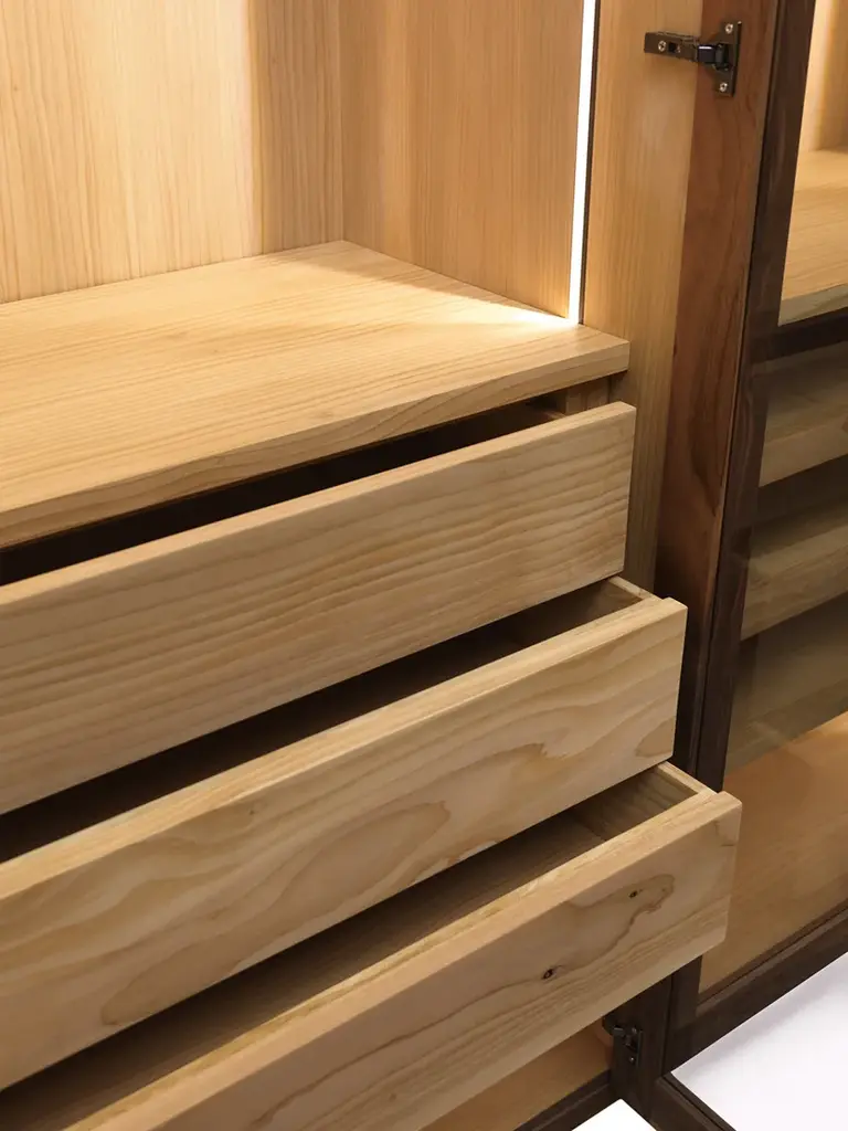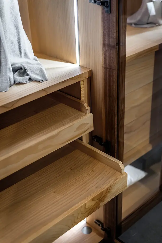 Four Seasons Glass is a Wardrobe in veneered blockboard and solid wood, glass doors with wooden frame and grooved handles. It offers a functional and modular organization of the different elements, based on the customer’s needs and requested sizes.It can be customized with the addition of cloth-hangers, shelves, chests of drawers in solid wood with traditional dovetail joints and other accessories. Perfect with internal fitting in scented cedar, a natural anti-moth agent. LED lighting available upon request.STANDARD VERSION: CLEAR GLASS DOORS WITH WOODEN PROFILE; GROOVED HANDLES INTEGRATED IN THE WOODEN PROFILE; INTERNAL FITTINGS IN SCENTED CEDARWOODAVAILABLE FINISHES:A1: walnut without knots, walnut with knotsA2: oak without knots, oak with knots, cherryA4: oak without knots pigmented: milk white, total blackoak with knots pigmented: milk white, total blackN.B.: pigmented surfaces only outside, inside cedarA7: cedarPurchasing informationPrice refers to external wardrobe, without any internal extras: internal configurations are available on request.