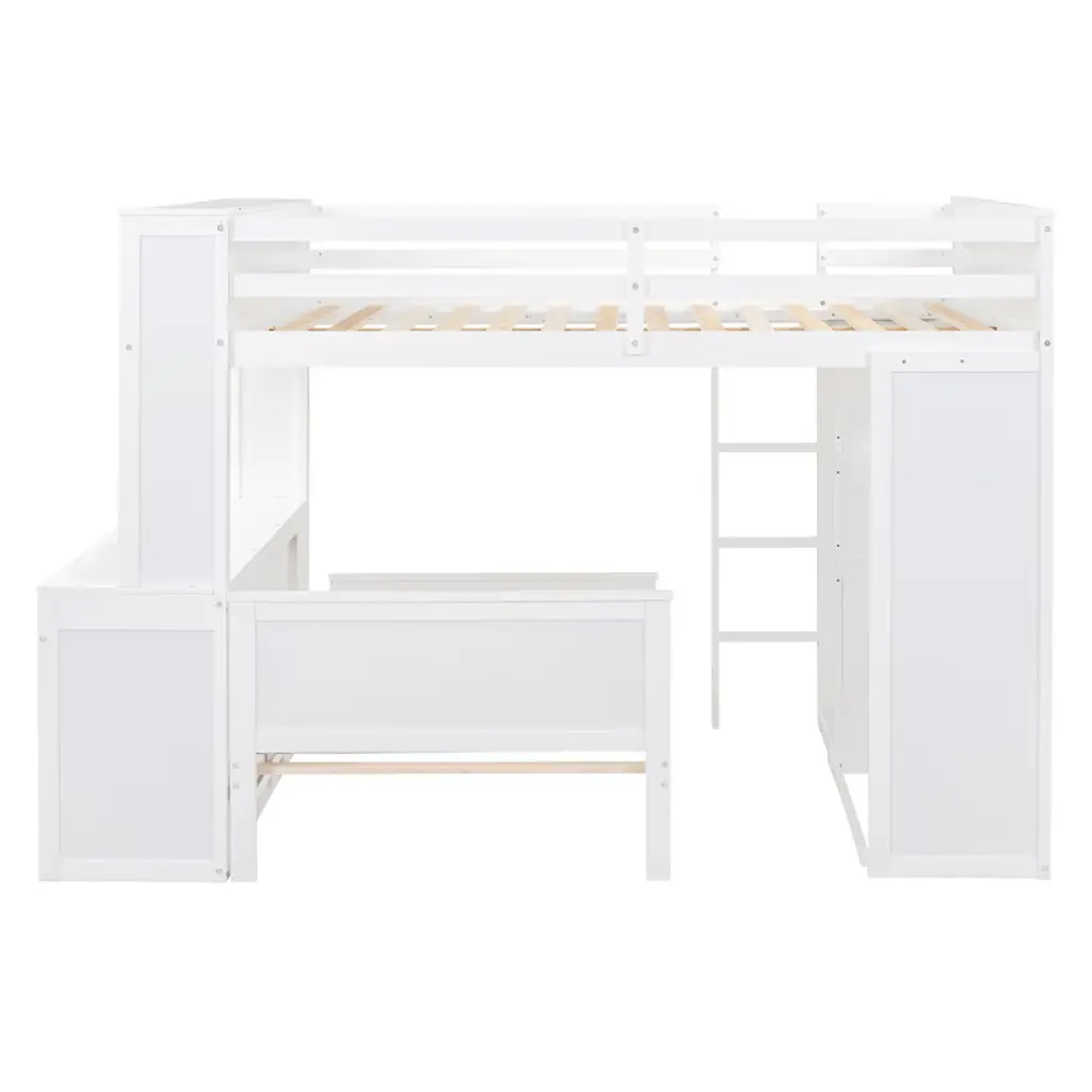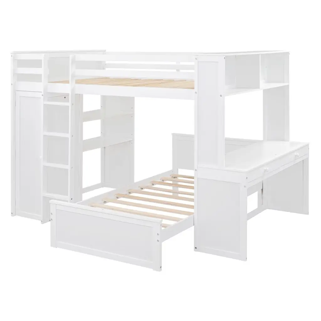 Full Over Twin Bunk Bed With Desk, Solid Wood Bunk Bed With Storage Shelves And Wardrobe, Twin Size Loft Bed With A Stand-alone Bed, White