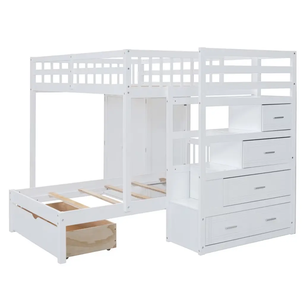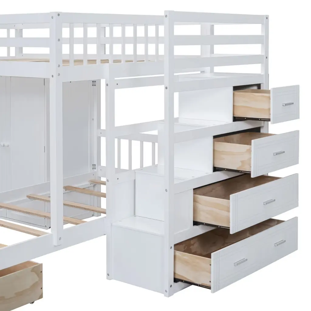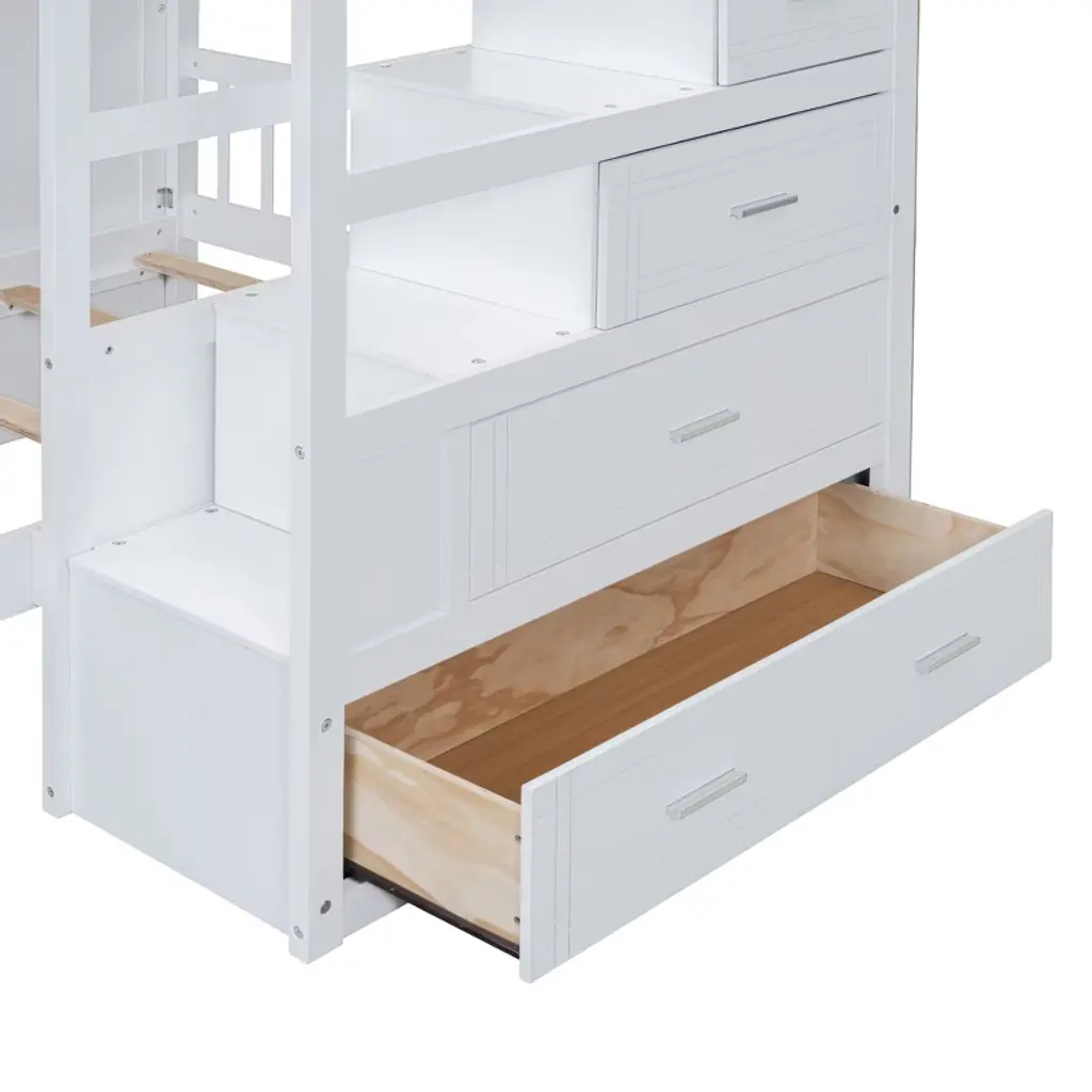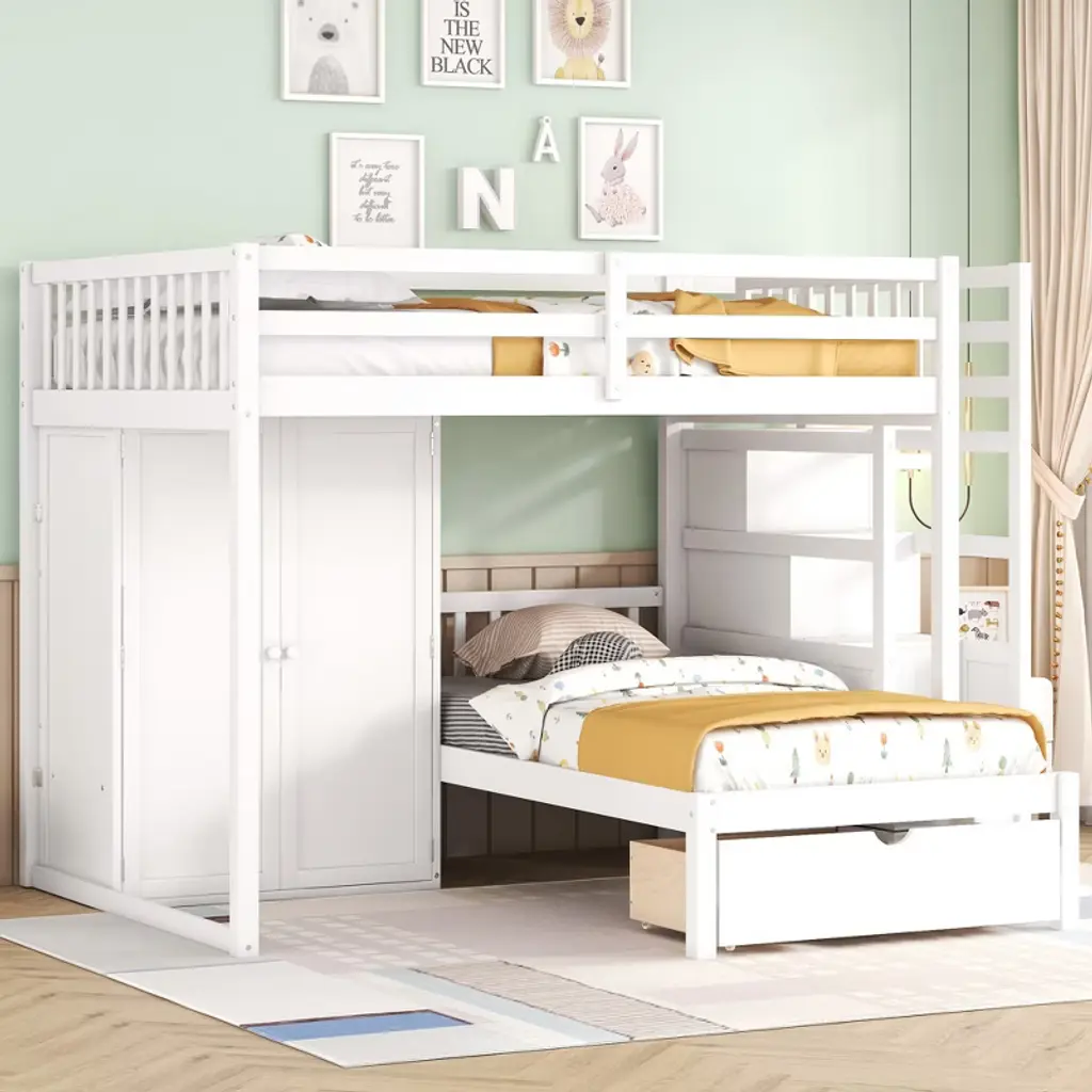 Product Features [Versatile Sleeping Arrangements] With a full-size bed on the top bunk and a twin-size bed below, this bunk bed offers flexible sleeping options for siblings, guests, or sleepovers, ensuring everyone gets a comfortable night's rest.[Storage-Savvy Design] Say goodbye to clutter with built-in storage solutions! The side staircase features four convenient drawers, perfect for stashing away clothes, toys, or bedding. With an additional storage wardrobe included, you can keep linens, clothing, and other items neatly organized and within arm's reach.[Convenient Footboard Drawer] Keep your space tidy and organized with the convenient footboard drawer located at the bottom bunk, ideal for storing pillows, clothing, toys, and more, ensuring everything has its place for a clutter-free environment.[Space-Saving Design] Perfect for smaller bedrooms or shared spaces, our bunk bed's thoughtful design maximizes floor space without sacrificing comfort or style, making it an ideal choice for growing families or anyone looking to make the most of their living area.[Dimensions] 97.9"L x 80"W x 64.6"H. Mattress not included. Some assembly is required, although we have provided clear instructions and tools. Description Keep your space tidy and organized with the convenient footboard drawer located at the bottom bunk, ideal for storing pillows, clothing, toys, and more, ensuring everything has its place for a clutter-free environment. Perfect for smaller bedrooms or shared spaces, our bunk bed's thoughtful design maximizes floor space without sacrificing comfort or style, making it an ideal choice for growing families or anyone looking to make the most of their living area. Weight & Dimensions Overall Product Dimension: 97.9"L x 80"W x 64.6"HNumber of Package: 3Overall Product Weight: 339.15LBSWeight Capacity: Upper bed: 600LBS, Bottom bed: 400LBSRecommended Mattress Thickness: Upper bed: 6", Bottom bed: 6"Recommended age: > 6 years old Specifications Product Type: Bunk BedSize: Full-Over-TwinMaterial: Plywood + MDF + PinewoodNumber of Slats: Upper bed: 14, Bottom bed: 7Notes: Manual measurement has been used, there may be some reasonable error. All the pictures are taken by actual samples, slight chromatic aberration may occur due to lighting or display.