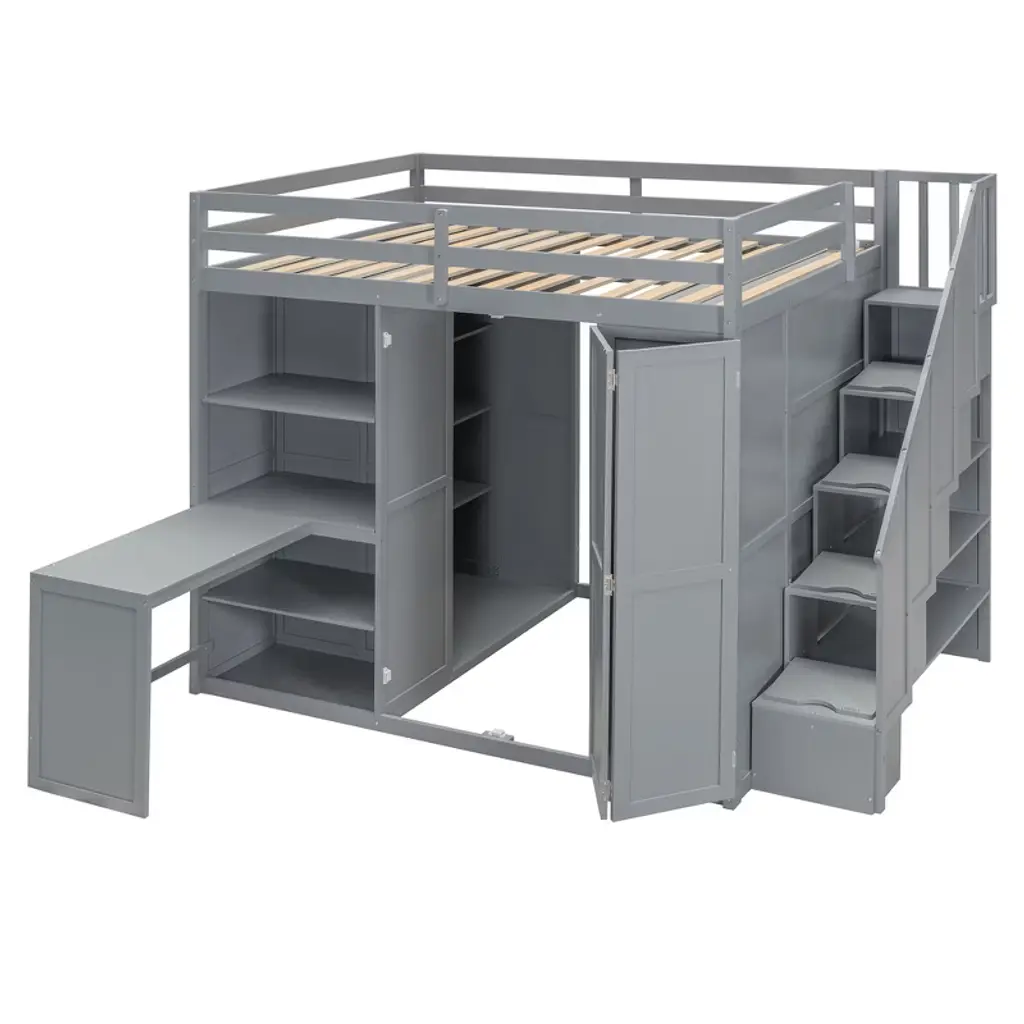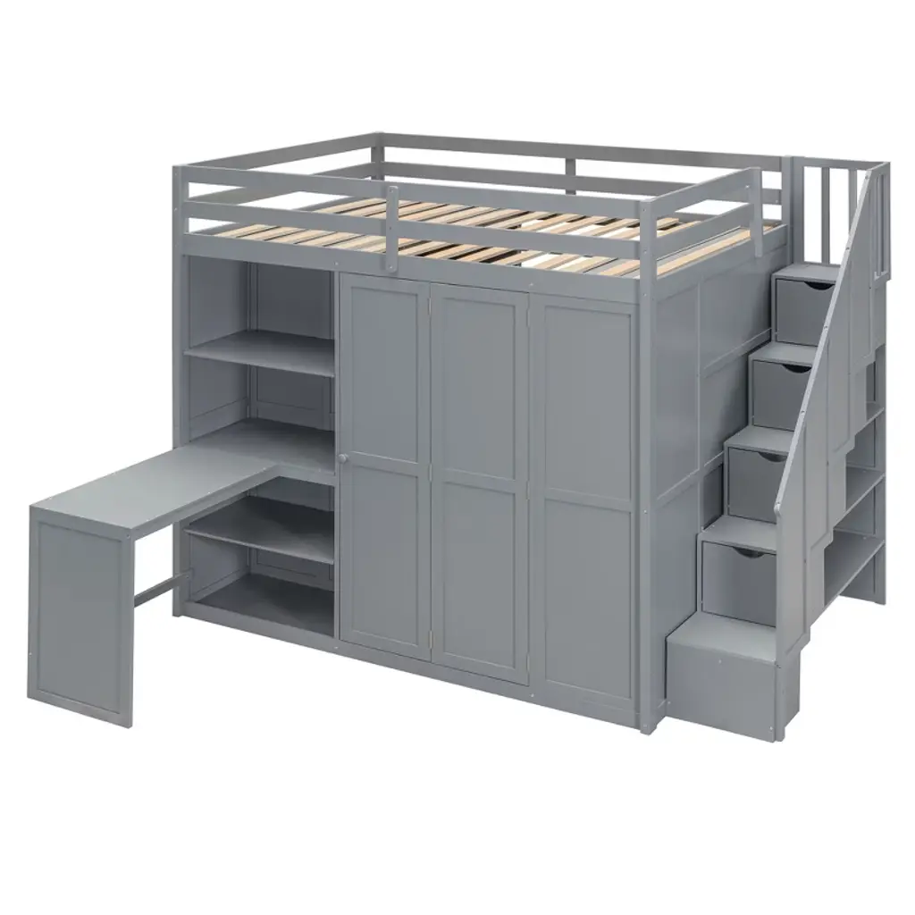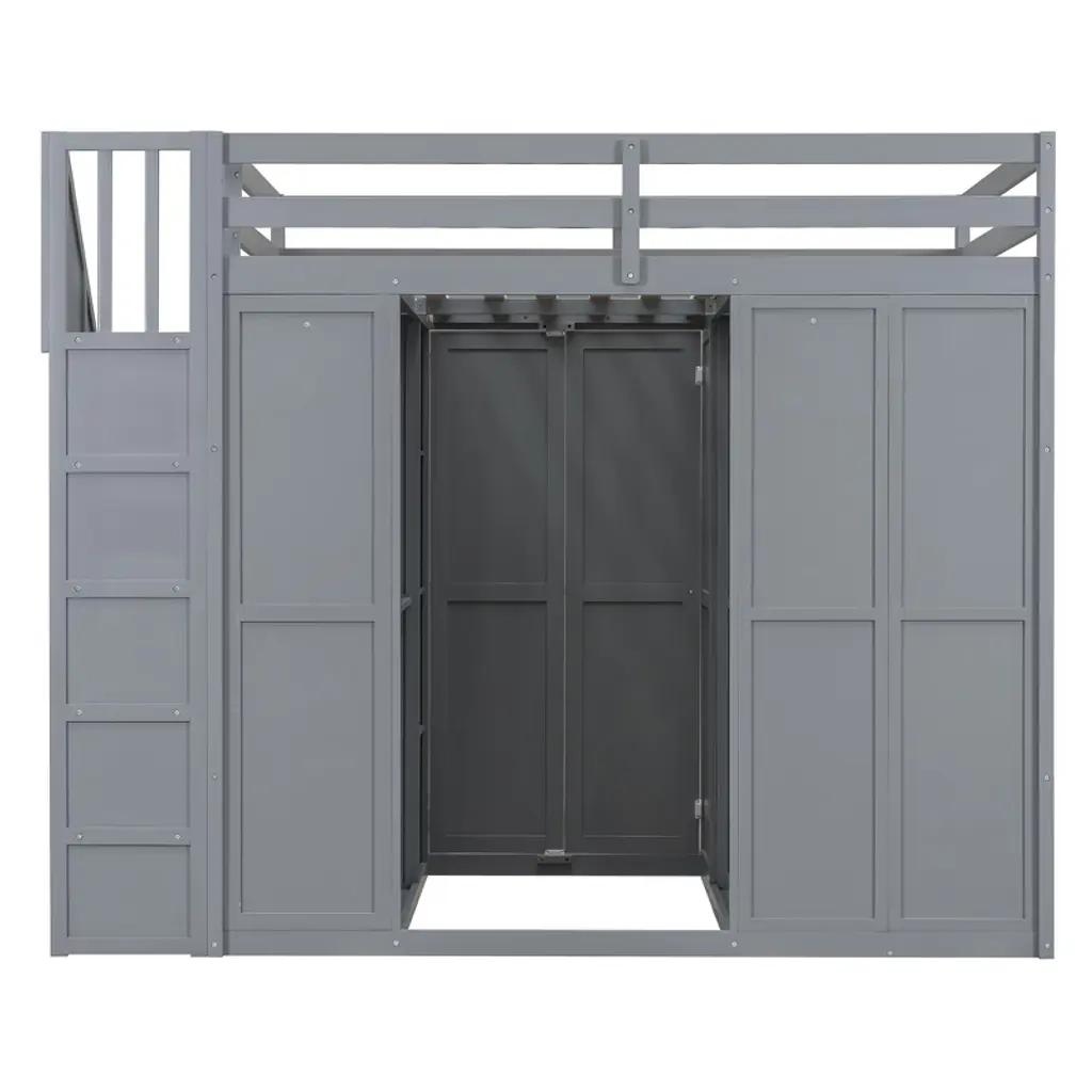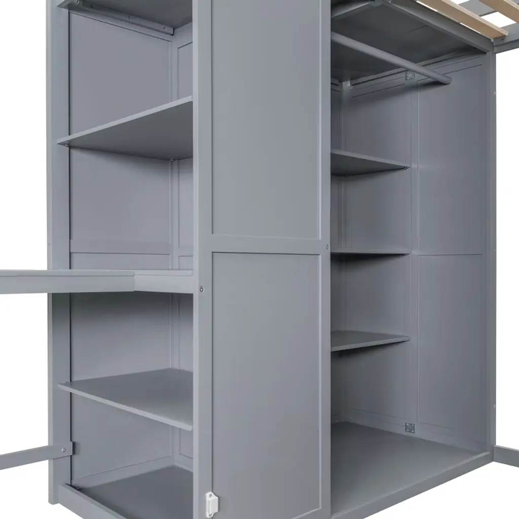 Full Size Loft Bed With Desk And Shelves, Wood Full Loft Bed Frame With Wardrobe, Gray