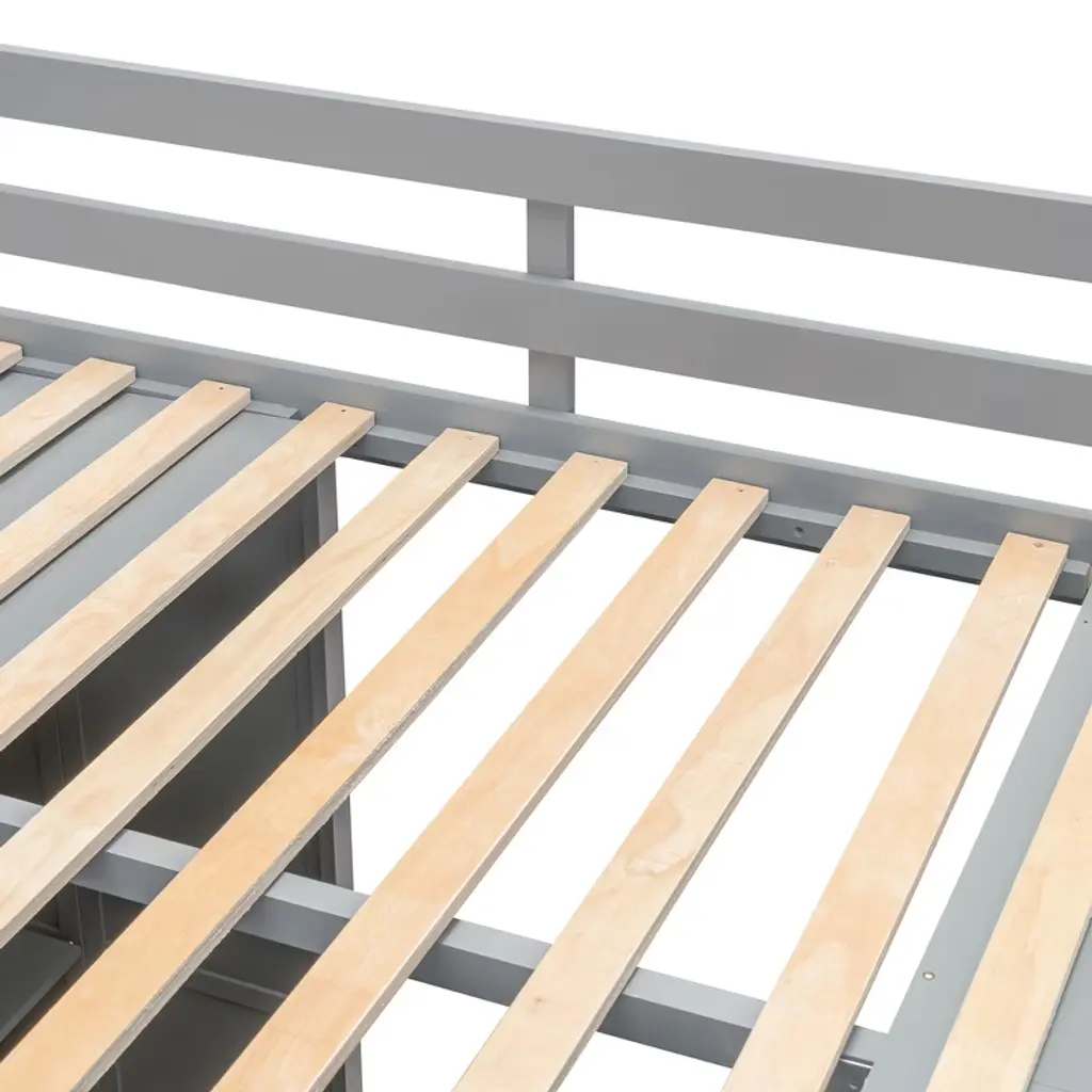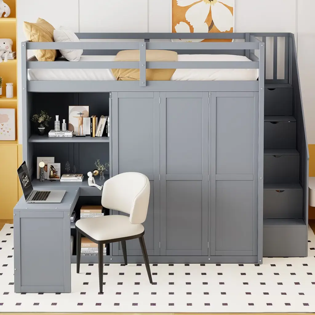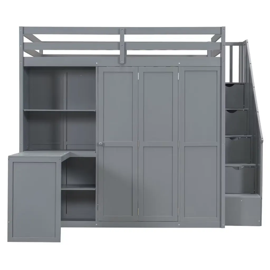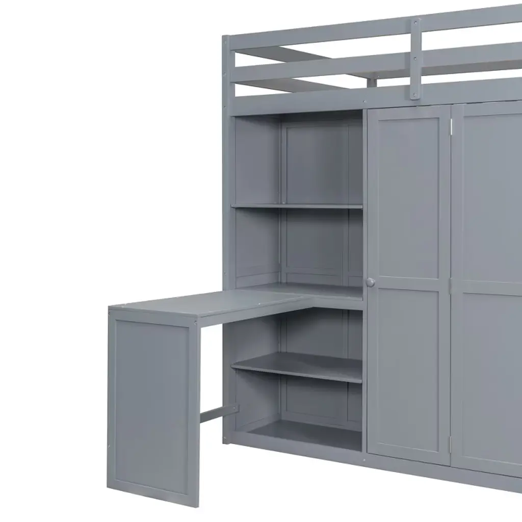 Full Size Loft Bed With Desk And Shelves, Wood Full Loft Bed Frame With Wardrobe, Gray