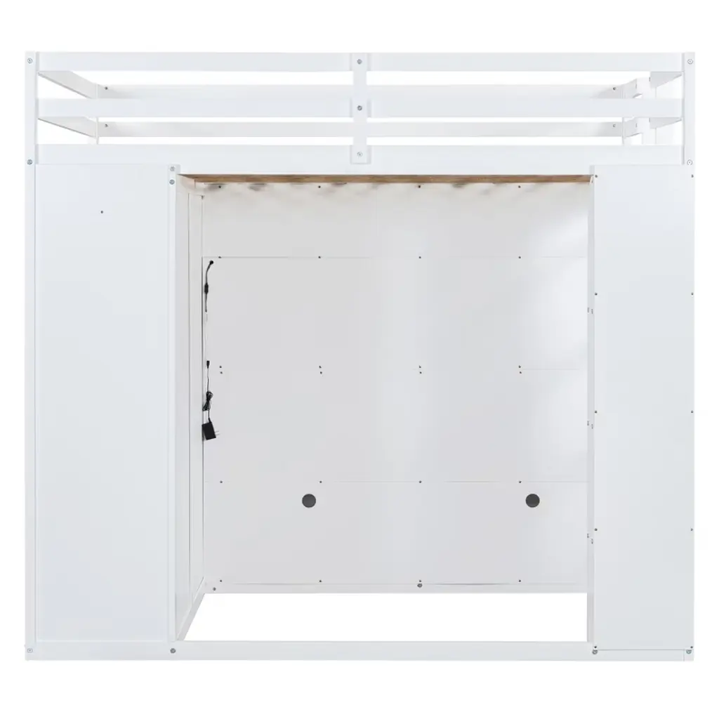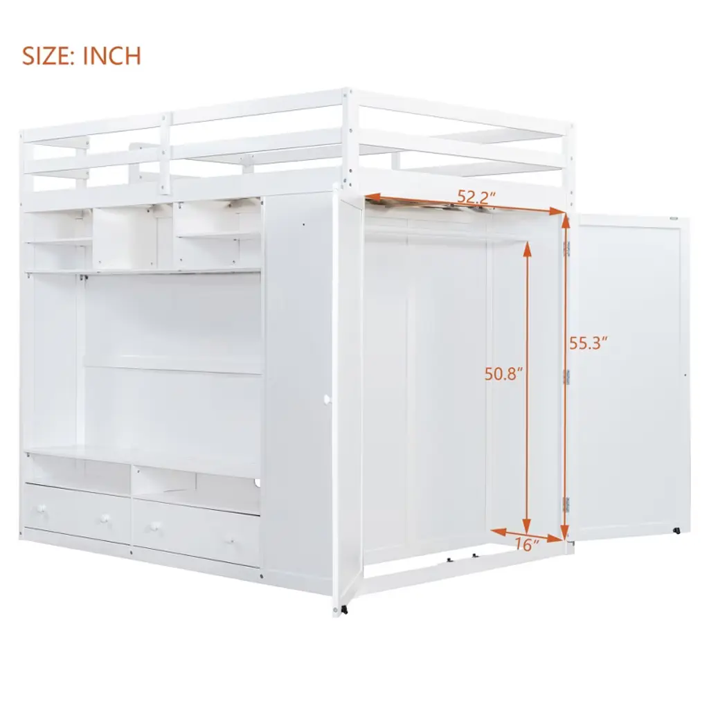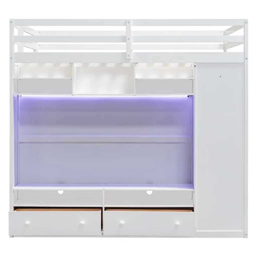 Maximize your space in style with this full size loft bed, designed for both function and flair. Perfect for teens or adults, this multifunctional loft features an open and airy sleeping platform above a thoughtfully crafted storage system below. The side is equipped with a full-length wardrobe for hanging clothes, while two spacious drawers and tiered open shelves offer versatile storage for books, decor, and essentials. Hidden behind the shelves, a large concealed storage compartment provides even more room to keep clutter out of sight. To enhance ambiance and convenience, an integrated LED light strip is included, easily operated by a remote control to adjust brightness and color for the perfect mood. Crafted with durability and modern aesthetics in mind, this loft bed turns any bedroom into a smart, organized, and visually appealing living space.
