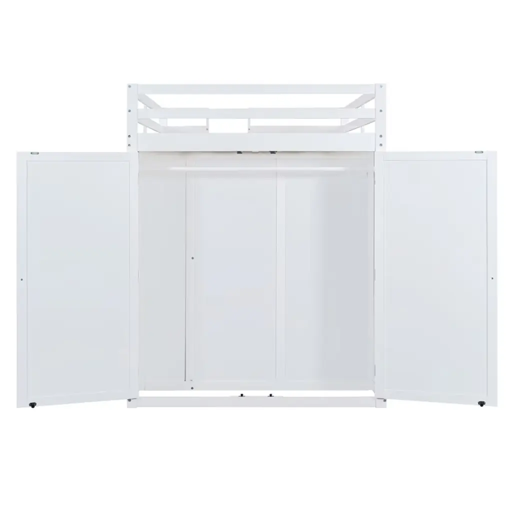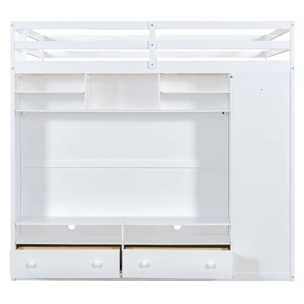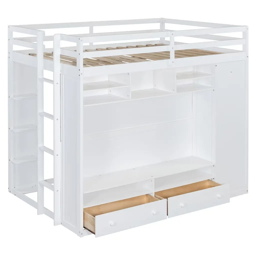 Maximize your space in style with this full size loft bed, designed for both function and flair. Perfect for teens or adults, this multifunctional loft features an open and airy sleeping platform above a thoughtfully crafted storage system below. The side is equipped with a full-length wardrobe for hanging clothes, while two spacious drawers and tiered open shelves offer versatile storage for books, decor, and essentials. Hidden behind the shelves, a large concealed storage compartment provides even more room to keep clutter out of sight. To enhance ambiance and convenience, an integrated LED light strip is included, easily operated by a remote control to adjust brightness and color for the perfect mood. Crafted with durability and modern aesthetics in mind, this loft bed turns any bedroom into a smart, organized, and visually appealing living space.