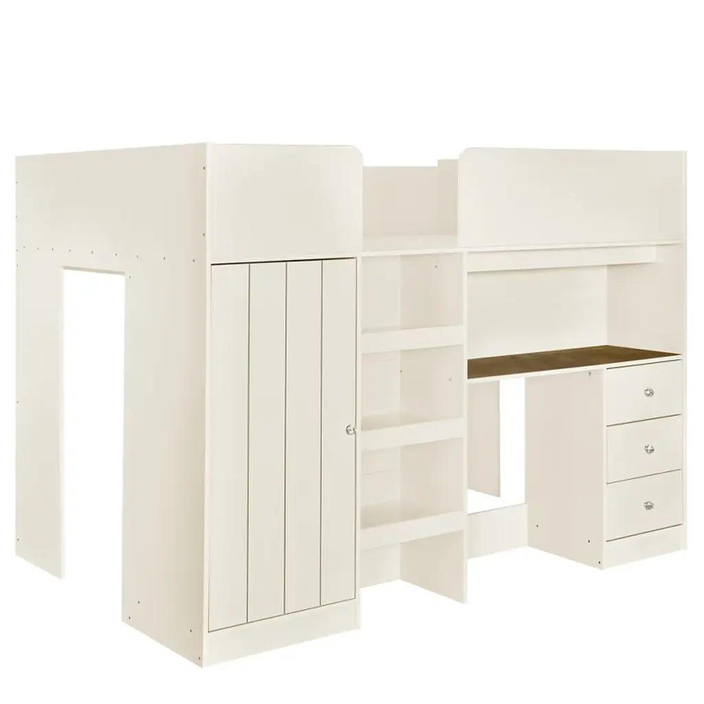 This loft bed is made of pinewood and MDF board, which has good stability and safety and can withstand high-weight play without dangerous swings. Equipped with wardrobe underneath the bed, storage shelves and 3 drawers add storage functions. The 39.4'' x 15.4'' desk provides you with a place to work or do homework.Product Detail:- Product Type:Loft Bed- Size:Full- Overall Product Dimension:76.4"L x 55.3"W x 59"H- Overall Product Weight:335 LBS- Detail Dimension: Please refer to the Size picture- Weight Capacity: 330 LBS- Material: Pine Wood+MDF- Recommended Mattress Thickness: 8'' (The mattress is not included)- Number of Packages: 3 (Packages shipped separately may not arrive at the same time, please be patient.)- Assembly Required:YesWhat's in the box:- Bed * 1- Tools included- Instruction manual