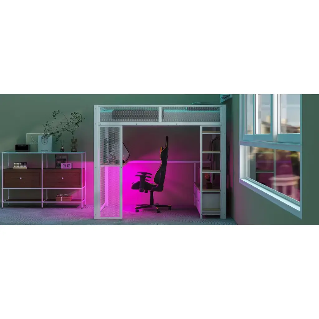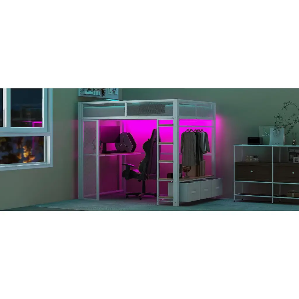 Full Size Metal Gaming Loft Bed With Led And Desk, Heavy Duty Loft Bed Frame With Open Wardrobe And 3 Linen Storage Drawers, White