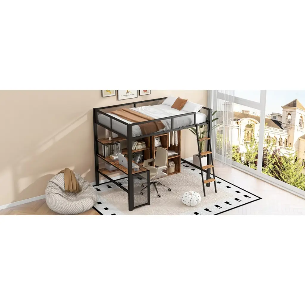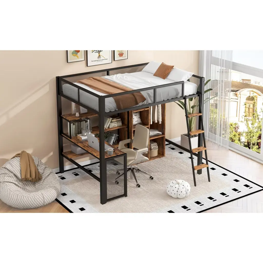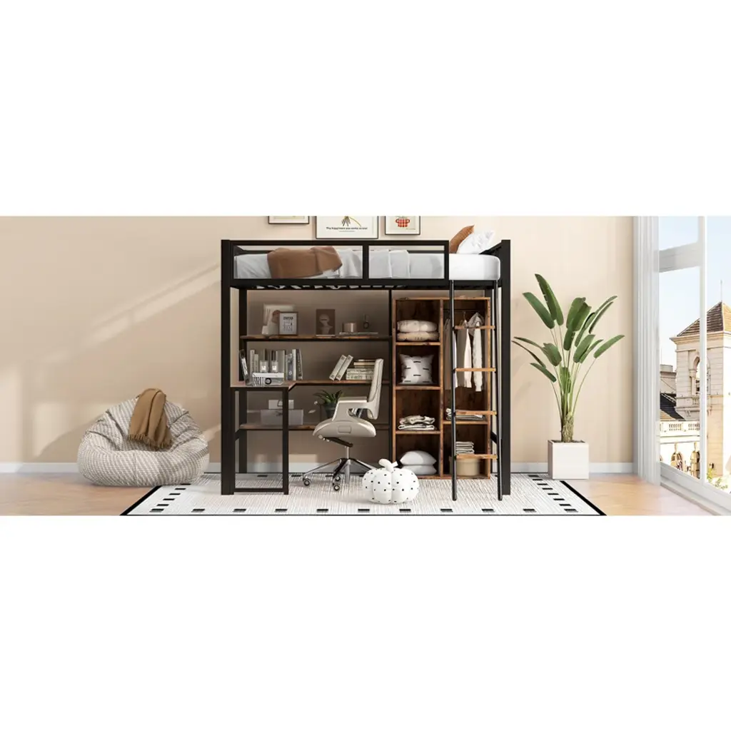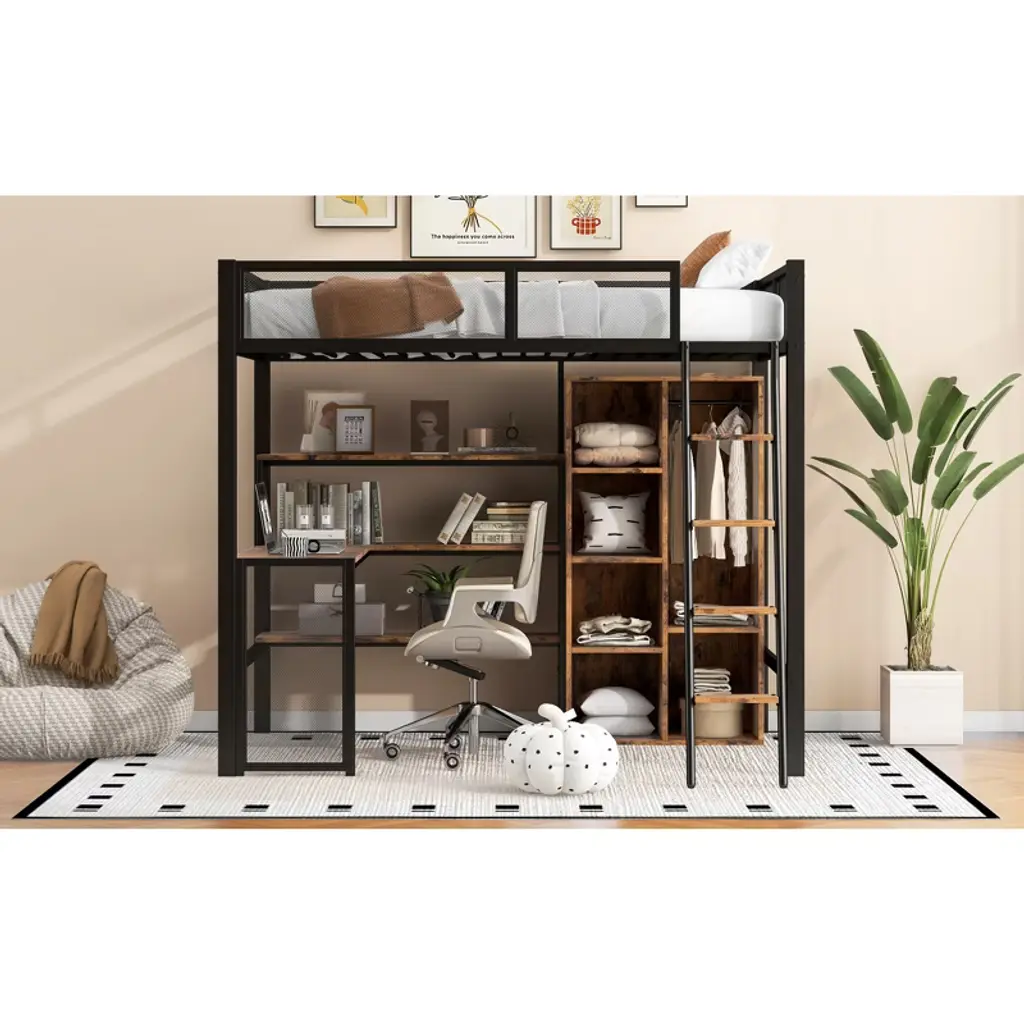 Full Size Metal Loft Bed With Built-in Desk, Wardrobeand Shelves