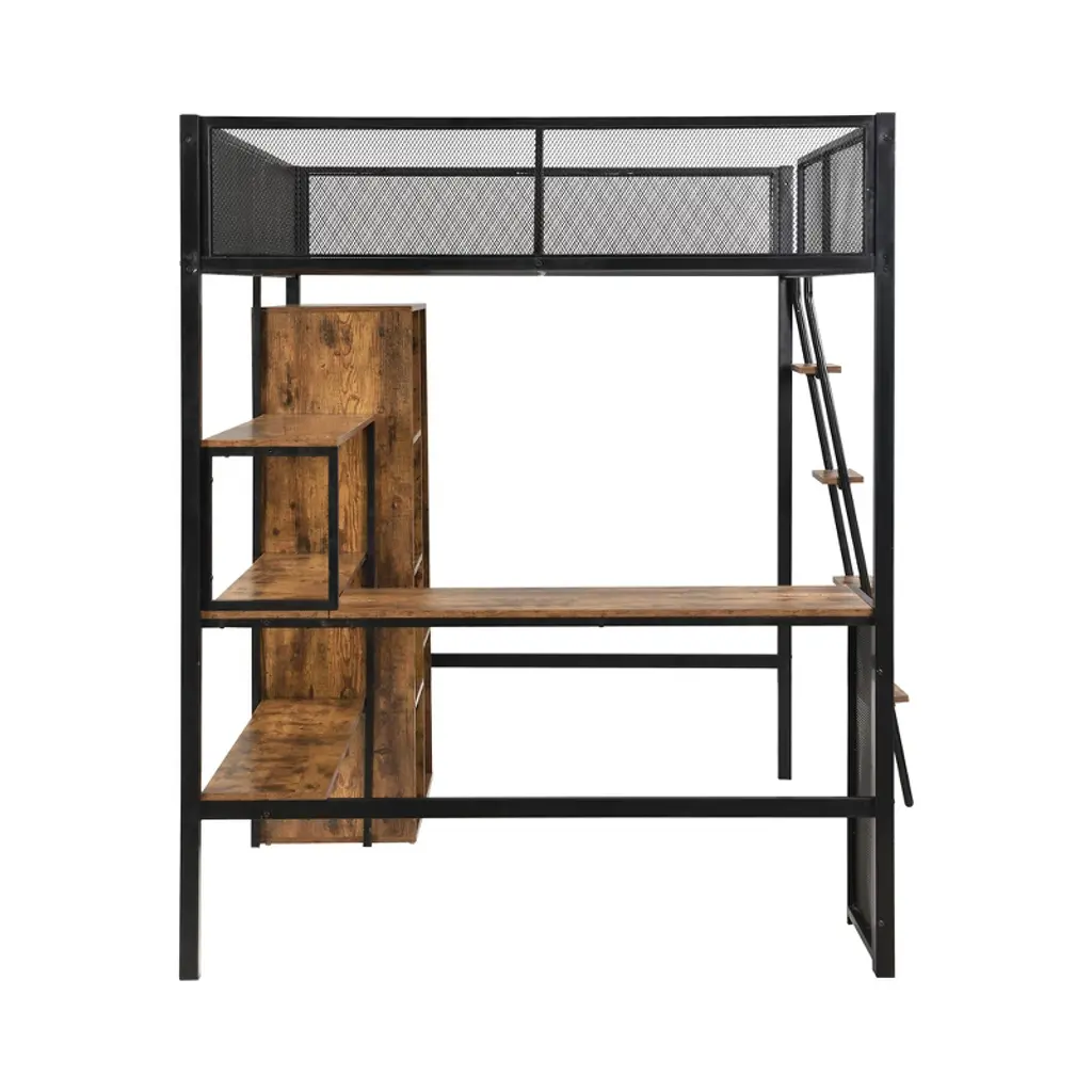 Product Features [Sturdy Metal Frame] Strong metal frame that includes an integrated ladder, full-length guardrails and secured metal slats to ensure security and stability.[4 in 1 Design] Comes with a built-in desk, a 3-tier shelf and storage wardrobe. This loft bed is a space-saving design. You can complete your work and life with it.[Safety and Guarantee] The upper bunk bed is equipped with a full-length mesh guardrail to prevent accidental falls. The ladder fits tightly with the bed, making it easy to get on and off without shaking.[Modern Style] Crafted of metal and MDF in a clean painted finish, this bed strikes a clean-lined silhouette with a horizontal slatted headboard and footboard, matching guard rail.[No Box Spring Needed] Due to the system of metal slats, no box spring is required — simply top with the standard mattress of your choice. Description If your bedroom is in dire need of a versatile bed right now, then our metal loft bed is the perfect choice for you. The full-size upper bed provides plenty of room to sleep and unwind. The design of the built-in desk under the bed is good for saving space and facilitating your work and study. The sturdy metal material and simple black color design make this bed very eye-catching in the bedroom. Material: Metal + MDF Size: Full Numbers of Package: 2 Spring Box: No need Assembly Required: Yes Dimensions Overall Product Dimension: 78''L x 56.1''W x 69.3''HFull Bed: 74.8'' x 53.9''Total Height: 69.3''Recommend Mattress Thickness of Bed: 6''Overall Product Weight: 198lbsBed Weight Capacity: 400lbs