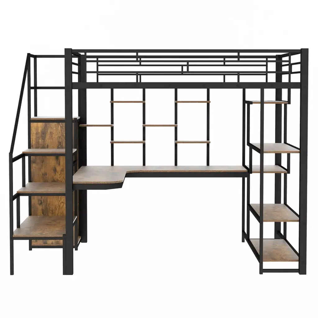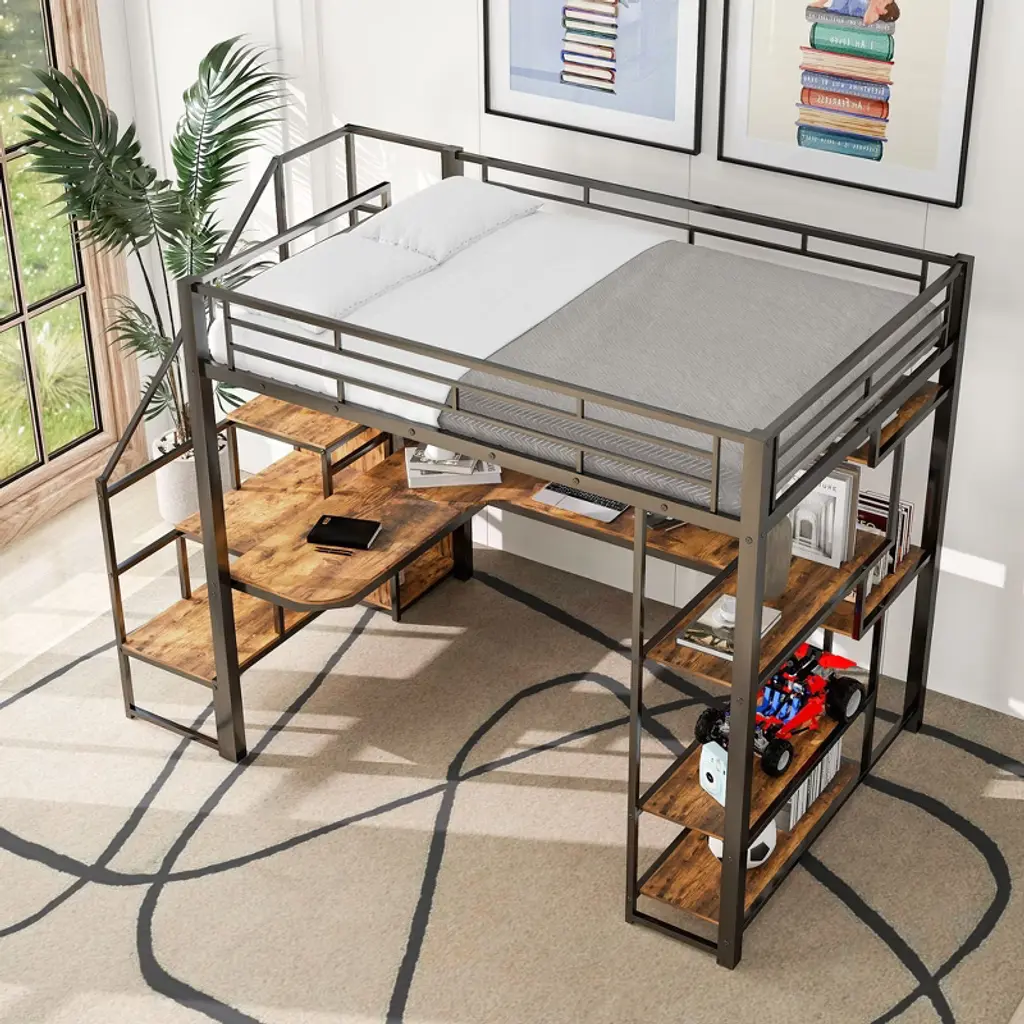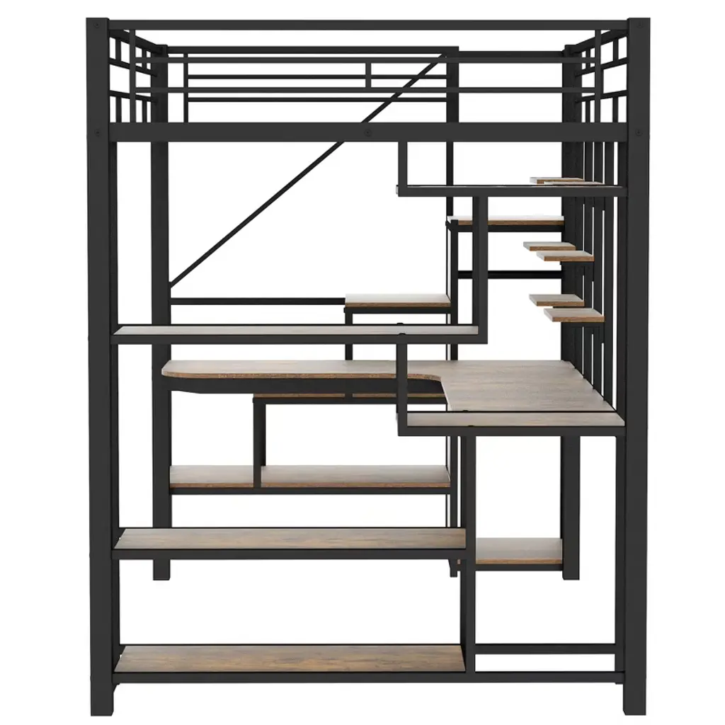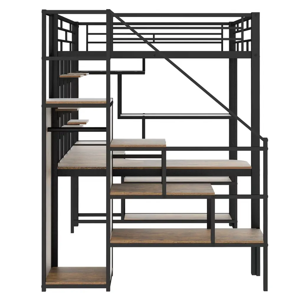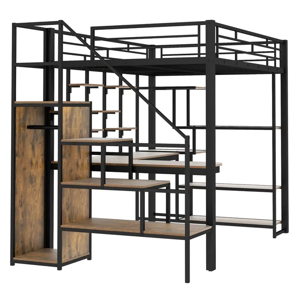 Full Size Metal Loft Bed With Desk And Small Wardrobe, Full High Loft Bed With Storage Staircase And Shelves For Kids Teens Adults, Black