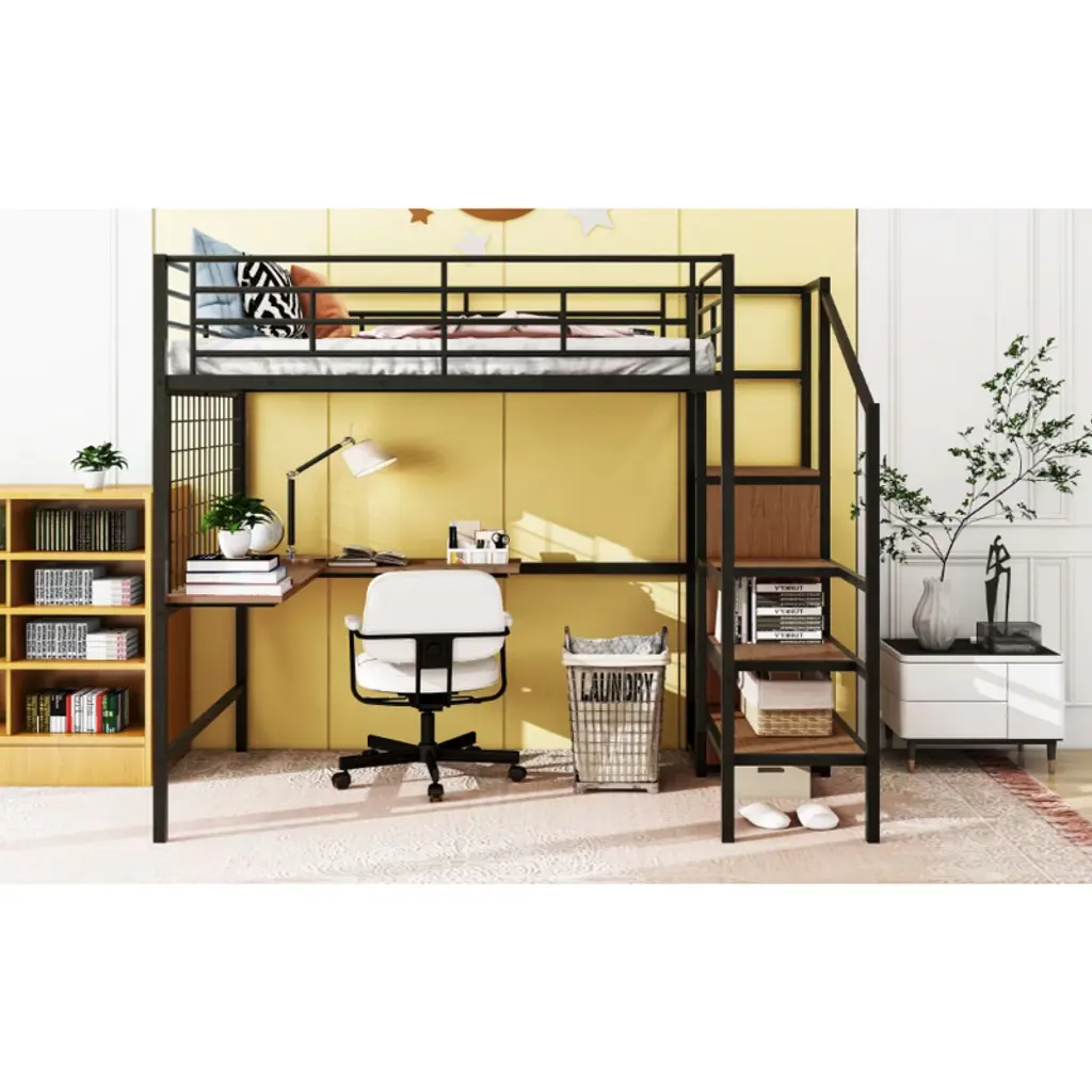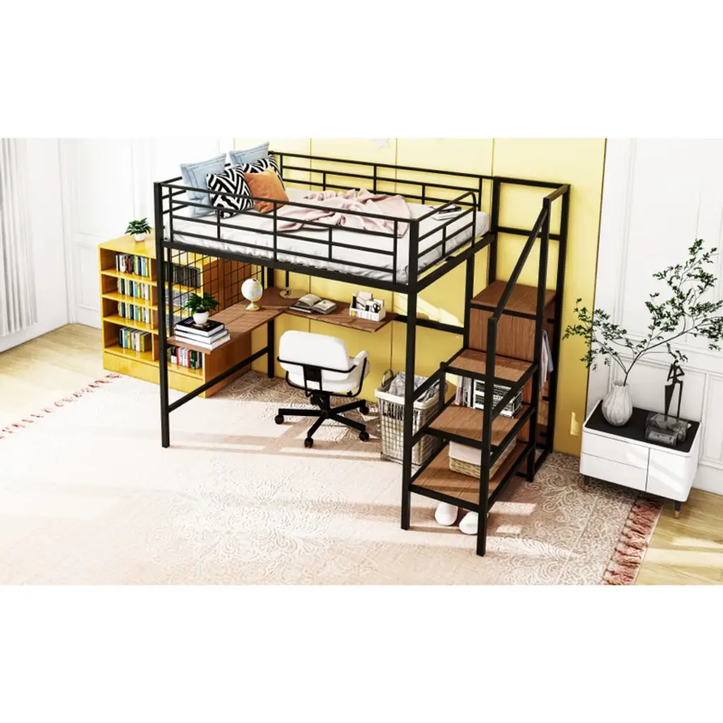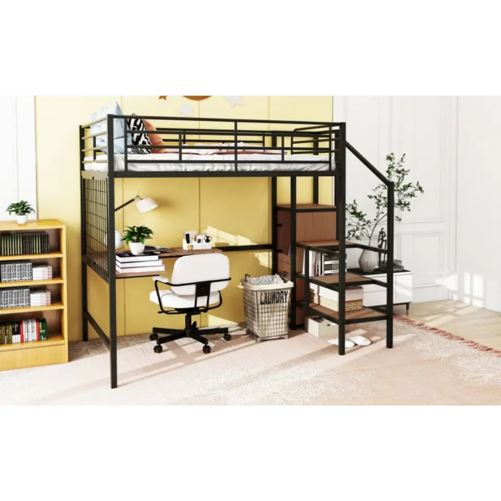 Product Features [Modern Style] Crafted of metal in a clean painted finish, this bed strikes a clean-lined silhouette with a horizontal slatted headboard and footboard, matching guard rail. The raised base creates a cozy loft space for storage or play.[Feature] This metal loft bed is made with sturdy metal and has a clean-cut silhouette that can be matched with any room decor. The most special design is that it contains a metal grid, which can hang some decorations, photos, etc.[Space Saving] The lateral 3-layers ladder of the loft bed can be used as shelves to lay out home items for you. And the wardrobe underneath the ladder is an elegant design which offer you space to store everyday clothes. It will definitely save plenty of space for you.[Versatility galore] Equipped with a L-shape desk underneath, this bed definitely offers you a comfortable place to work, read and enjoy yourself.[Dimensions] Overall Product Dimension: 94.1"L x 56"W x 67.9"H. Mattress us not included. Some assembly is required, although we have provided clear instructions and tools. Descriptions This Full size metal loft bed with desk is made with sturdy metal and has a clean-cut silhouette that can be matched with any room decor. The lateral 3-layers ladder of the loft bed can be used as shelves to lay out home items for you. And the wardrobe underneath the ladder is an elegant design which offer you space to store everyday clothes. It will definitely save plenty of space for you. And Equipped with a L-shape desk underneath, this bed definitely offers you a comfortable place to work, read and enjoy yourself. This loft bed will be a beautiful and practical piece in your bedroom. Weight & Dimensions Overall Product Dimension: 94.1"L x 56"W x 67.9"HNumber of Package: 2Overall Product Weight: 141.1 LBSPackage Dimension: Please refer to the SpecificationDetail Product Dimension: Please refer to the Size imageWeight Capacity: 250 LBSRecommended age: 6+Recommended Mattress Thickness: 4-6" Specifications Product Type: Loft BedSize: FullMaterial: MDF+MetalNumber of Slats: 20Notes: Manual measurement has been used, there may be some reasonable error. All the pictures are taken by actual samples, slight chromatic aberration may occur due to lighting or display.