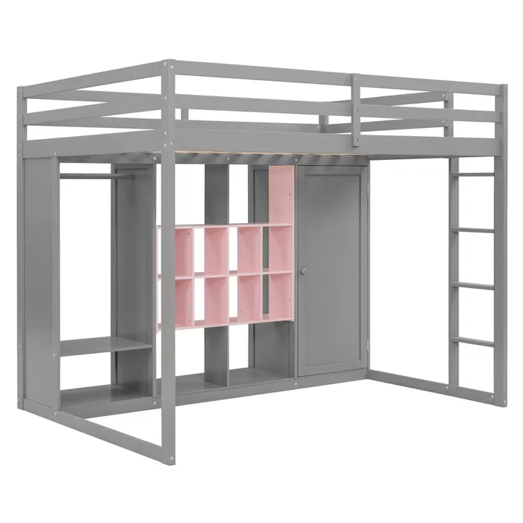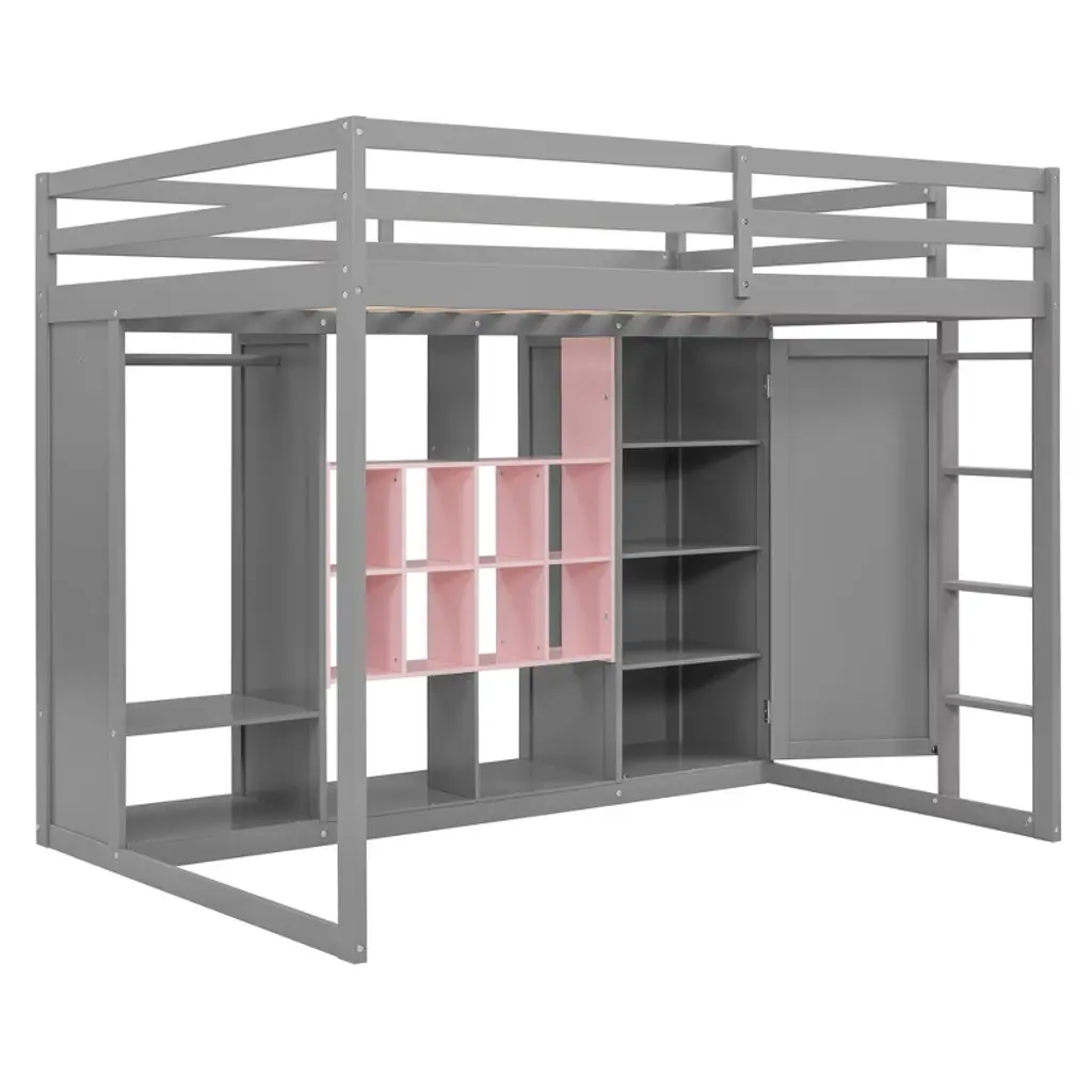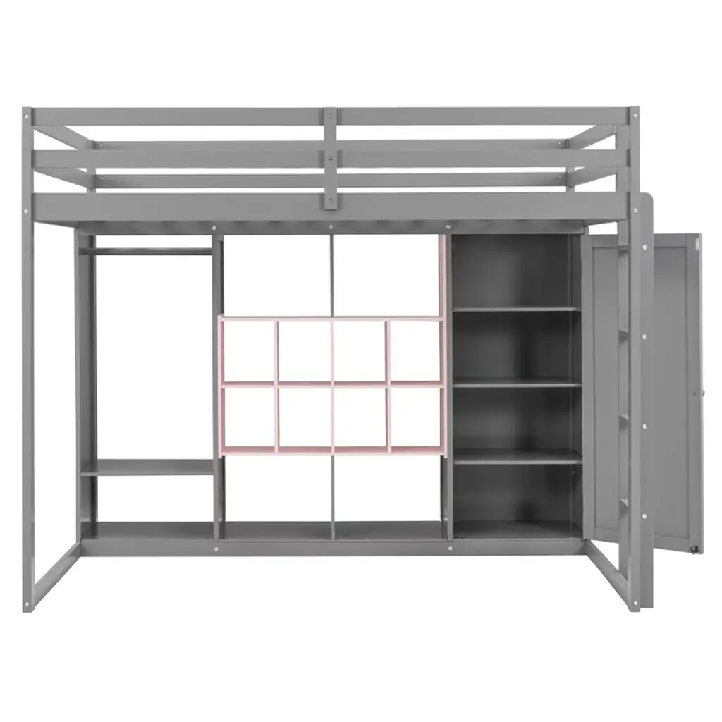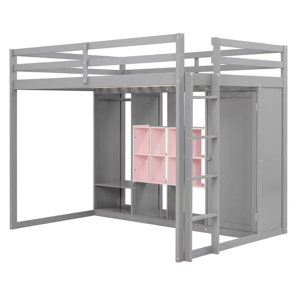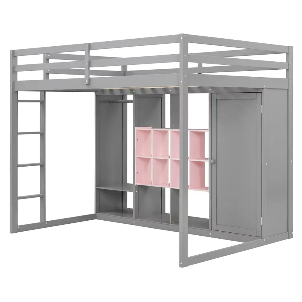 Product Features Smart Storage Solution: Comes with an open wardrobe, vibrant shelves, and a closed cabinet, offering diverse options to store clothes, toys, books, and more in one compact unit. Ideal for maximizing vertical space, this loft bed combines sleeping, storage, and organization functions—perfect for small bedrooms or shared spaces.Colorful & Stylish Design: The contrast between the bed’s wooden frame and the lively colored shelves creates a chic, modern look that brightens any room decor.Reversible Staircase: The ladder can be installed on the left or right side, giving you flexibility to match different room layouts.Safe and Sturdy Structure: Crafted from high-quality wood with strong bed slats and full-length guardrails to ensure long-lasting durability and maximum safety for teens.Dimensions & Assembly: 78.3"L x57.6"W x 65"H. Mattress not included. Some assembly is required, although we have provided clear instructions and tools. Descriptions Maximize your space with this stylish and functional wooden loft bed, perfect for modern bedrooms with limited square footage. Designed with both safety and storage in mind, it features full-length guardrails and sturdy slats for reliable mattress support. The bed includes a vibrant multi-layer shelving system, a sleek open wardrobe, and a closed cabinet—offering ample storage for clothes, books, and essentials. The colorful shelving adds a bold pop of personality while blending harmoniously with the bed’s elegant wood finish. With a reversible staircase that can be installed on either side, this loft bed adapts easily to your room layout and daily habits. Weight & Dimensions Product Type: Loft BedProduct material: Plywood+MDF+PinewoodThe number of slats: 14Weight Capacity: 600LBSRecommended Mattress Thickness: 4-6"Recommended age: Over 6 yearsBox Spring Required: NoMattress Included: NoIs installation required: YesNotes: Manual measurement has been used, there may be some reasonable error. All the pictures are taken by actual samples, slight chromatic aberration may occur due to lighting or display.