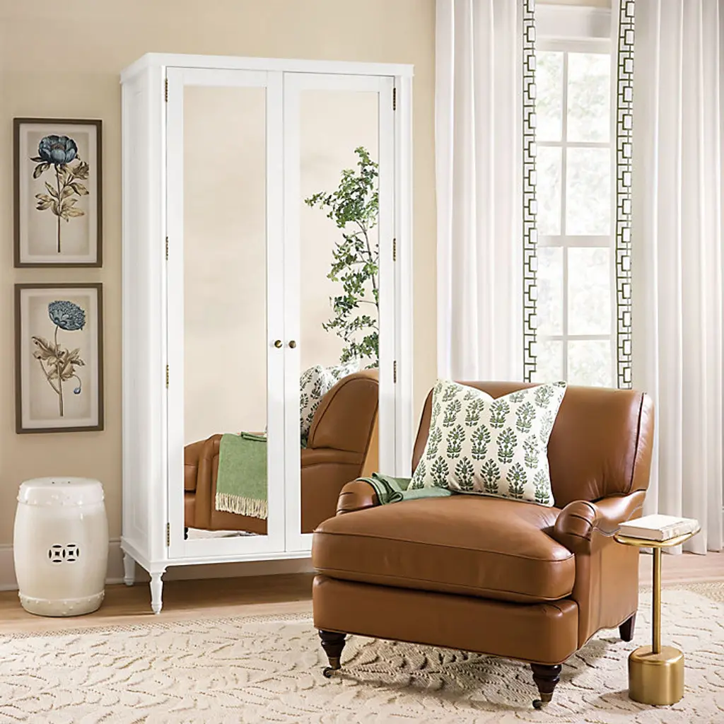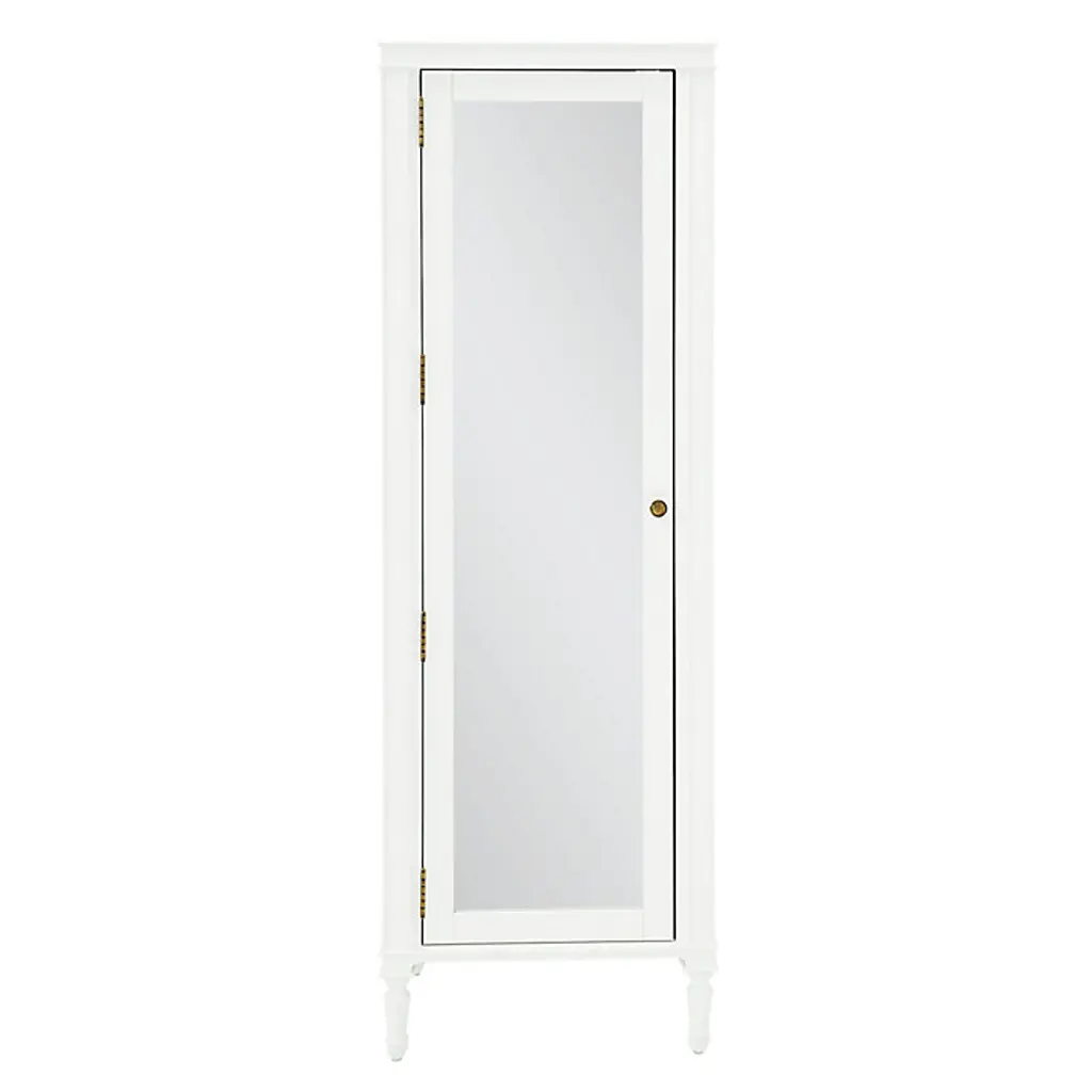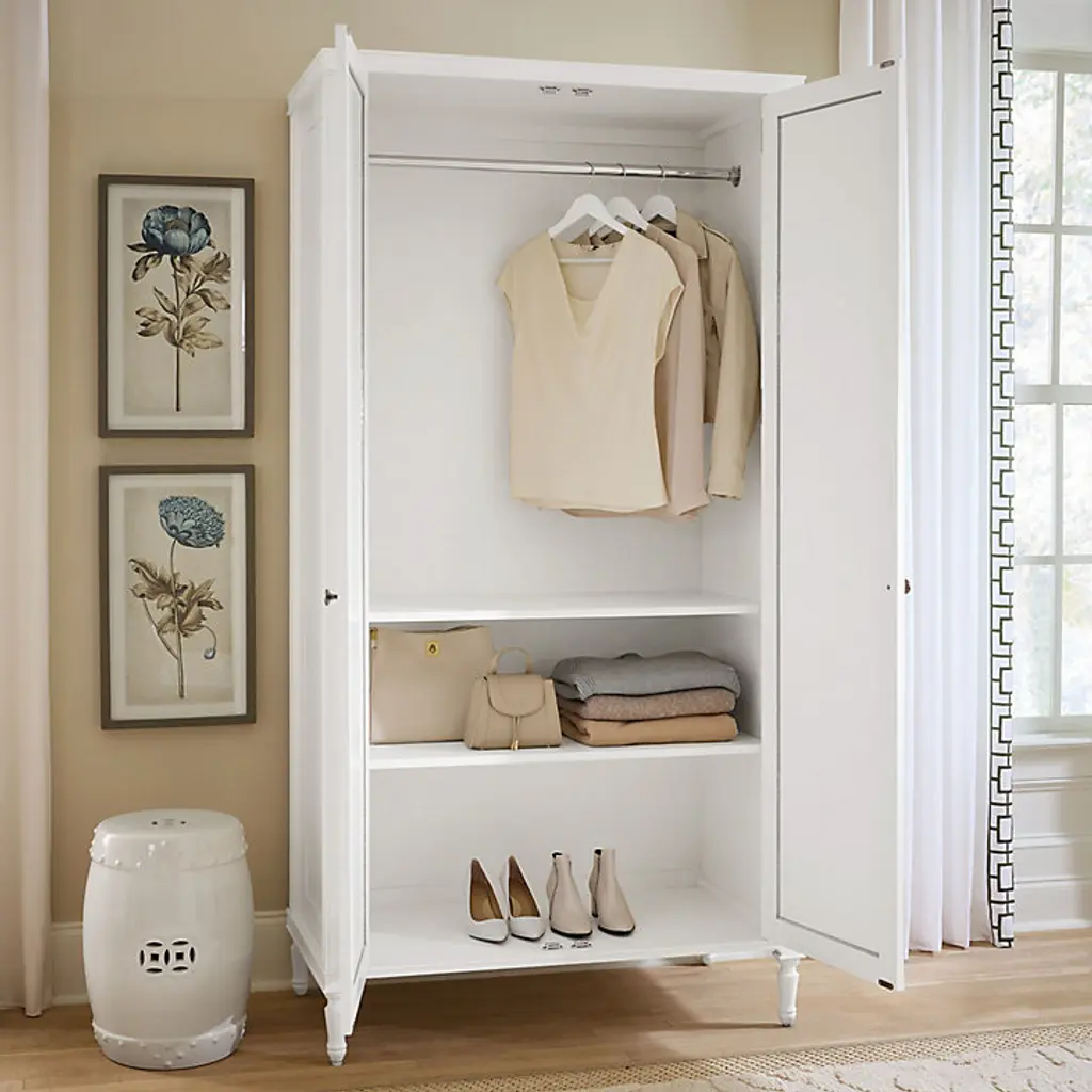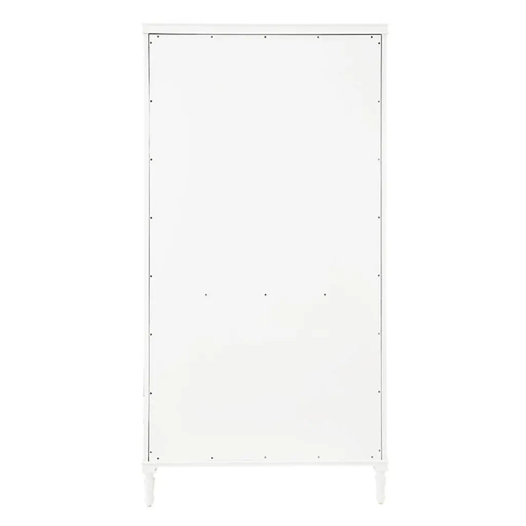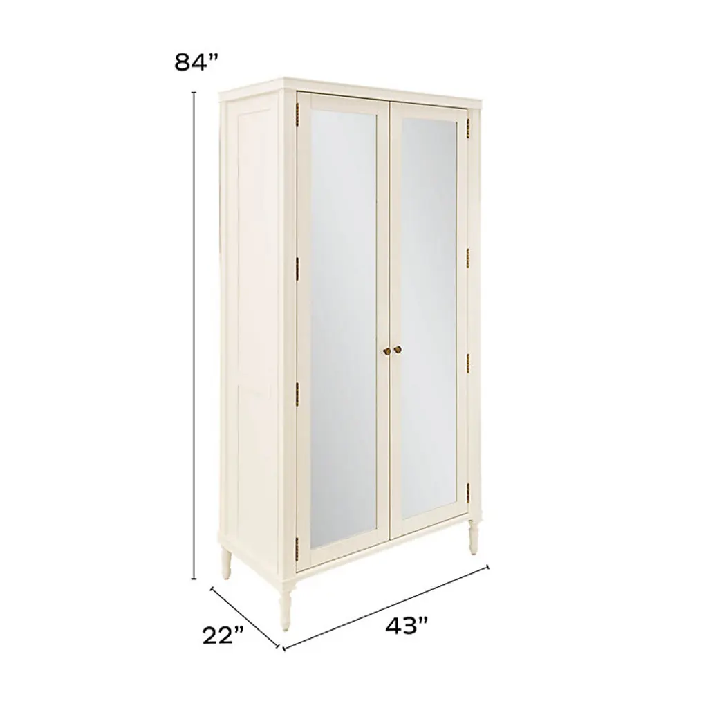 Inspired by classic Louis XVI styling, our Gabriella Bedroom Collection rekindles the dream of old world romance. The subtly feminine silhouettes are hand crafted of hardwood with fresh white finish and inset panels framed in smooth pencil molding. Slender tapered, turned legs elevate each piece in this timeless bedroom ensemble for a light, elegant look. This Armoire features full-length mirrored doors that open with petite brass knob pulls. Inside, three adjustable shelves and one fixed shelf accommodate stacks of folded clothing. Top three shelves remove to make room for the included hanging bar. Gabriella Mirrored Armoire features:
