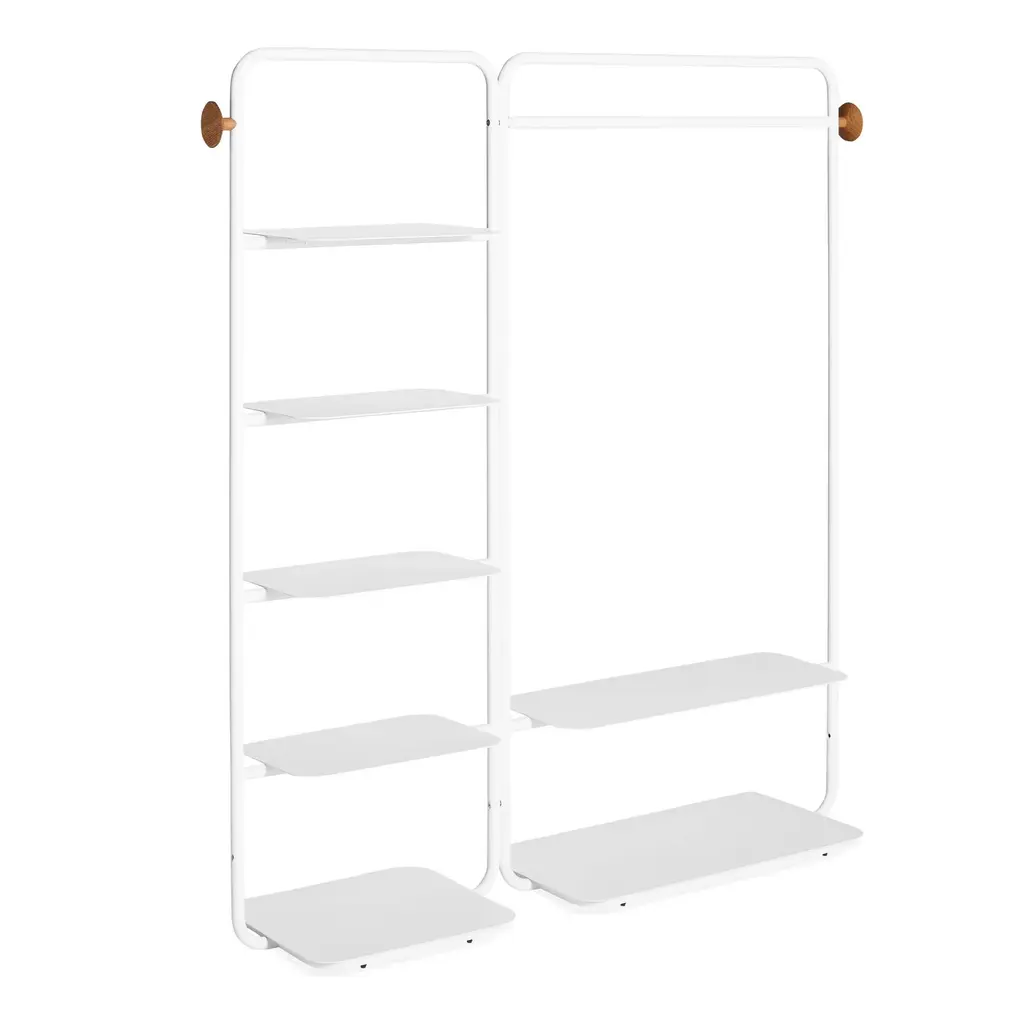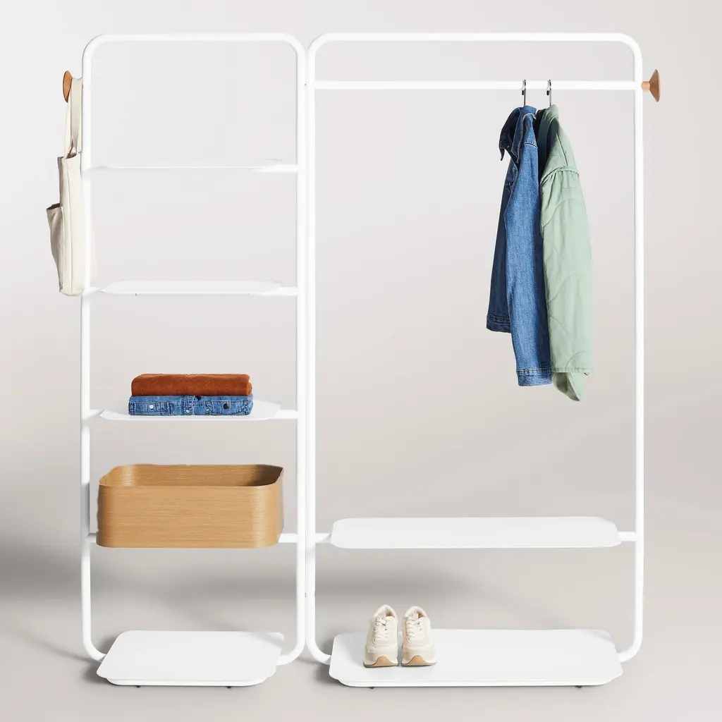 Show your clothes a good time. Garden Party is the perfect storage for people who have no storage. Durable powder-coated steel creates a clean and quiet spot to stage outfits or showoff your full regalia. Solid white oak knobs provide an extra spot to hang accessories. Garden Party Storage Boxsold separately.