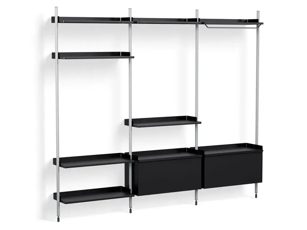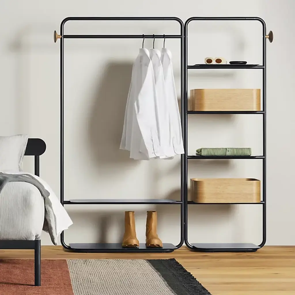 The Garden Party Wardrobe System from Blu Dot keeps your wardrobe organized in style. This contemporary clothing storage solution features an open steel frame with rounded edges for a streamlined look. The adjoining vertical frames provide ample space to hang shirts, dresses, and more, while the platforms serve as shelving to neatly store folded garments, accessories, and extra items. Solid white oak knobs interspersed between the racks add even more spots for hanging ties, scarves, or lightweight layers