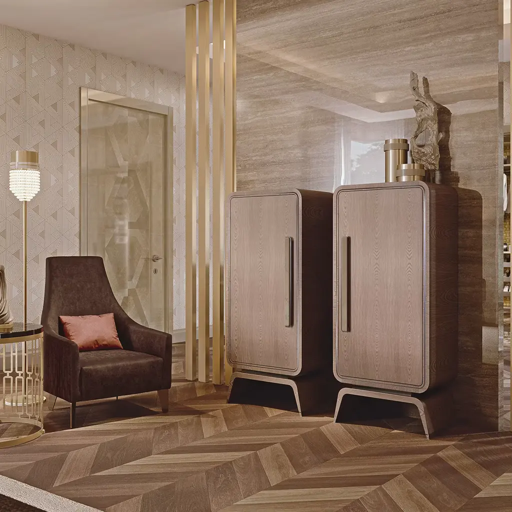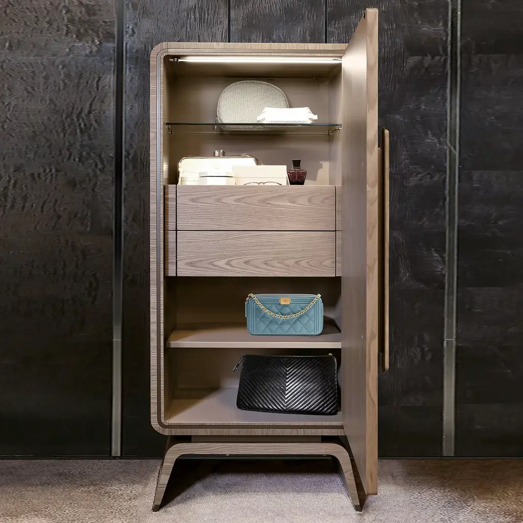Personalize a contemporary bedroom with the fully customizable Hanami Natural Mood Wardrobe. Crafted in wood, the wardrobe is available in a wide variety of veneers, shown here in Polyester Olmo with a matte finish. With strip metal detailing to emphasize the shape, the wardrobe has two internal soft-close drawers with faux nubuck dividers. Right and left door available.