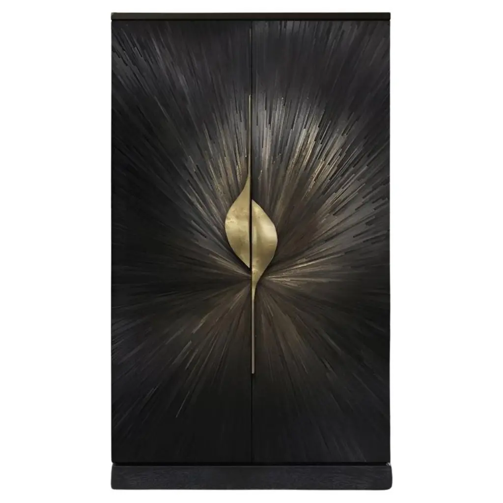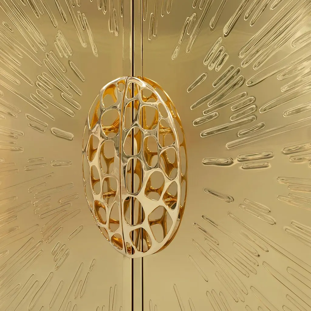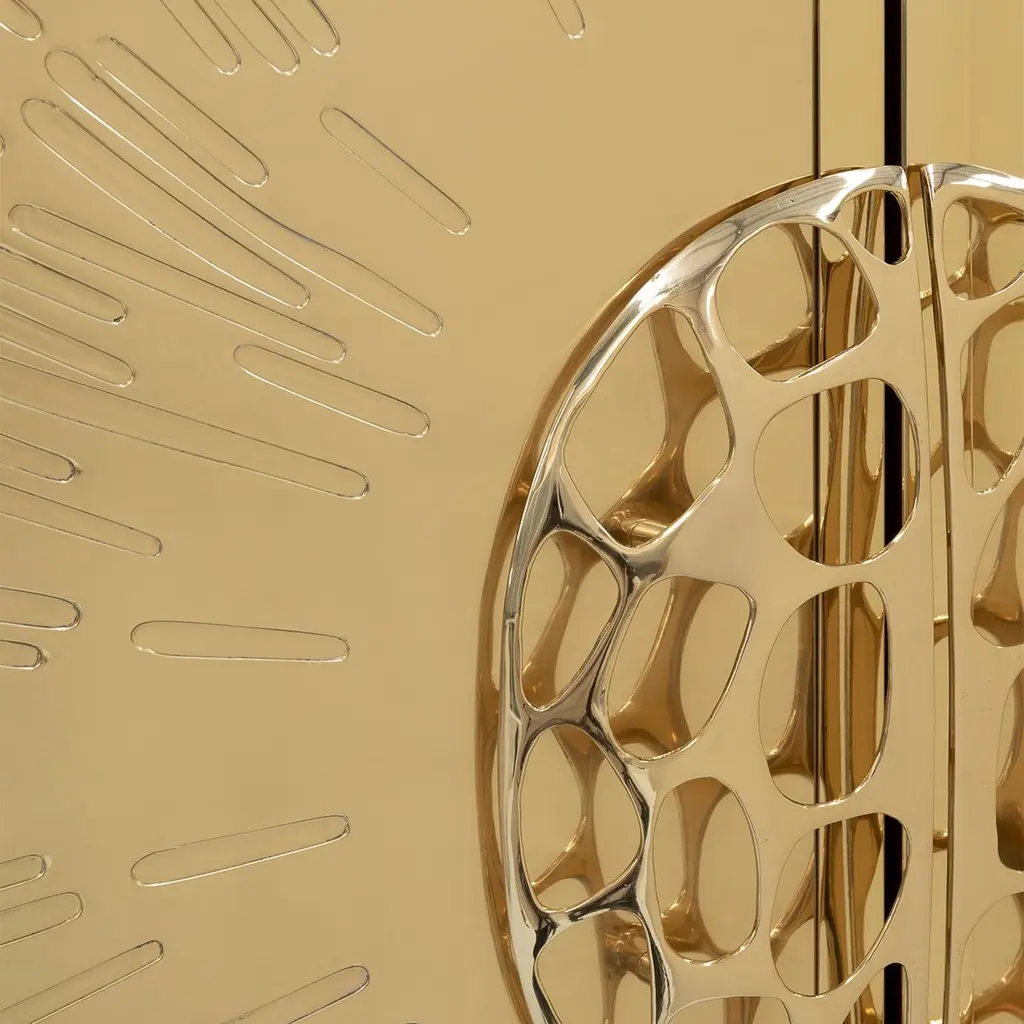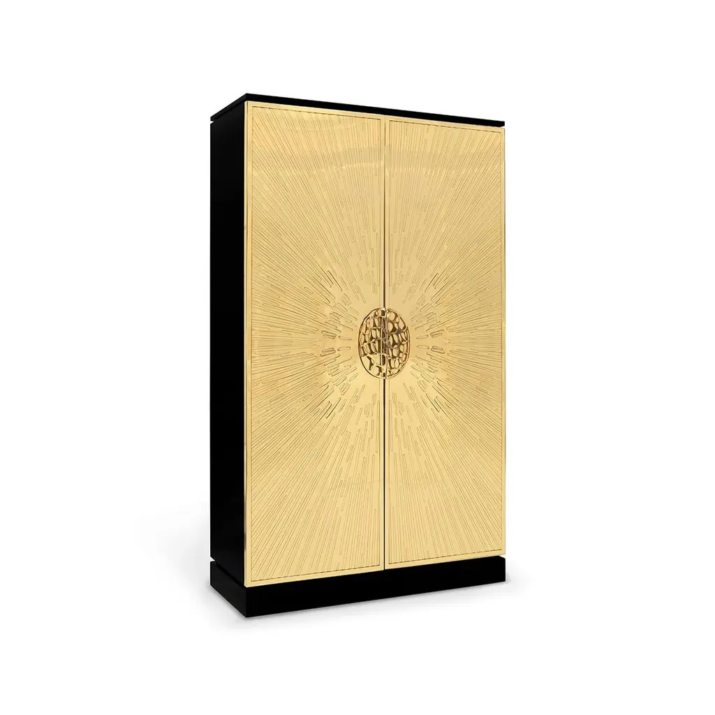 Dripping like honey with KOKET glamor, Heive is the Queen Bee of timeless black and gold cabinets. The alluring golden doors feature an exploding sunburst design enchanting you at first glance. For her majestic crowning touch, an enticing honeycomb beehive handle dares you to peek inside.