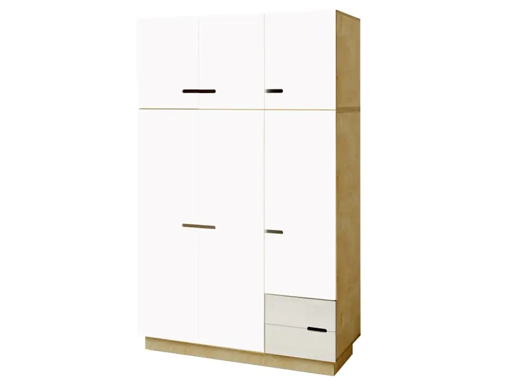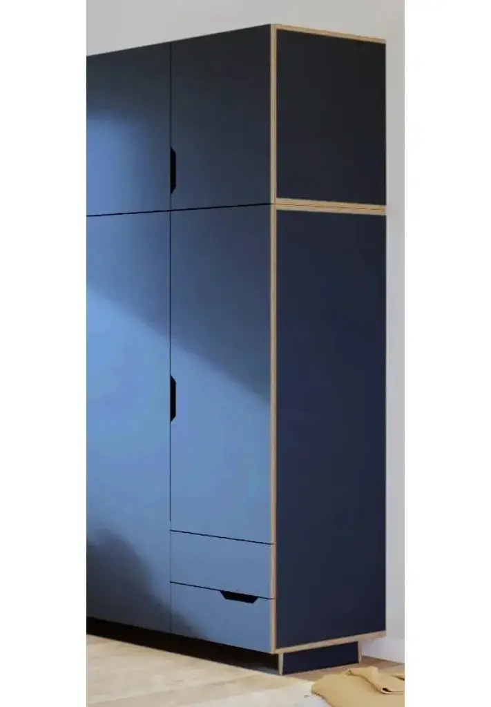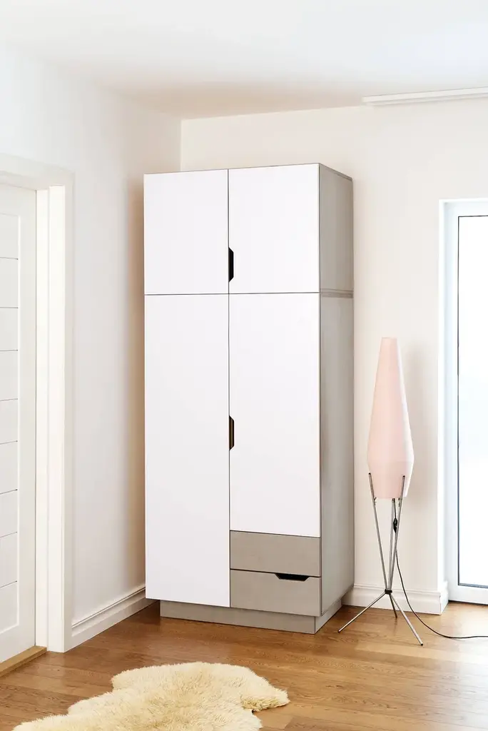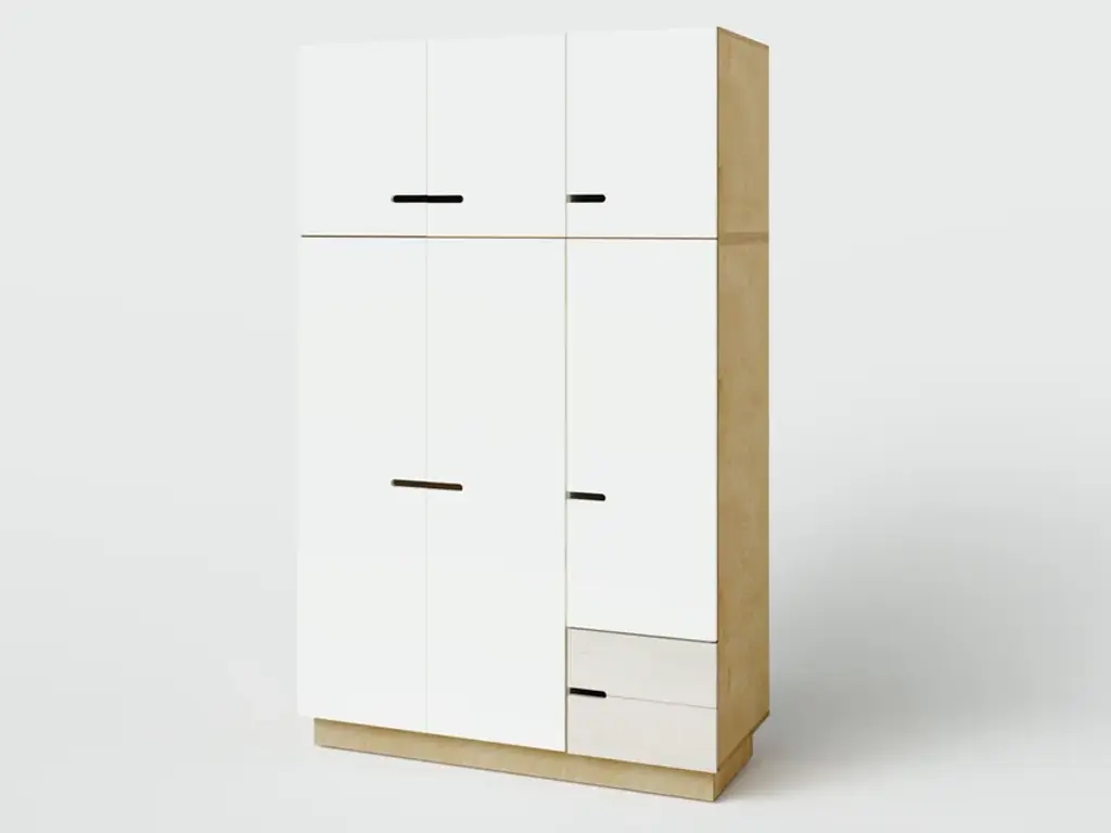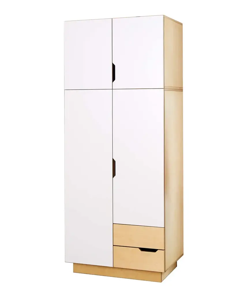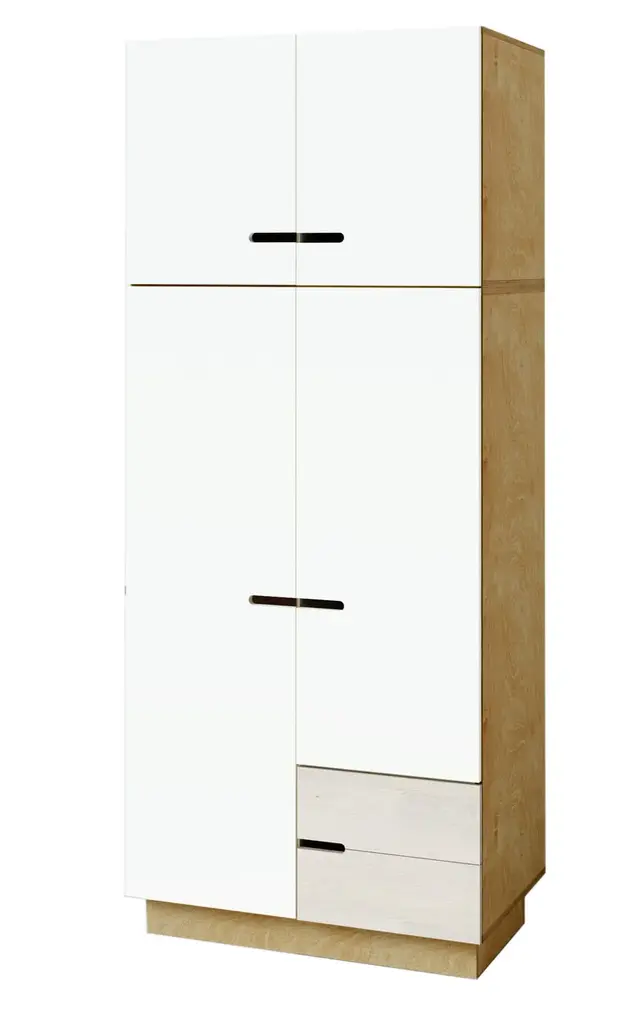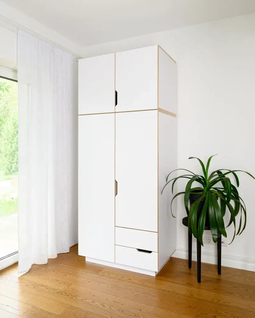 This wardrobe organises all your clothes, having space for your dresses, jackets and coats, with drawers for underwear, socks and ties.One doors hides an upper shelf and rail for hangers 41 cm long. Behind the second door there are 3 adjustable shelves and beneath them 2 large drawers. On extra level there is also an adjustable shelf.Made of birch plywood, oilwaxed. Soft close Häfele door hinges and hidden drawer rails. Doors Koskisen white CPL on plywood, Häfele metal bars inside to keep long doors straight. You can choose between two handle designs. An 8 cm high plinth that fits well with all skirting boards.In addition, it is now possible to add a 24 cm deep shelf to the wardrobe.Collection HUH was nominated for Estonian design award Bruno 2014.The HUH collection is marked by wider, oblate legs. The year 1975 is back again. People have time for books and contemplation… Choose only one – desk, night table, media stand, dining table or take them all. Play Stayin' Alive and enjoy the moment. It was nominated for Estonian design award Bruno 2014.