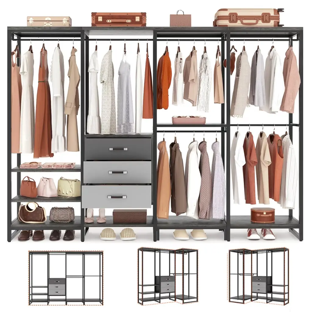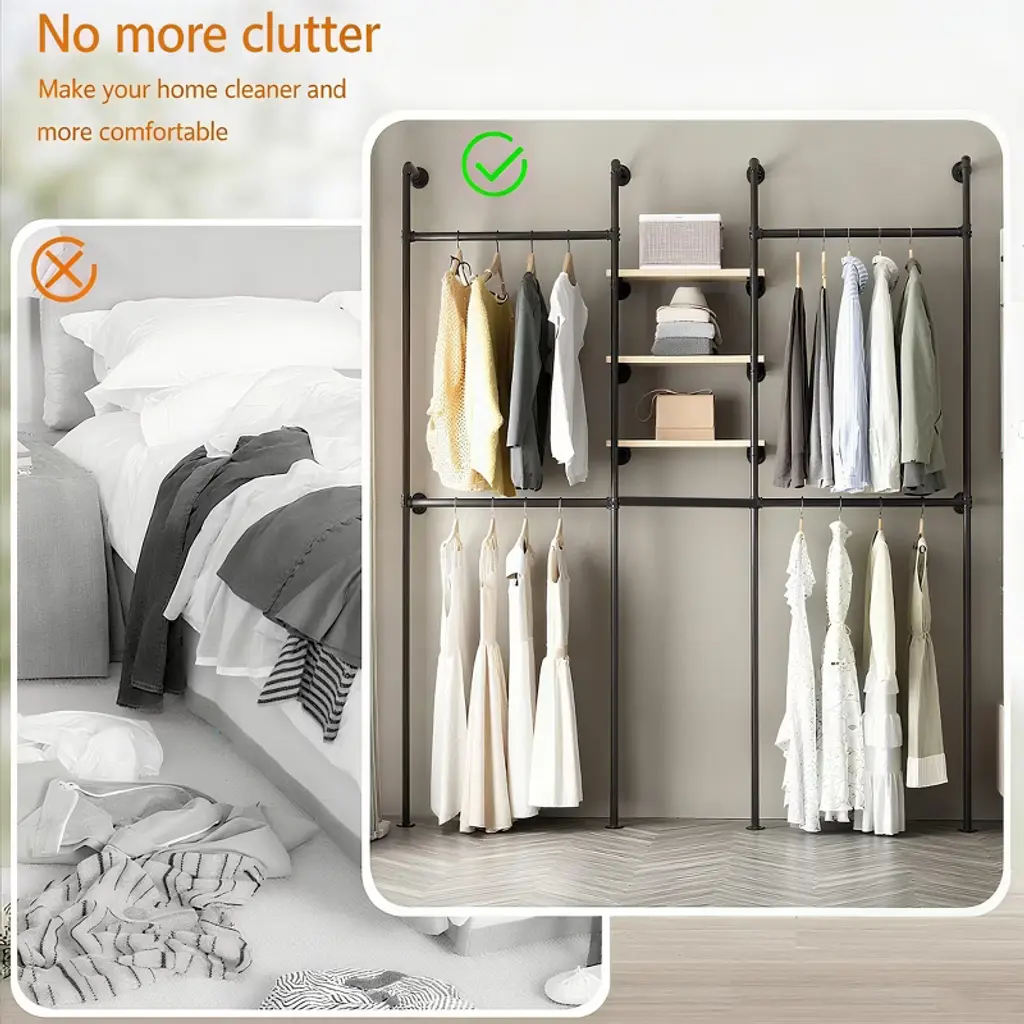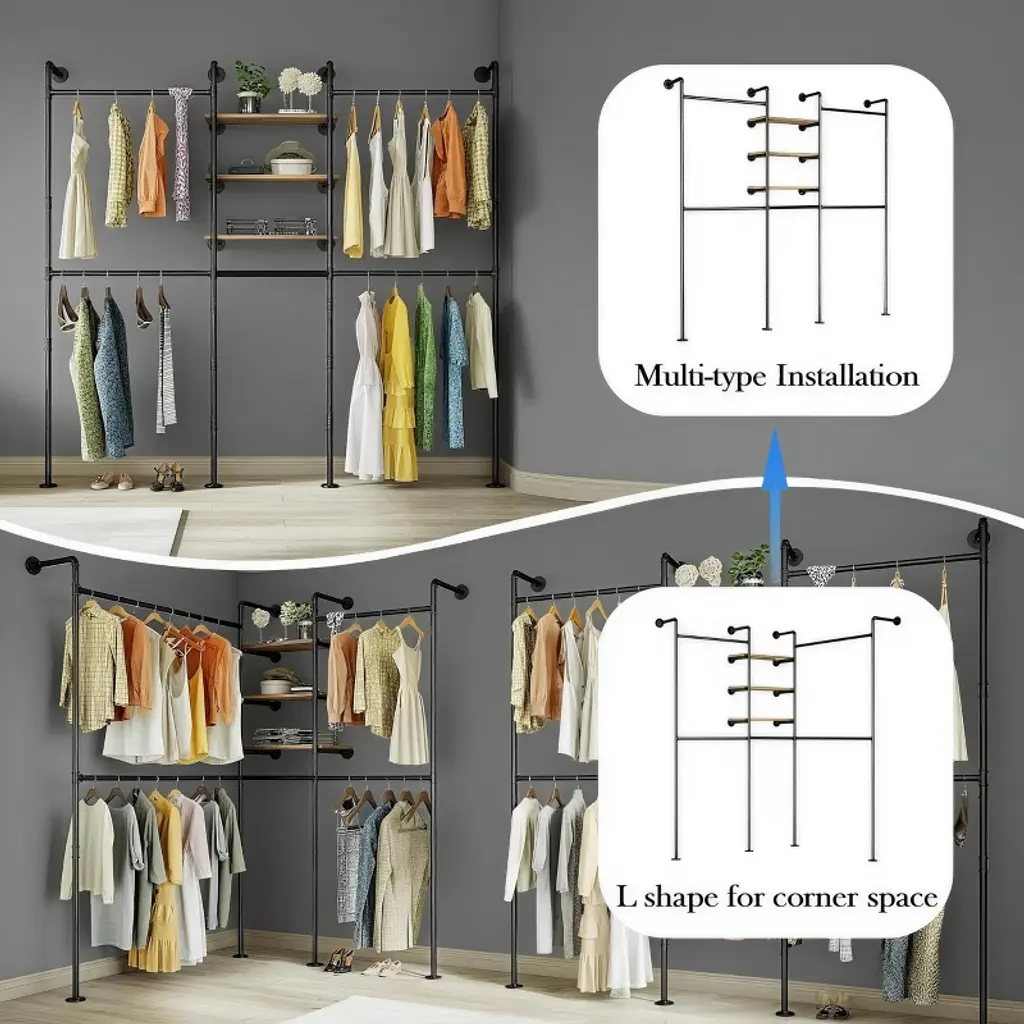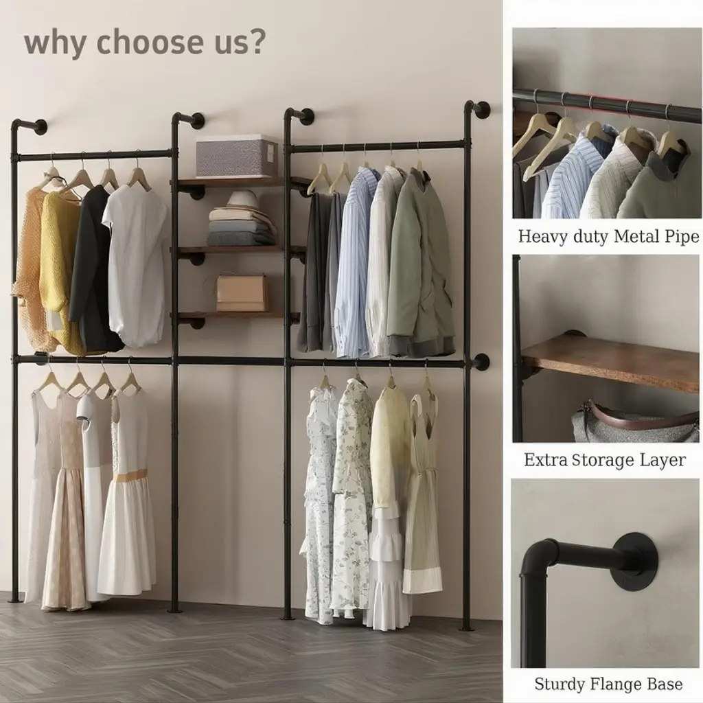 Industrial Pipe Clothing Rack with Shelves & Lights – Heavy Duty Wall Mounted Wardrobe System Need Heavy-Duty & Flexible Storage?Picture a rack that supports up to 500 lbs and has an adjustable bar to fit any garment. How much easier would organizing be with storage that adapts perfectly to your wardrobe needs?Want Style Plus Easy Installation?Think about an industrial pipe rack you can install straight or in an L-shape, complete with waterproof shelves and no-fuss assembly. How would this versatile design fit your closet or boutique? Specification:Dimension: 81.1x11.81x85.04 inchesMaterial: Iron+Wood Packing List:1xIndustrial Pipe Clothing Rack1xInstruction Manual1xAssembly Kit Note:This industrial pipe clothing rack requires assembly. Please follow the included instructions carefully and ensure you have all necessary hardware and tools before beginning.Check the maximum weight limit before hanging clothes. Avoid overloading to prevent bending or damage to the rack and wall.