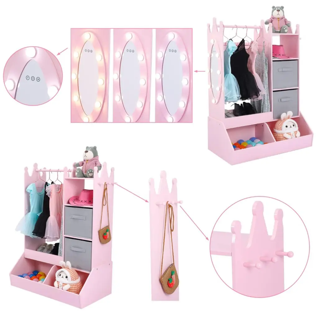 Jojoka Dress Up Storage for Girls, Kids Play Armoire with Light, Mirror, Clothing Rack and Storage Bin,Pink