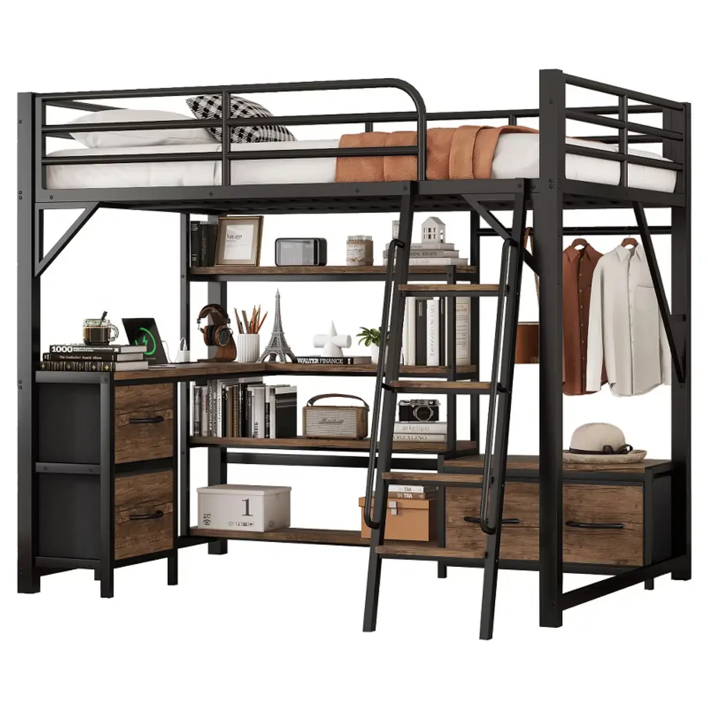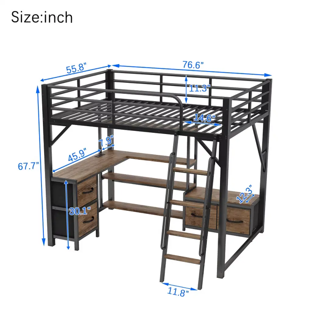 Jujabu Full Size Metal Loft Bed With Built-in Desk, Light, Shelves, Wardrobe And Drawers