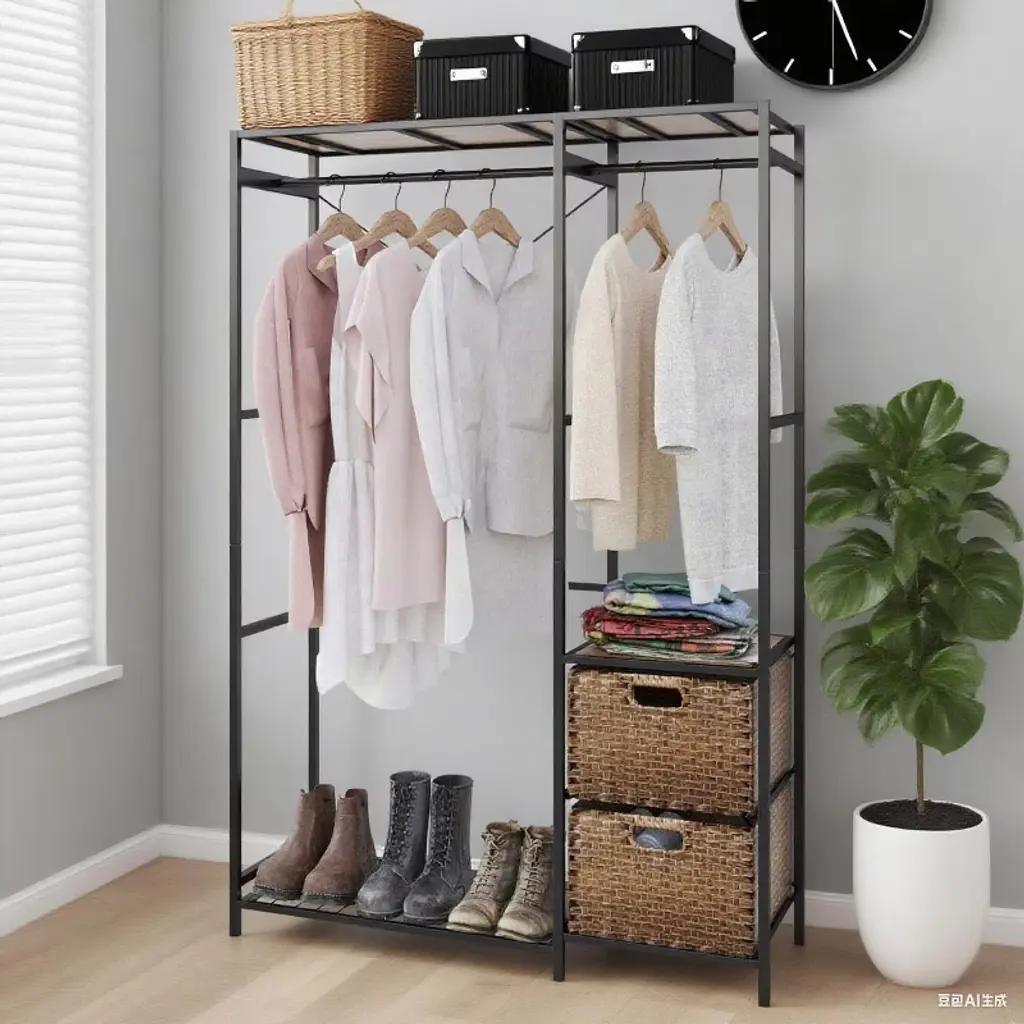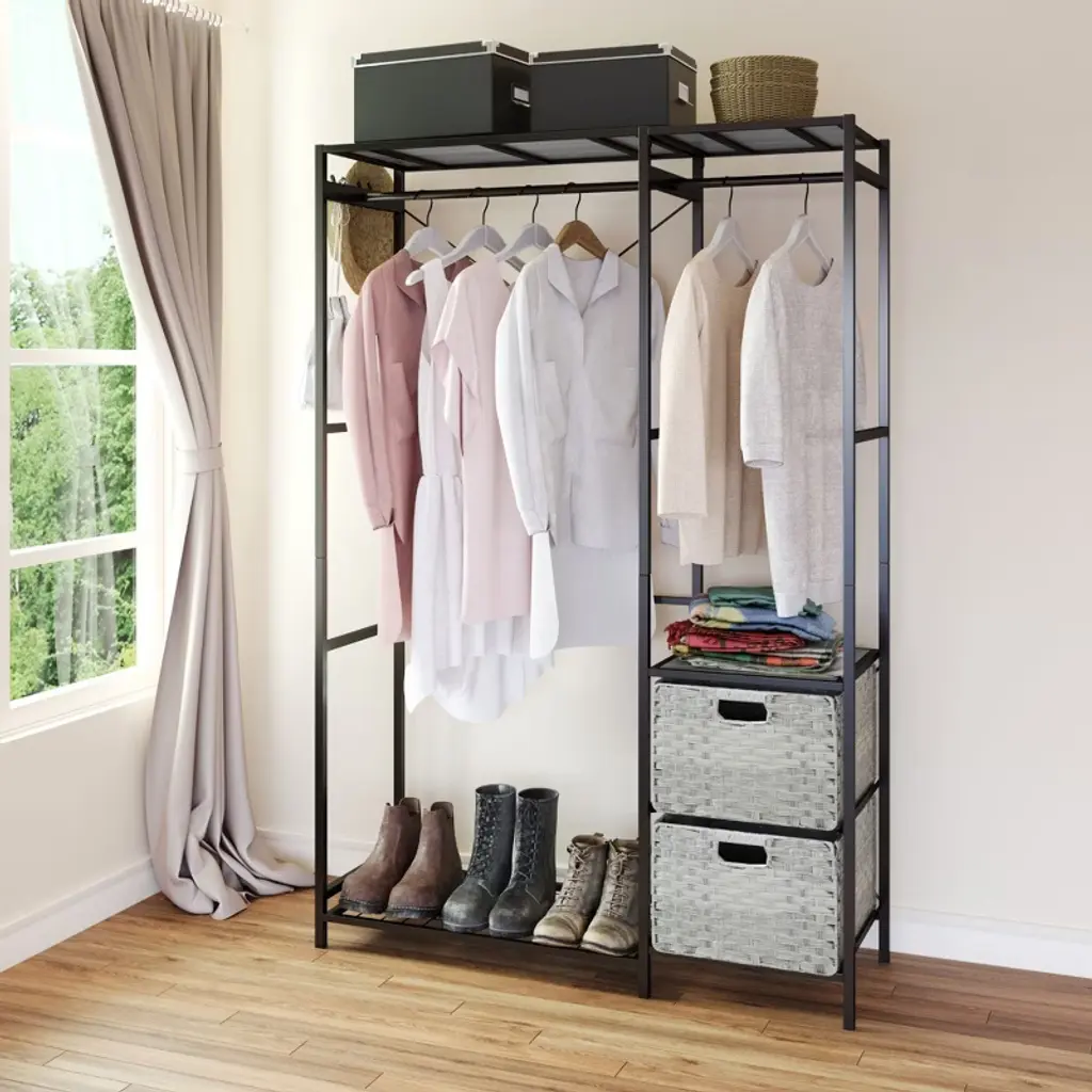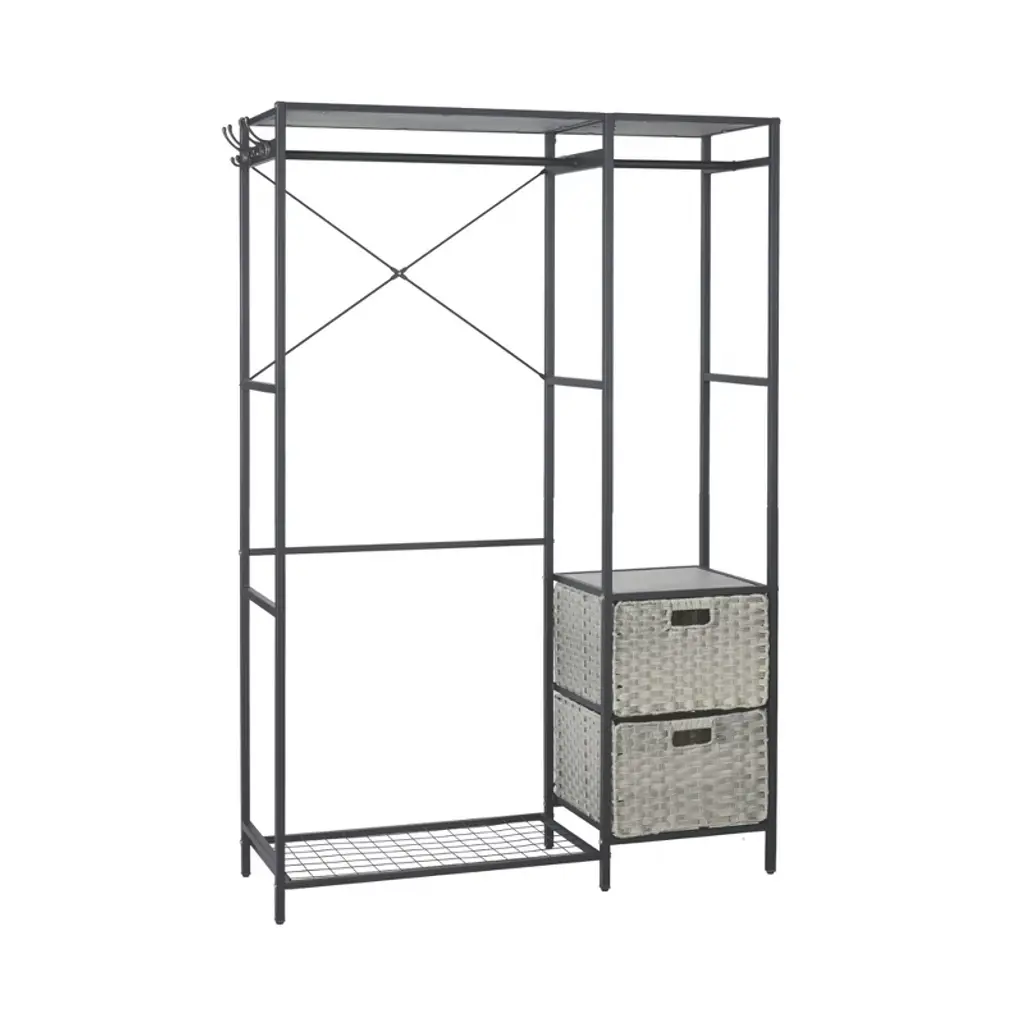 Ktmbdw Garment Racks With Shelves,2 Wicker Drawers And 4 Hooks Heavy Duty Closet Organizer For Hanging Clothes,freestanding Closet Wardrobe Rack,gray