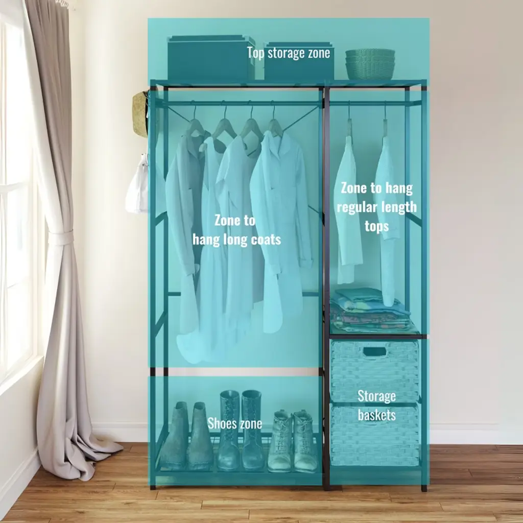 Creating extra storage in small spaces is effortless with this freestanding clothes rack. Designed as a perfect closet organizer system, it maximizes space for your clothes, shoes, handbags, and even luggage. Ideal for narrow corners, bedrooms, or closets, this rack blends practicality with style.